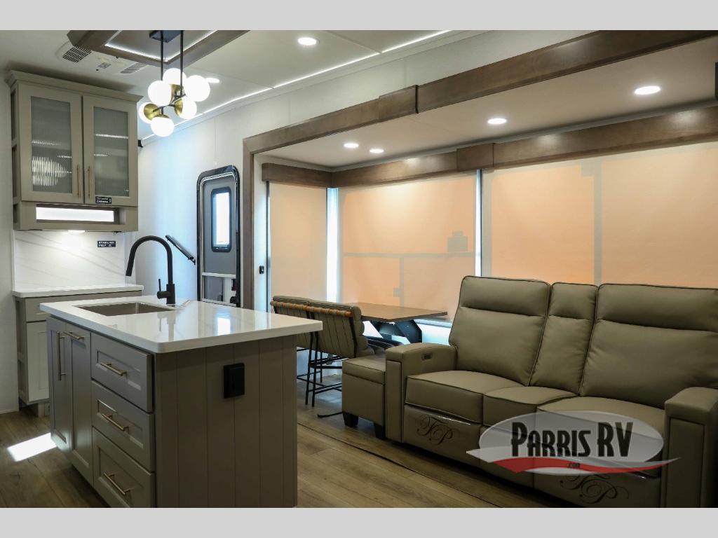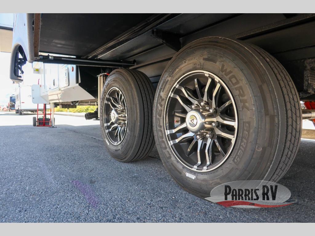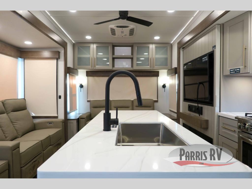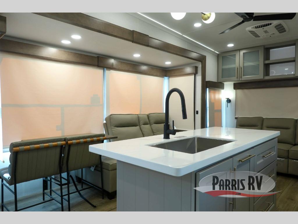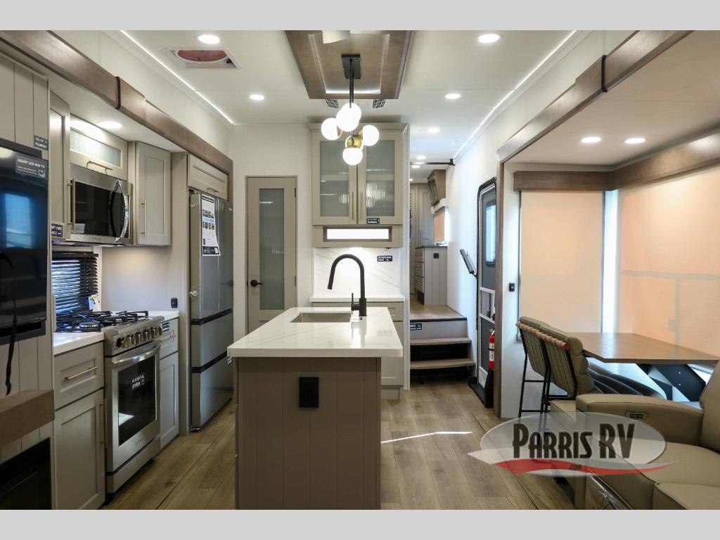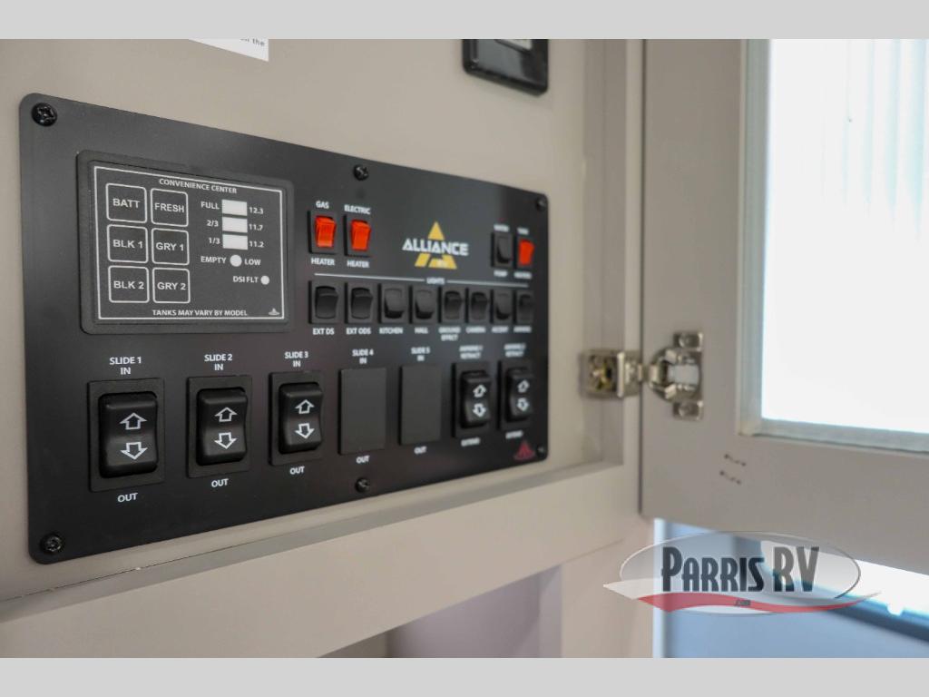 The Paradigm fifth wheels by Alliance RV are functional, high-quality, and luxurious for an unforgettable camping experience. There are three A/C units and a 40K BTU furnace to keep you comfortable year around, and you'll appreciate additional convenient amenities, like the all-in-one enclosed/heated utility center and the color coded and numbered wiring. A Helux Series coil spring pin box comes standard for hassle-free towing, along with Super-G 4,400 lb. rated tires and Dexter 7,000 lb. axles. You'll love the kitchen with its LG solid surface countertops and Lusso range, plus there is LED motion lighting in the pantry and a Maxx fan with a rain sensor to keep everything fresh when making dinner. Each model also includes an HD Smart TV in the living room and bedroom, plus a Winegard Air 360 antenna to keep you connected to the outside world. And of course there are a variety of options you can choose from to further customize your fifth wheel; dual pane windows, Super Solar Plus, slide out awning toppers, and generator prep or a generator to name a few!