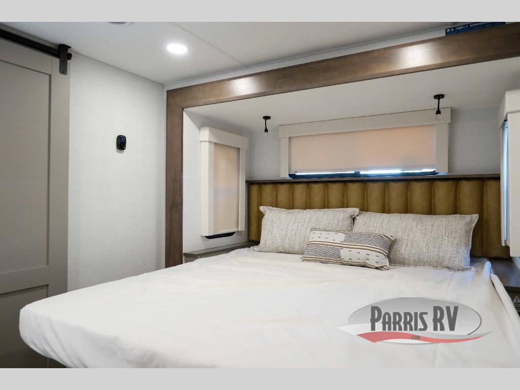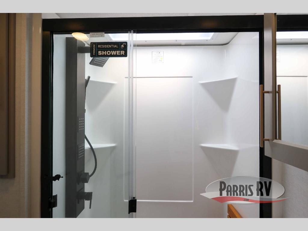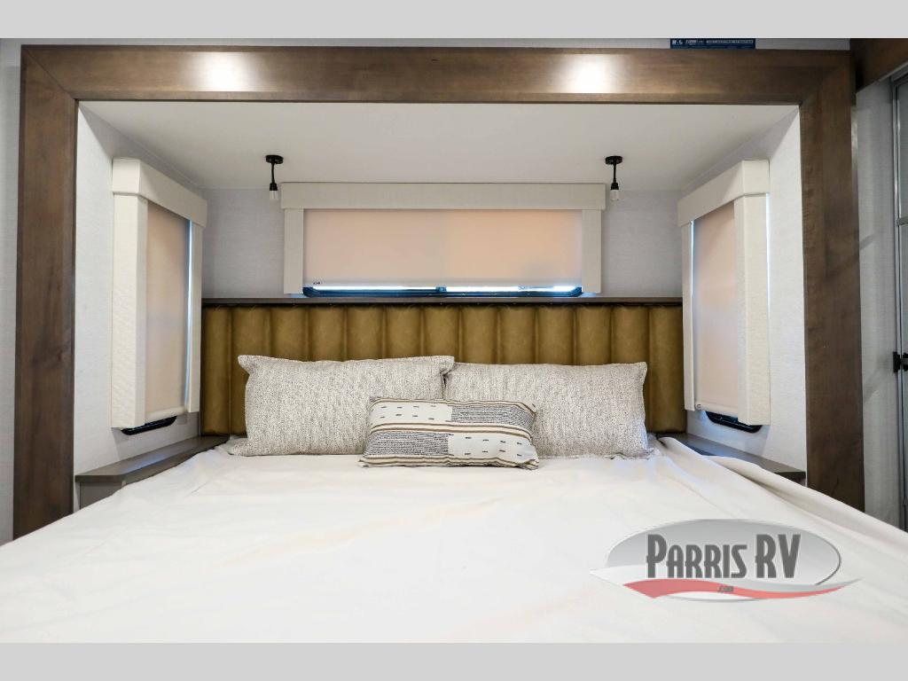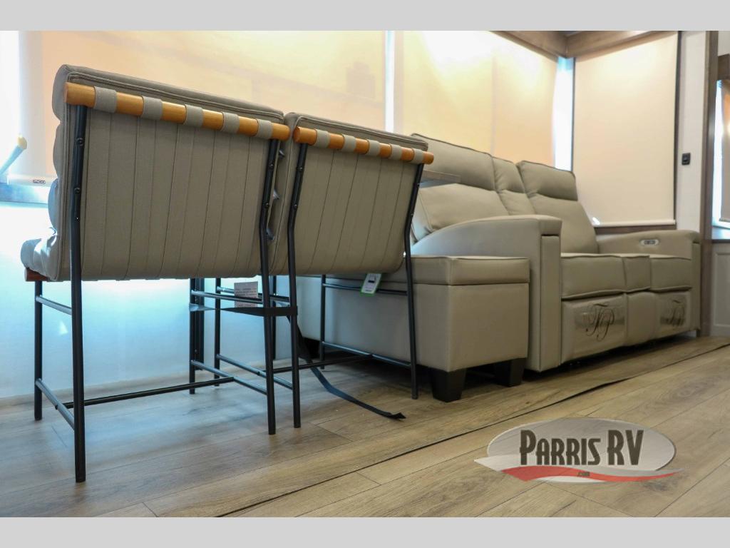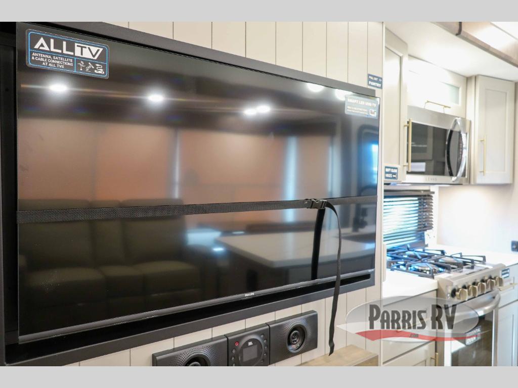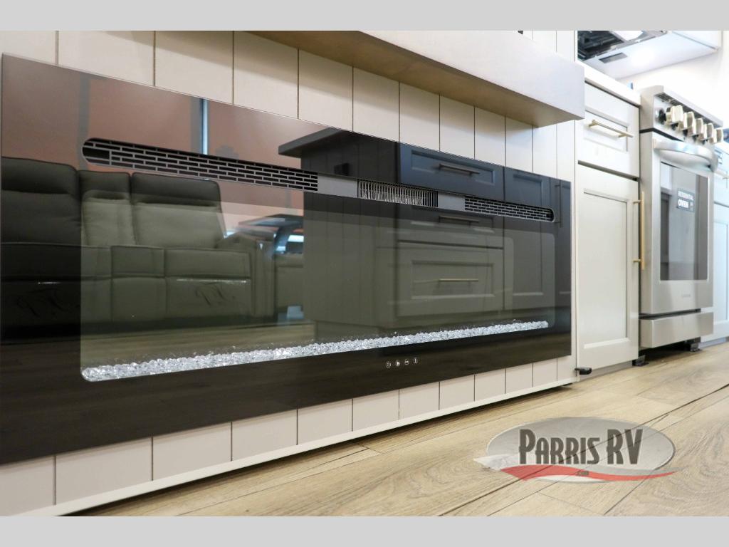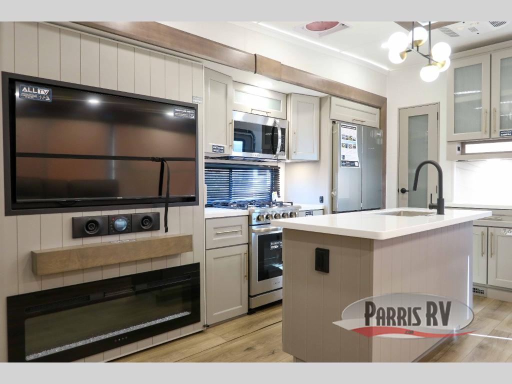 Search for the best views, the nicest RV park, or a place you haven't seen for years with this Paradigm in tow! There is a king bed slide in the master bedroom, a Smart TV, and a dresser with flip-up hidden storage for your belongings. The full bathroom offers a large residential shower, a porcelain toilet with a soft close seat, and storage for your linens, while the kitchen gives you two pantries, an island with a large undermount single basin sink and dishwasher prep if you want the option for easy clean up. You will also have a residential microwave and range, plus a 3.73 cu. ft. oven to make meals. When you're ready to relax for the evening, head to the rear living area to enjoy the dual recliner love seat across from the 50" Smart TV and fireplace!