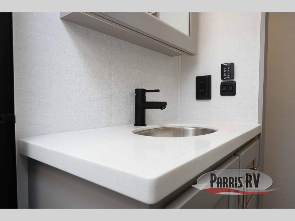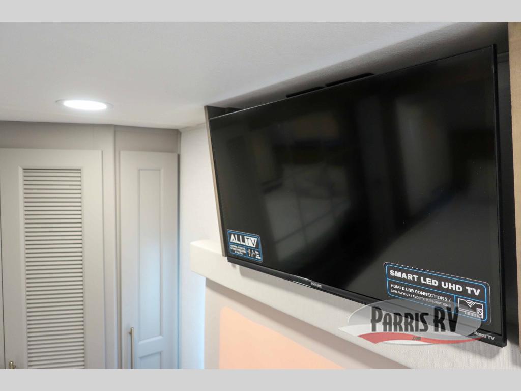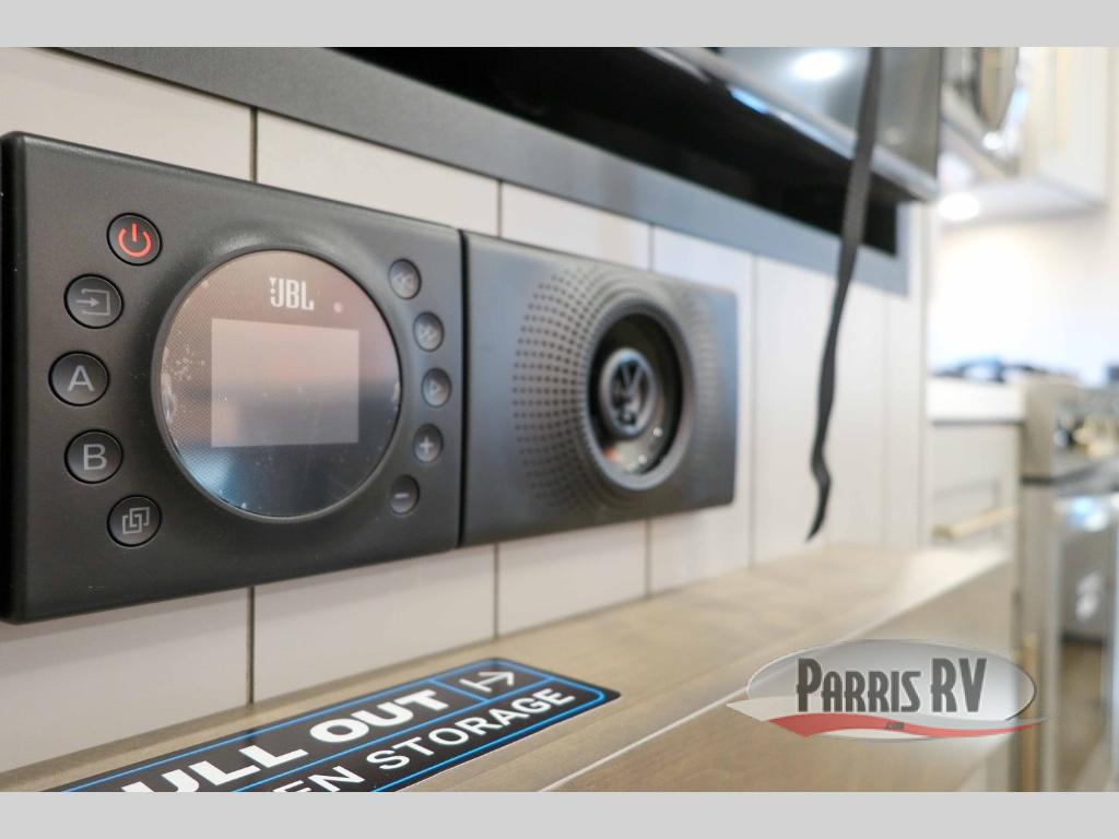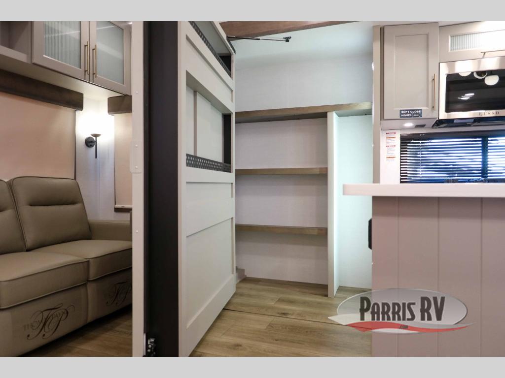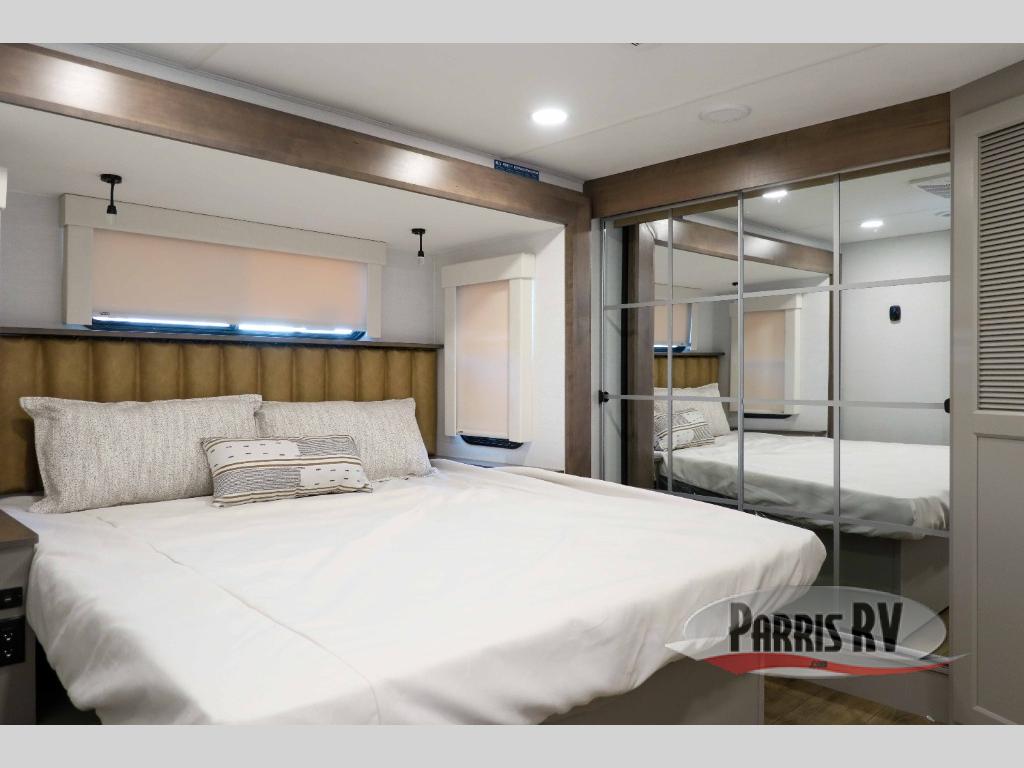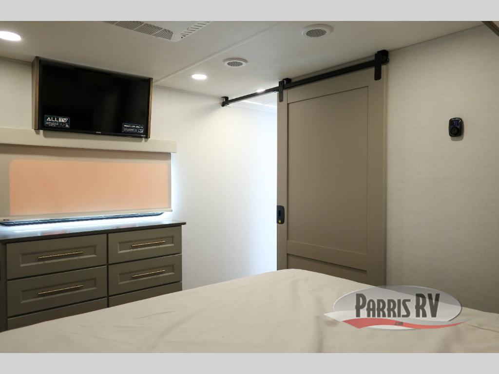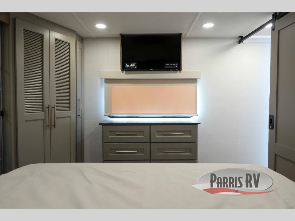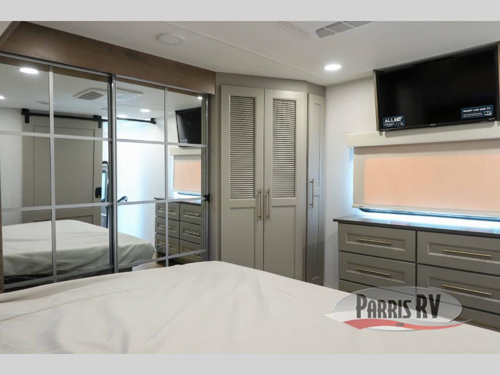 Search for the best views, the nicest RV park, or a place you haven't seen for years with this Paradigm in tow! There is a king bed slide in the master bedroom, a Smart TV, and a dresser with flip-up hidden storage for your belongings. The full bathroom offers a large residential shower, a porcelain toilet with a soft close seat, and storage for your linens, while the kitchen gives you two pantries, an island with a large undermount single basin sink and dishwasher prep if you want the option for easy clean up. You will also have a residential microwave and range, plus a 3.73 cu. ft. oven to make meals. When you're ready to relax for the evening, head to the rear living area to enjoy the dual recliner love seat across from the 50" Smart TV and fireplace!