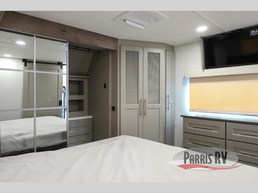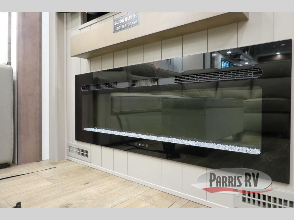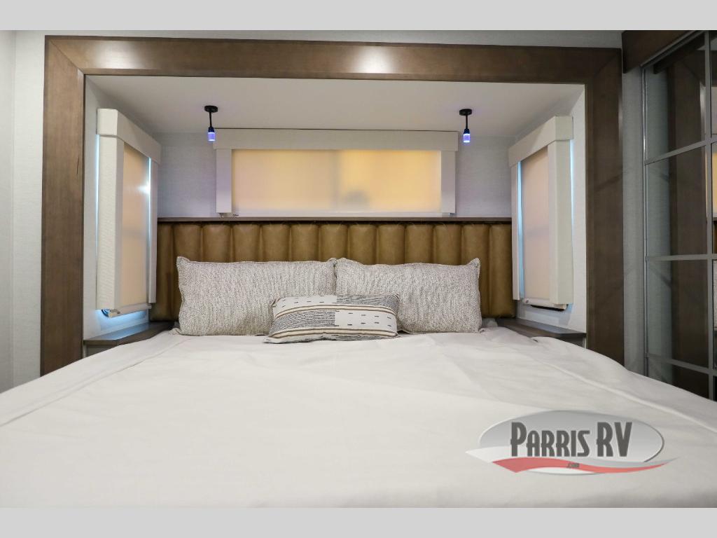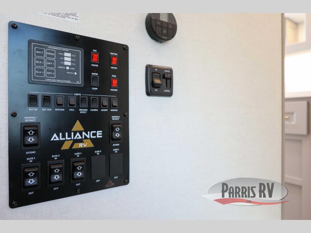 The Paradigm fifth wheels by Alliance RV are functional, high-quality, and luxurious for an unforgettable camping experience. There are three A/C units and a 40K BTU furnace to keep you comfortable year around, and you'll appreciate additional convenient amenities, like the all-in-one enclosed/heated utility center and the color coded and numbered wiring. A Helux Series coil spring pin box comes standard for hassle-free towing, along with Curt 8,000 lb. axles. You'll love the kitchen with its LG solid surface countertops and Lusso range, plus there is LED motion lighting in the pantry and a Maxx fan with a rain sensor to keep everything fresh when making dinner. Each model also includes an HD Smart TV in the living room and bedroom. And of course there are a variety of options you can choose from to further customize your fifth wheel; dual pane windows, Super Solar Plus, slide out awning toppers, and generator prep or a generator to name a few!