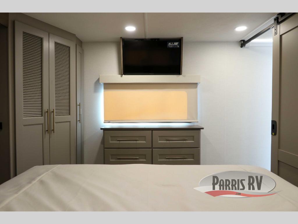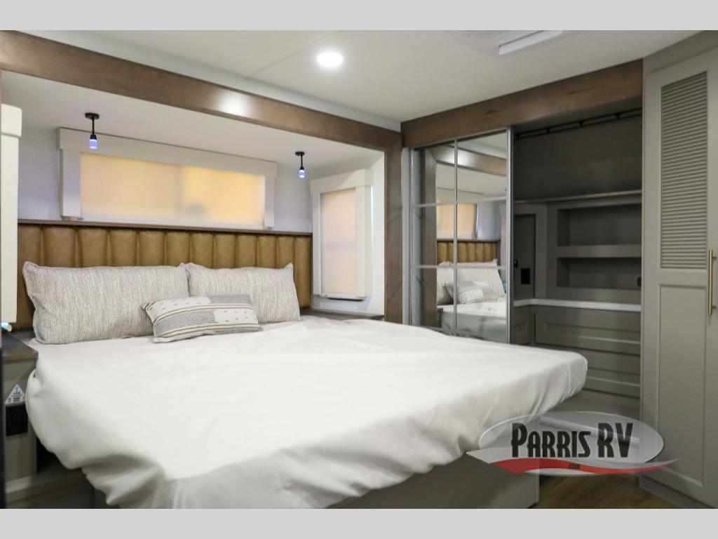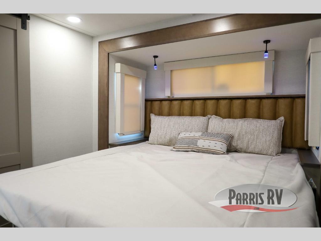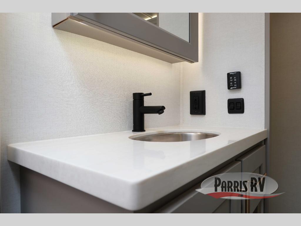 The Paradigm fifth wheels by Alliance RV are functional, high-quality, and luxurious for an unforgettable camping experience. There are three A/C units and a 40K BTU furnace to keep you comfortable year around, and you'll appreciate additional convenient amenities, like the all-in-one enclosed/heated utility center and the color coded and numbered wiring. A Helux Series coil spring pin box comes standard for hassle-free towing, along with Curt 8,000 lb. axles. You'll love the kitchen with its LG solid surface countertops and Lusso range, plus there is LED motion lighting in the pantry and a Maxx fan with a rain sensor to keep everything fresh when making dinner. Each model also includes an HD Smart TV in the living room and bedroom. And of course there are a variety of options you can choose from to further customize your fifth wheel; dual pane windows, Super Solar Plus, slide out awning toppers, and generator prep or a generator to name a few!