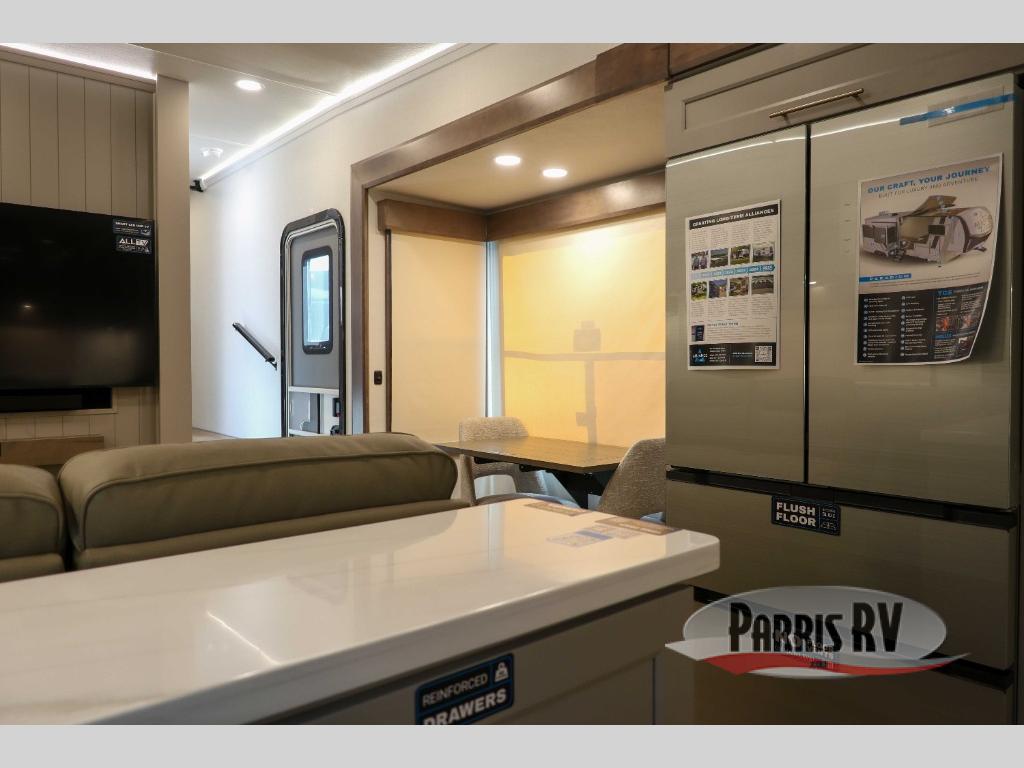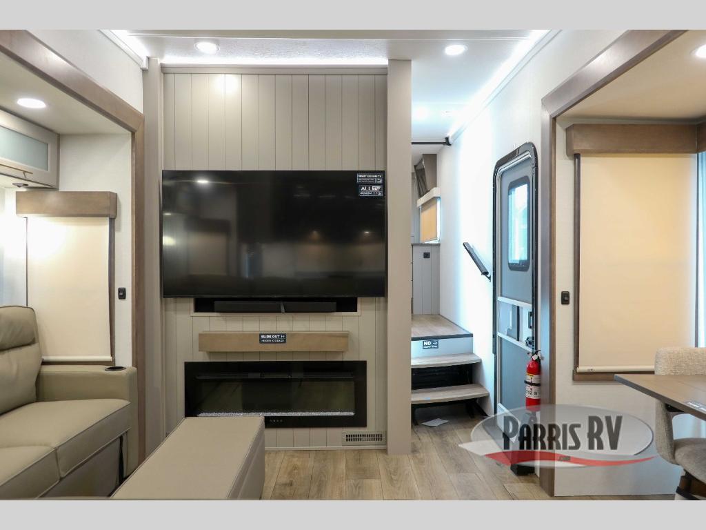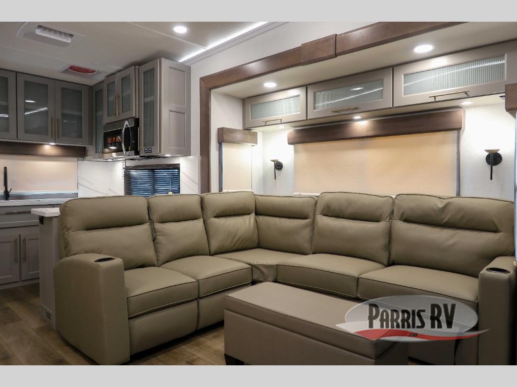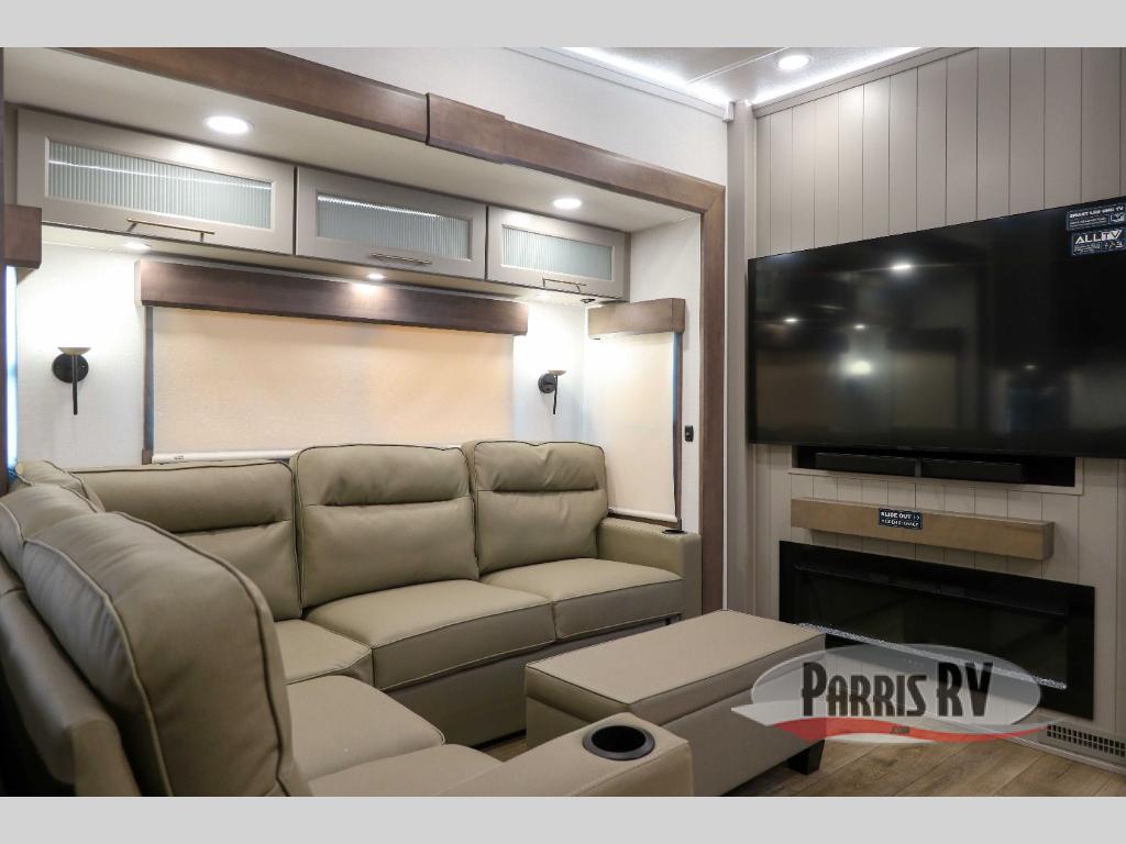 Escape the ordinary and experience the ultimate in luxury travel with this stunning fifth wheel! The rear kitchen is the heart of this fifth wheel, featuring a spacious pantry, 12V refrigerator, microwave, and overhead cabinets. Prepare delicious meals with ease and enjoy the convenience of a fully-equipped kitchen. Unwind in the spacious living area, featuring a plush trifold sofa, L-shape sofa, and a dual recliner love seat. Gather around the turntable dinette or relax in front of the stunning 65” TV. The full bathroom provides a serene space for personal care, while the front bedroom is a peaceful retreat with a comfortable queen bed and a flip-top dresser. Enjoy your favorite shows on the smart TV, perfect for relaxing after a day of adventure.
