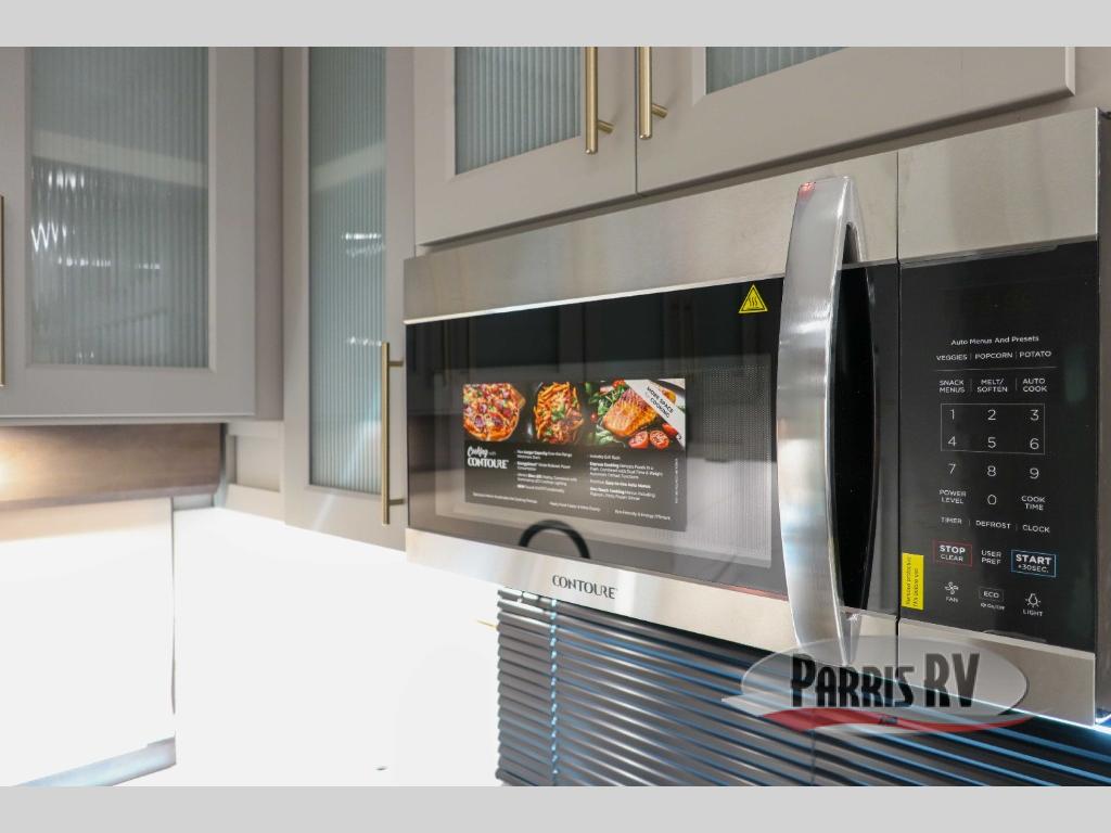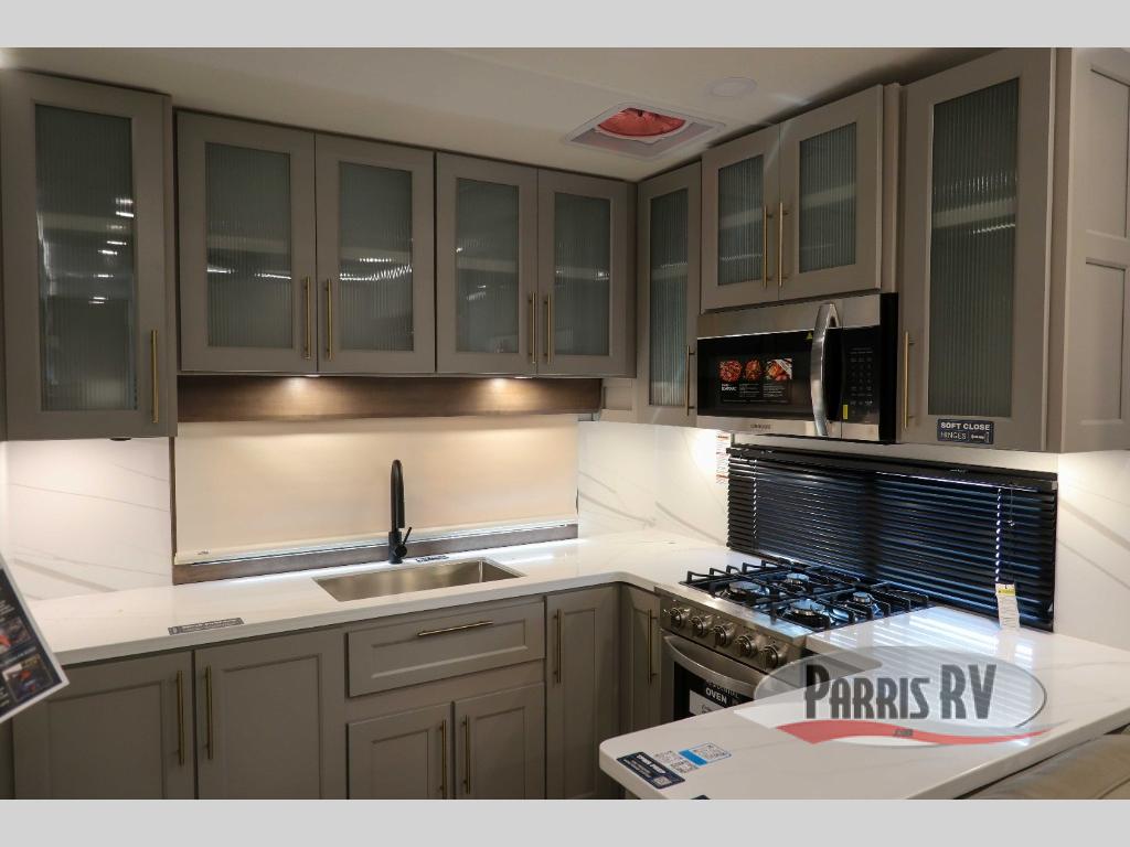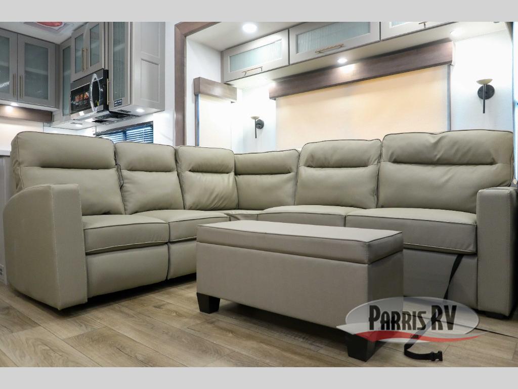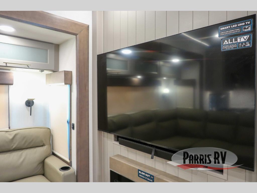 Escape the ordinary and experience the ultimate in luxury travel with this stunning fifth wheel! The rear kitchen is the heart of this fifth wheel, featuring a spacious pantry, 12V refrigerator, microwave, and overhead cabinets. Prepare delicious meals with ease and enjoy the convenience of a fully-equipped kitchen. Unwind in the spacious living area, featuring a plush trifold sofa, L-shape sofa, and a dual recliner love seat. Gather around the turntable dinette or relax in front of the stunning 65” TV. The full bathroom provides a serene space for personal care, while the front bedroom is a peaceful retreat with a comfortable queen bed and a flip-top dresser. Enjoy your favorite shows on the smart TV, perfect for relaxing after a day of adventure.