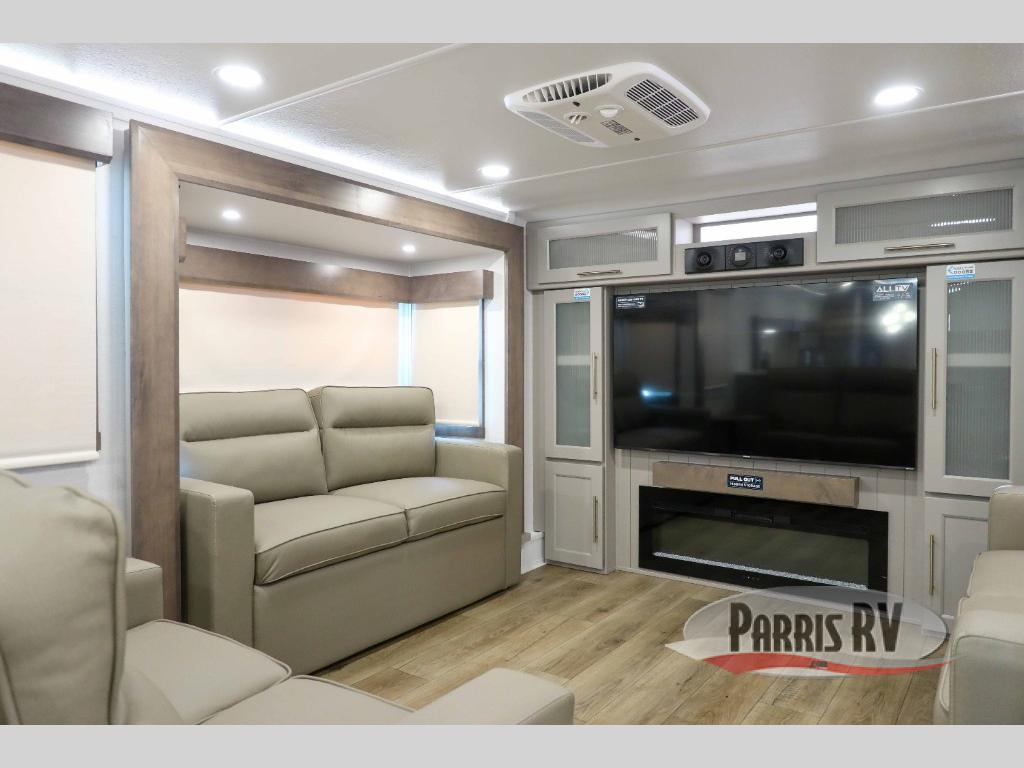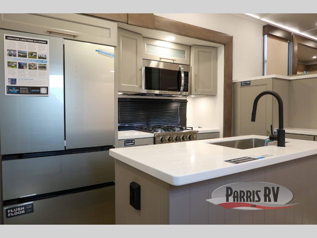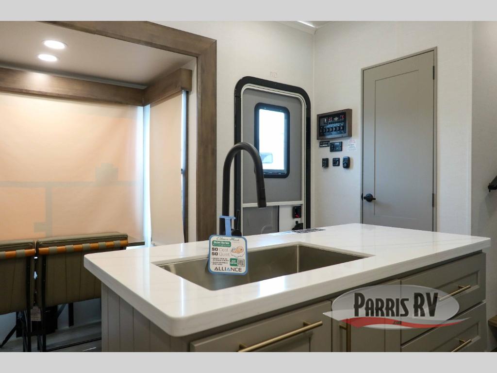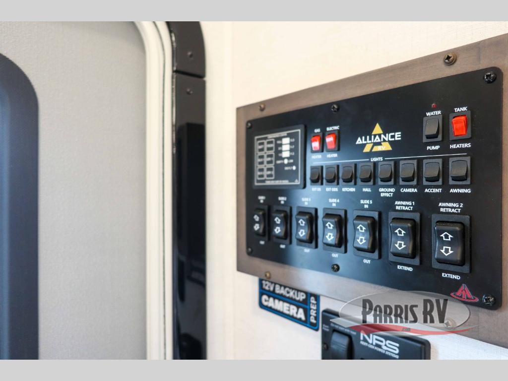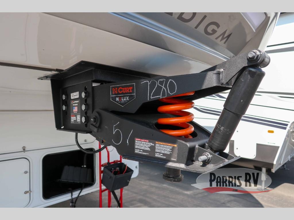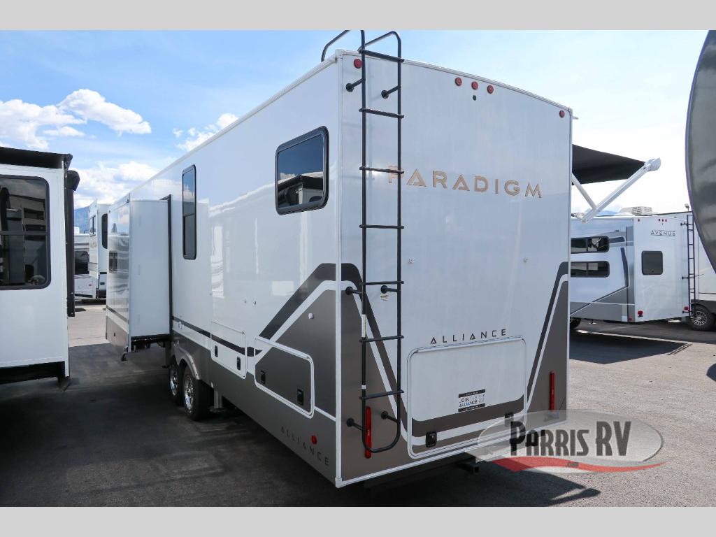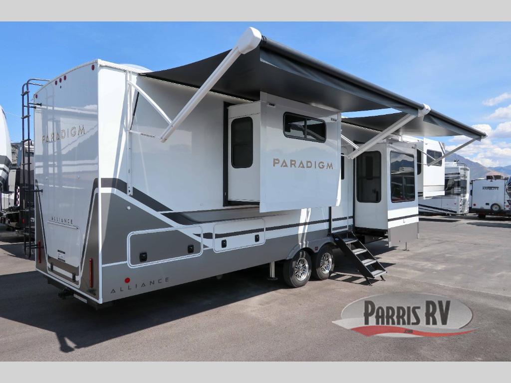 The Paradigm fifth wheels by Alliance RV are functional, high-quality, and luxurious for an unforgettable camping experience. There are three A/C units and a 40K BTU furnace to keep you comfortable year around, and you'll appreciate additional convenient amenities, like the all-in-one enclosed/heated utility center and the color coded and numbered wiring. A Helux Series coil spring pin box comes standard for hassle-free towing, along with Super-G 4,400 lb. rated tires and Dexter 7,000 lb. axles. You'll love the kitchen with its LG solid surface countertops and Lusso range, plus there is LED motion lighting in the pantry and a Maxx fan with a rain sensor to keep everything fresh when making dinner. Each model also includes an HD Smart TV in the living room and bedroom, plus a Winegard Air 360 antenna to keep you connected to the outside world. And of course there are a variety of options you can choose from to further customize your fifth wheel; dual pane windows, Super Solar Plus, slide out awning toppers, and generator prep or a generator to name a few!