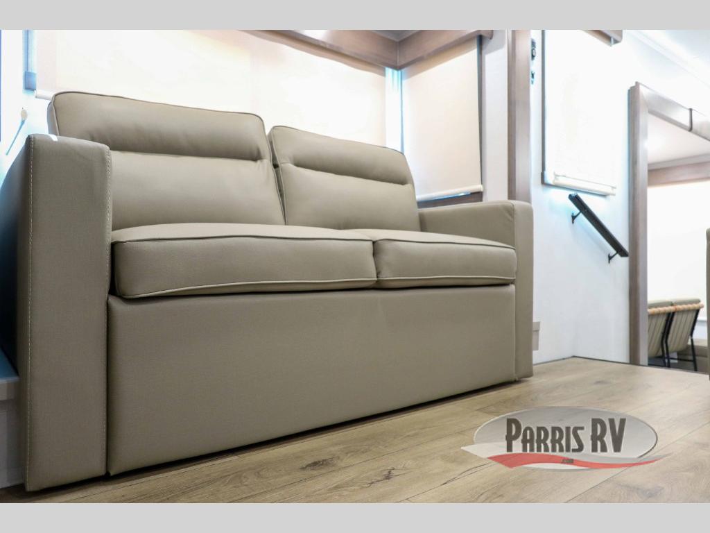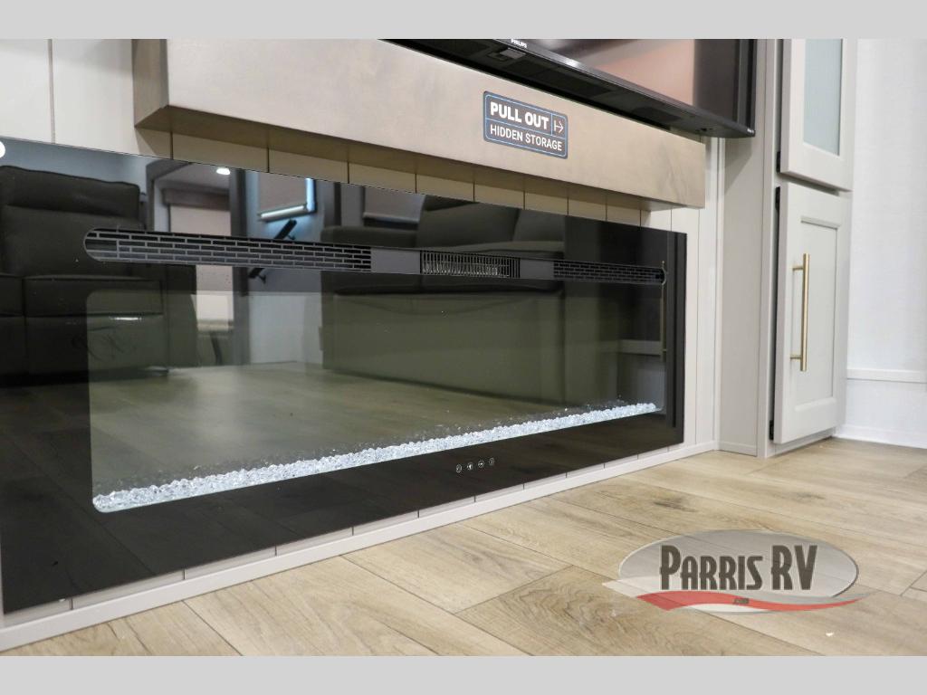 An active family will want this fifth wheel with its 48" x 115" exterior basement pull-out tray for kayaks or extra storage. Just above this area is the master suite with a rear bathroom that offers a residential shower, a porcelain toilet with soft close seat, plus a wardrobe and shelf storage. The king bed slide gives you more floor space, and you will have a seat, a flip-top dresser, and a Smart TV to watch movies in bed. The half bath is next to the main entry which is super convenient, and the middle kitchen is separate from the front living area. The cook will love the residential microwave, range and oven, plus the 19 cu. ft. 12 volt residential refrigerator. There is also a pantry and extra counter space on the kitchen island with a large sink. The views out of the atrium windows in the slide out, which includes the swivel table and desk, are a must see. And when you need to watch the big game, the 55" Smart TV with a pull-out fireplace storage are up front with the dual recliner love seat and two sleeper sofas.