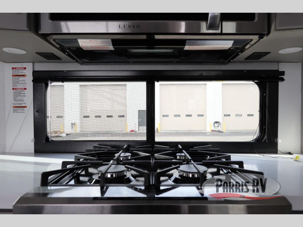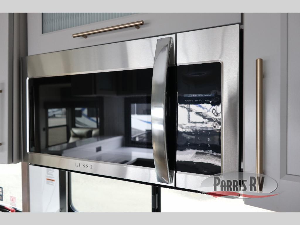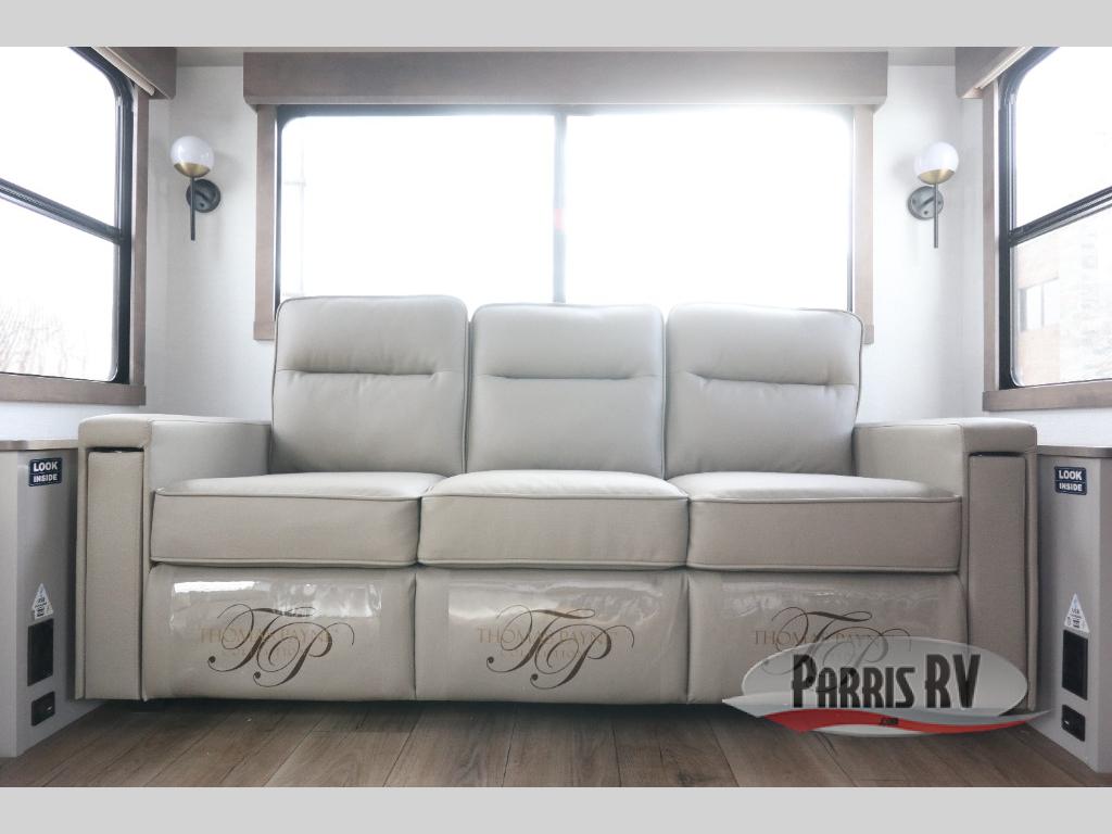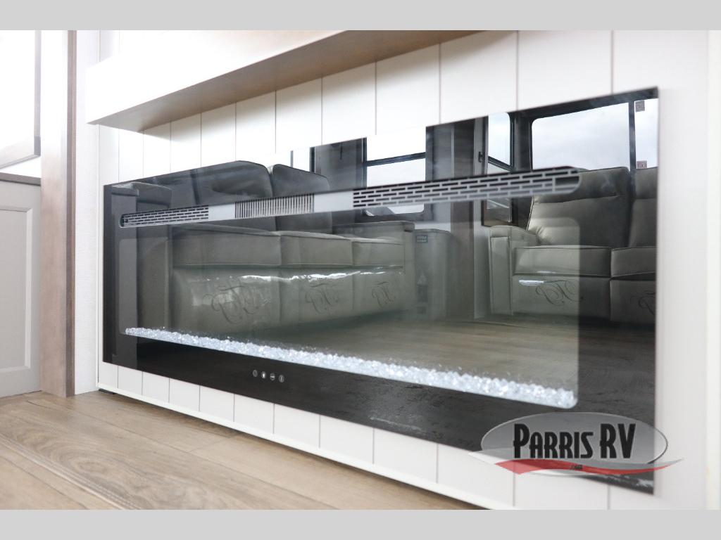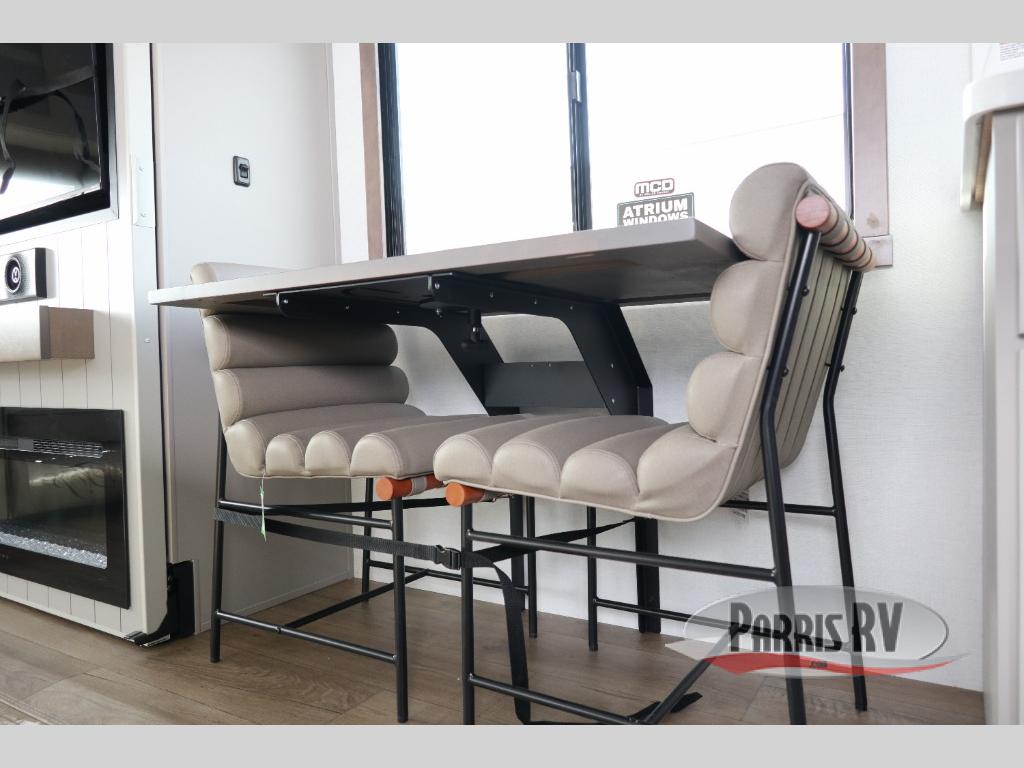 You will fall in love with this unit’s slide patio with picture window, the perfect spot to take in the breathtaking views. Enjoy outdoor cooking with the countertop prep area and pull-out grill, while the drop-down TV provides entertainment for all. Inside, rear living area features two sleeper sofas, perfect for lounging and relaxing. Overhead cabinets provide ample storage, while the 50” class smart TV offers endless entertainment options. Gather around the turn table dinette for meals or socializing. The kitchen is fully equipped with a microwave, sink, refrigerator, pantry, and hutch, making meal preparation and storage a breeze. Also this unit has a full bathroom and a cozy front bedroom which boast a king bed, ample closet, a TV, and so much more!