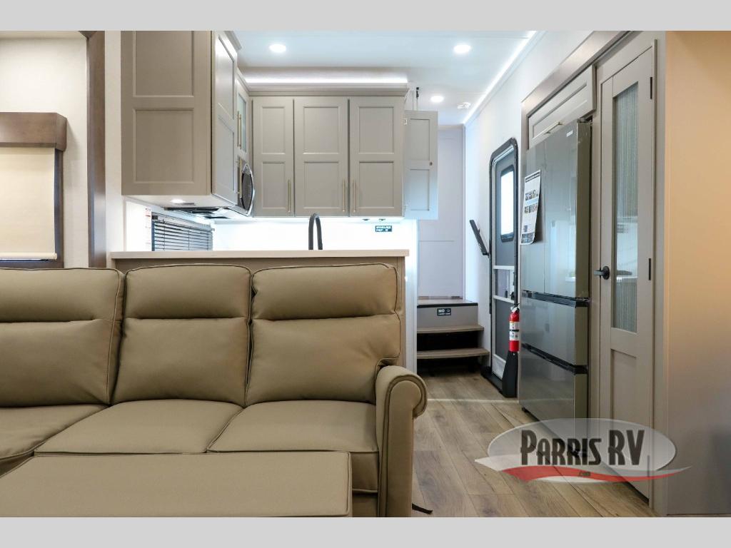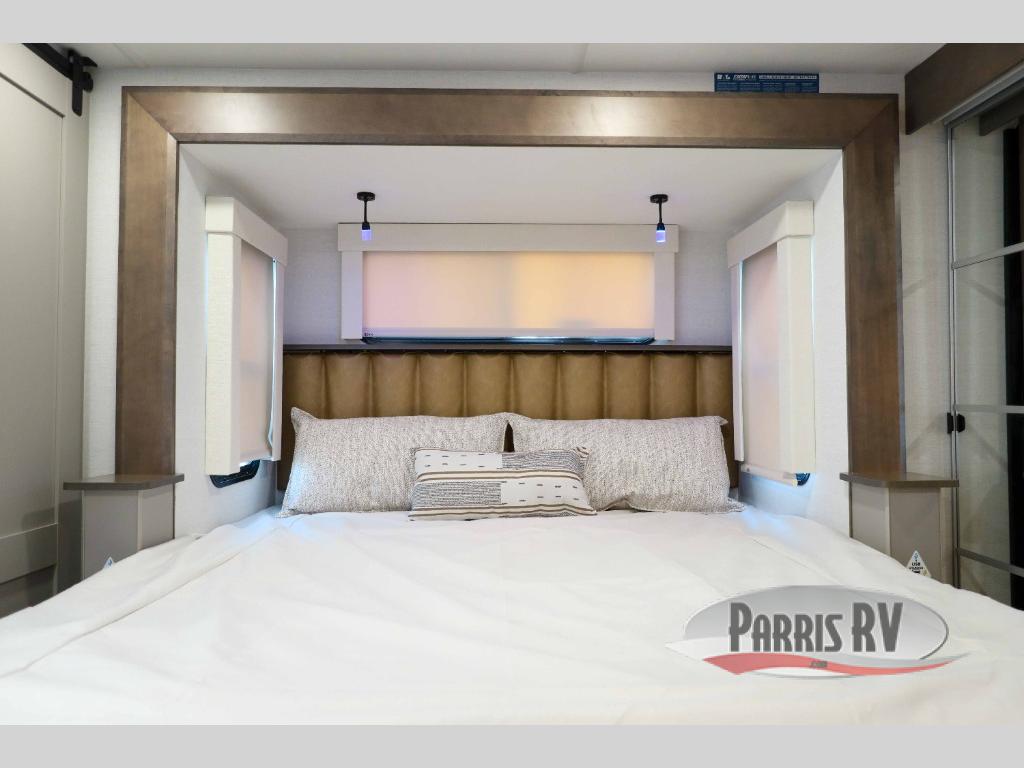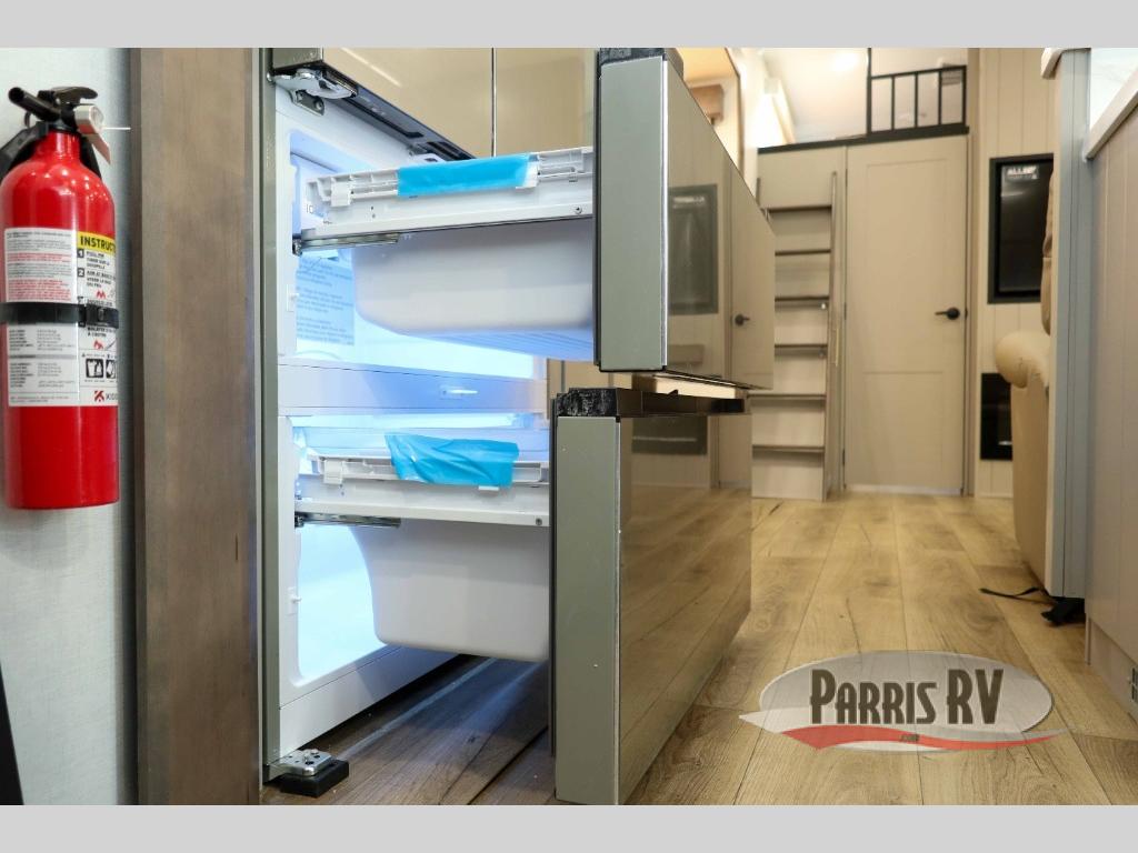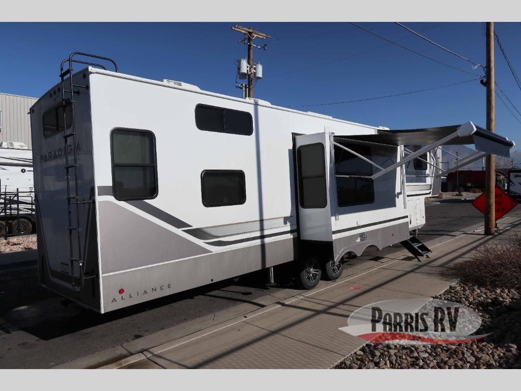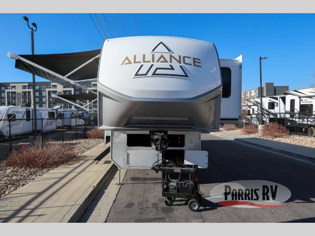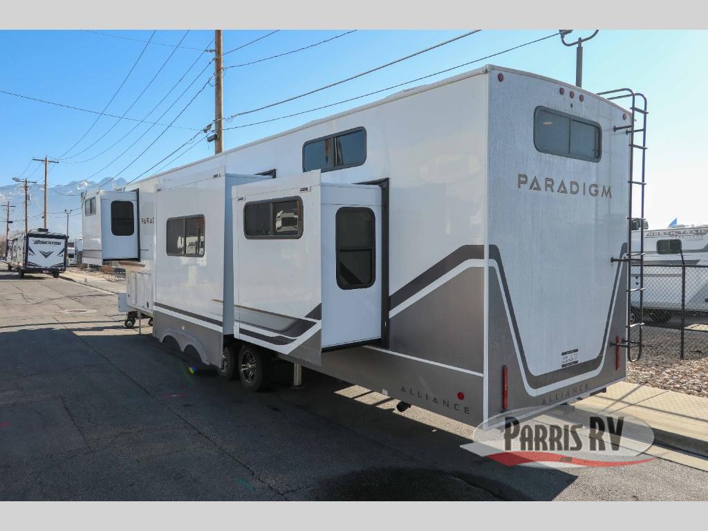 The Paradigm fifth wheels by Alliance RV are functional, high-quality, and luxurious for an unforgettable camping experience. There are three A/C units and a 40K BTU furnace to keep you comfortable year around, and you'll appreciate additional convenient amenities, like the all-in-one enclosed/heated utility center and the color coded and numbered wiring. A Helux Series coil spring pin box comes standard for hassle-free towing, along with Curt 8,000 lb. axles. You'll love the kitchen with its LG solid surface countertops and Lusso range, plus there is LED motion lighting in the pantry and a Maxx fan with a rain sensor to keep everything fresh when making dinner. Each model also includes an HD Smart TV in the living room and bedroom. And of course there are a variety of options you can choose from to further customize your fifth wheel; dual pane windows, Super Solar Plus, slide out awning toppers, and generator prep or a generator to name a few!