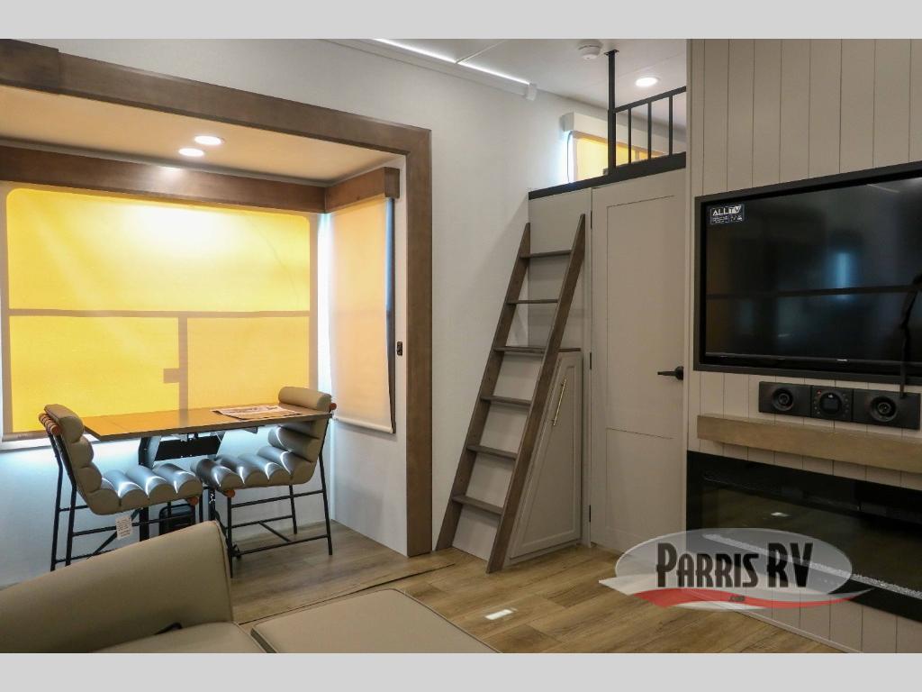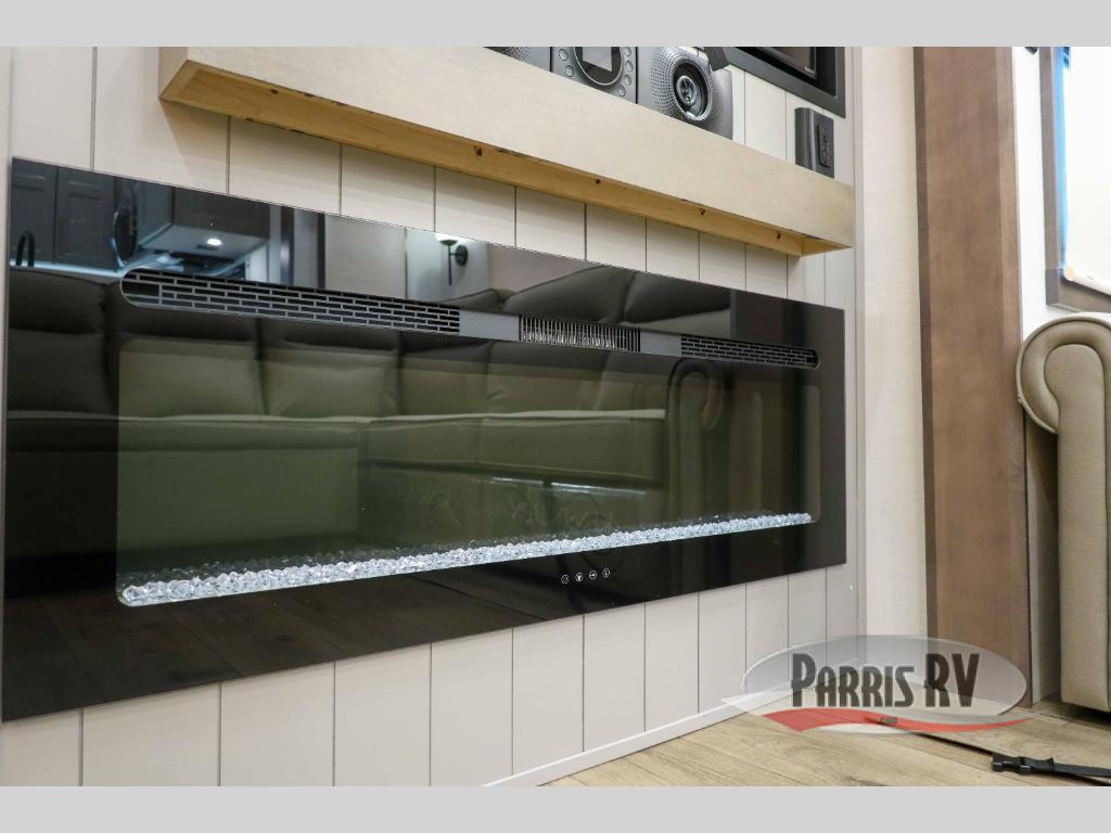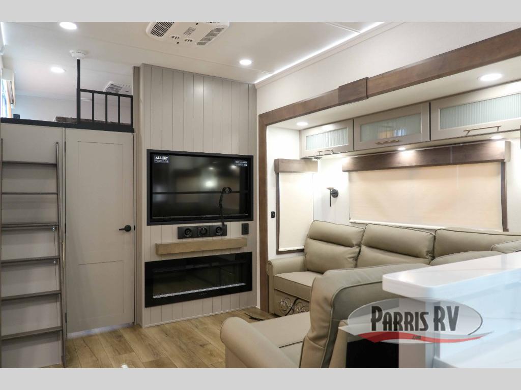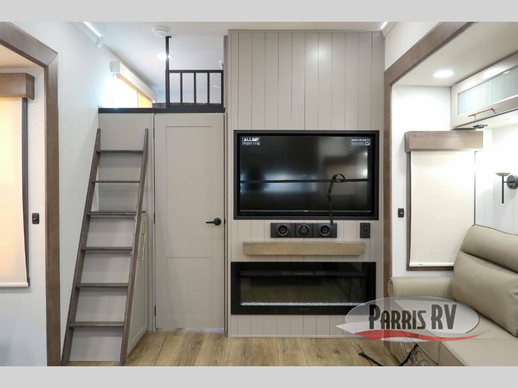 A spacious unit with sleeping for eight with plenty of choices to suit everyone! There is a front private bedroom with a king size bed that offers a large full front closet that has also been prepped for a washer and dryer if you choose that option. The front bath features a 40" x 30" shower and dual entry. Head down to the kitchen and living space at the bottom of the stairs to find a curbside slide that houses the 19 cu. ft. residential refrigerator, a pantry, and a swivel table and desk. As you continue on toward the rear of this coach, you will find a spacious living area along the roadside with a 50" Smart TV and a fireplace, a L-sofa sleeper slide, and a dual reclining loveseat. This makes a great gathering place for television watching, game playing, and even added sleeping space if needed at night. The rear private bedroom with its own private bath features a queen bed, two closets, and a Smart TV as well. The multipurpose loft area above can be accessed just before this rear bedroom entry by a ladder, and it is perfect for extra storage, or it can be used for added sleeping that the kiddos are sure to love.
