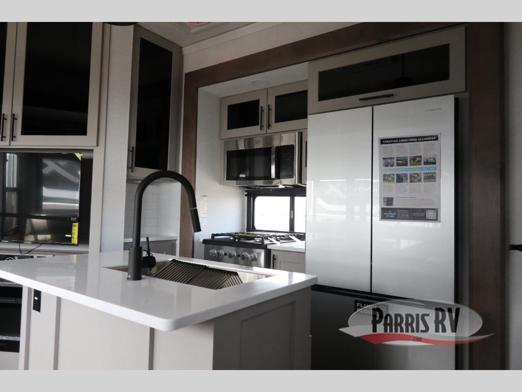 You can bring your toys with you wherever you go with any one of these Alliance RV Valor toy hauler fifth wheels! They are adventure-ready with a quality build from the walk on roof with seamless PVC roof covering to the commercial grade vinyl flooring and MorRyde CRE3000 suspension system. The Performance Running Gear package comes with a 101" wide-body benchmark chassis platform, 7,000 lb. Dexter axles, and a space enhancing drop frame storage compartment to pack in all your riding gear. You can even go off-gridding thanks to the Off the Grid Pack that has two 400 watt solar panels, generator prep, a 40 amp charge controller, and a 100 amp hour lithium iron phosphate battery. Some of the interior comforts you will enjoy are the hardwood cabinet doors and drawers, solid surface kitchen countertops, and commercial grade vinyl flooring with no carpet to make clean up a breeze. The Valor toy haulers are also the Masters of 12 Volt with USB charging station throughout, a stainless steel refrigerator, and more 12 volt features to make camping hassle-free!