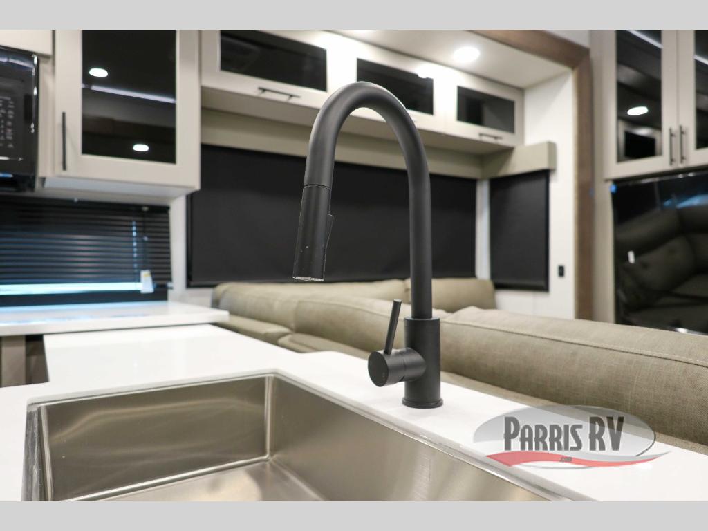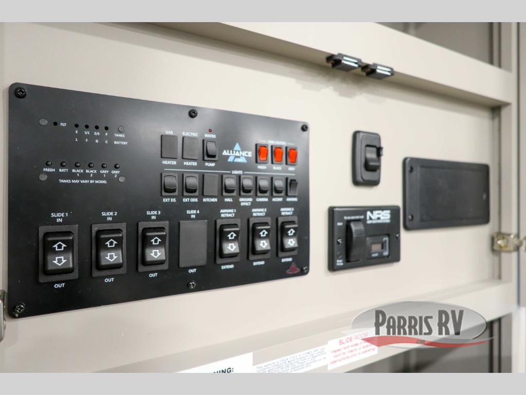 You can bring your toys with you wherever you go with any one of these Alliance RV Valor toy hauler fifth wheels! They are adventure-ready with a quality build from the walk on roof with seamless PVC roof covering to the commercial grade vinyl flooring and MorRyde CRE3000 suspension system. The Performance Running Gear package comes with a 101" wide-body benchmark chassis platform, Dexter axles, and a space enhancing drop frame storage compartment to pack in all your riding gear. You can even go off-gridding thanks to the Off the Grid Pack that has two 400-watt solar panels, generator prep, a 60-amp charge controller, and a 100-amp hour lithium iron phosphate battery. Some of the interior comforts you will enjoy are the hardwood cabinet doors and drawers, solid surface kitchen countertops, and commercial grade vinyl flooring with no carpet to make clean up a breeze. The Valor toy haulers are also the Masters of 12 Volt with USB charging station throughout, a 12V refrigerator, and more 12-volt features to make camping hassle-free!