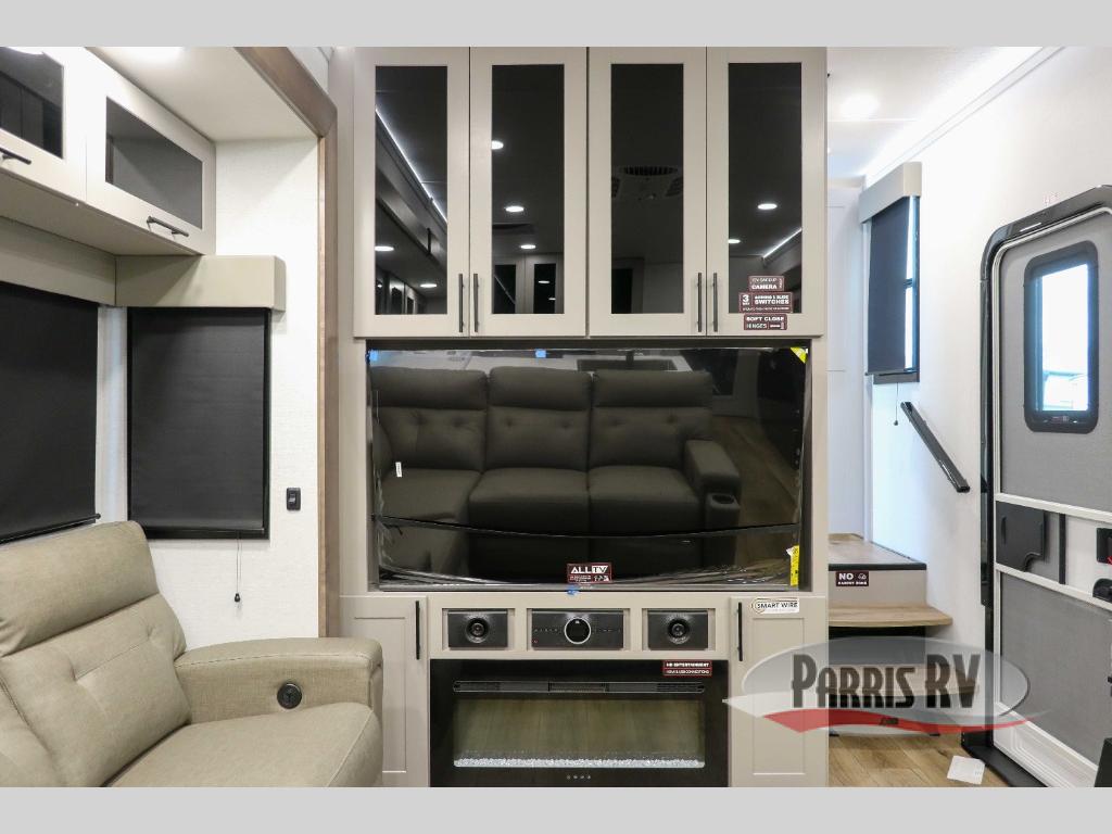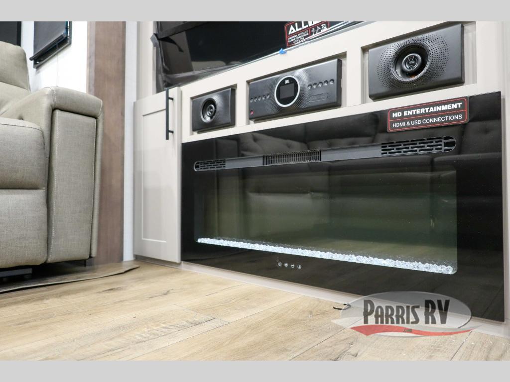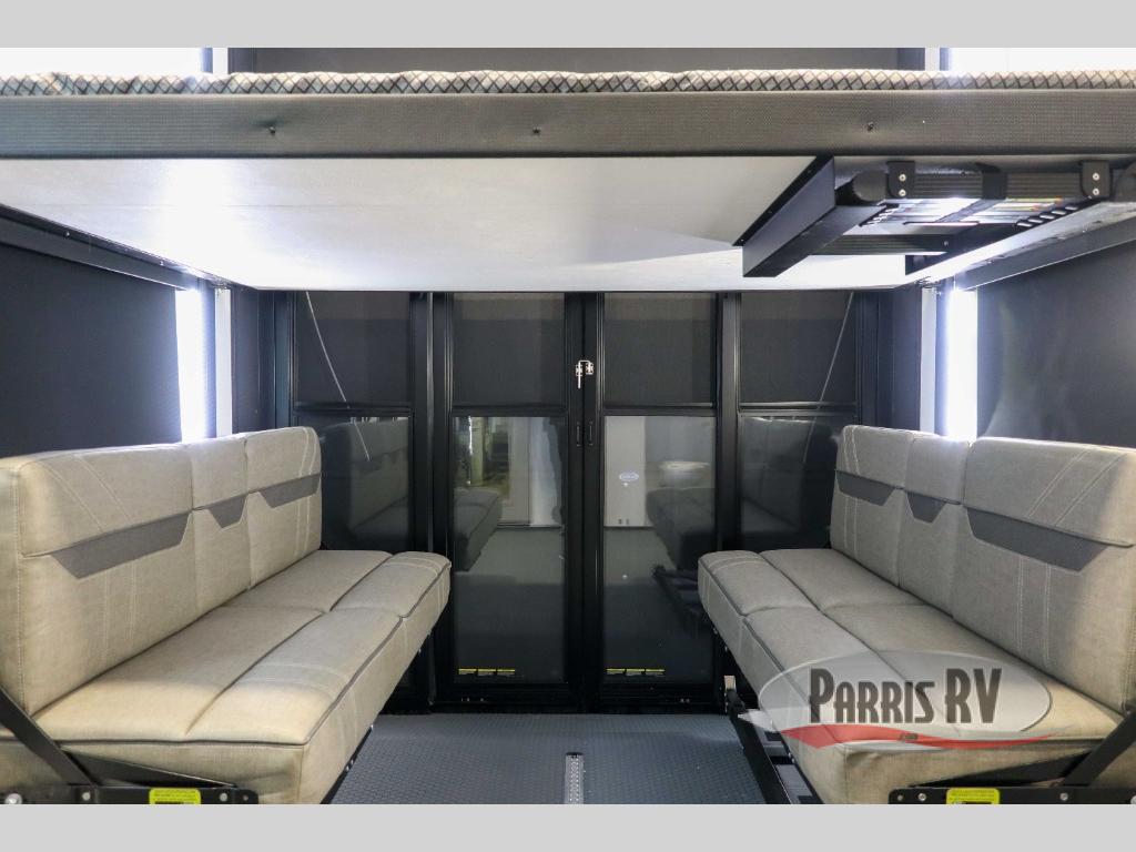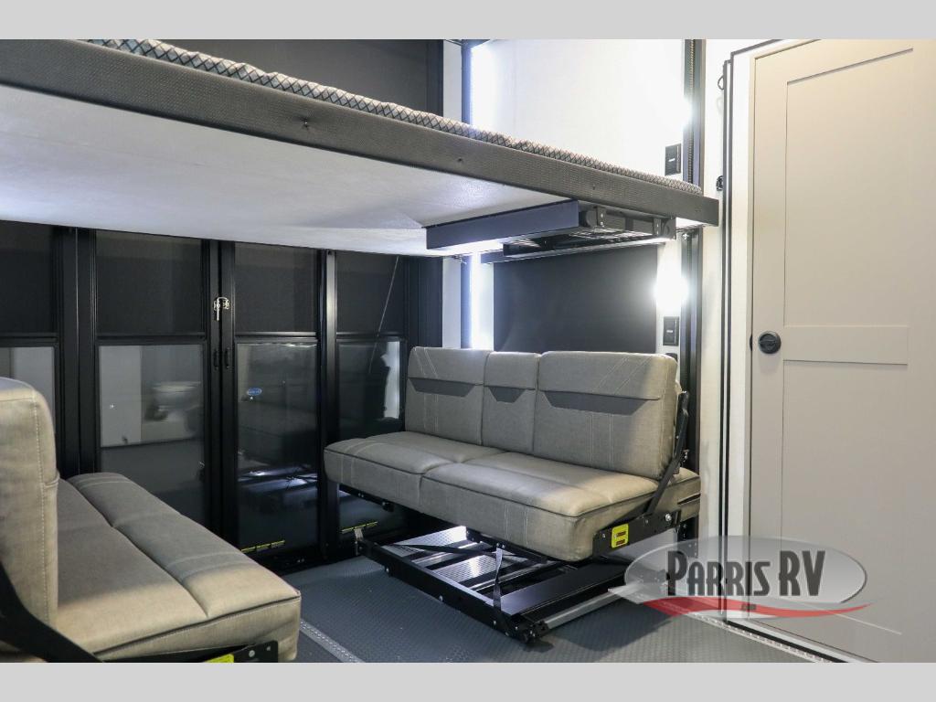 This spacious toy hauler will be perfect for weekend trips to the lake or woods! Once you've unloaded your toys from the 11' separate garage, you can relax on the 60" dual opposing sofas or set up the HappiJac bed for guests if it's getting late. There is also a 30" x 72" bunk/loft bed above the garage, a 40" garage TV, and a half bath for added convenience. As you head into the kitchen area, you'll find ample counter space to prep meals, along with a buffet, a spacious pantry and a 12V refrigerator for perishables. You can dine together at the dinette with chairs, then head to the L-shaped sofa across from the fireplace and 65" TV for movie night. The full bath includes an entrance from the hallway and into the front master bedroom. Here, you'll enjoy a king bed slide out, a flip-up dresser with a 32" TV, plus a front wardrobe with washer and dryer prep if you plan to go full-time!