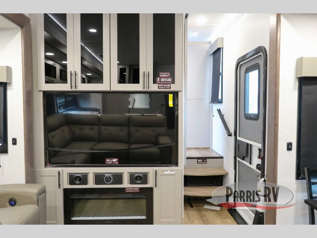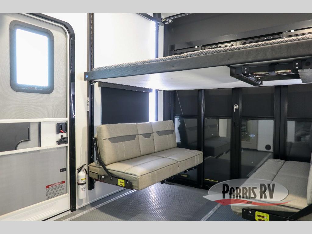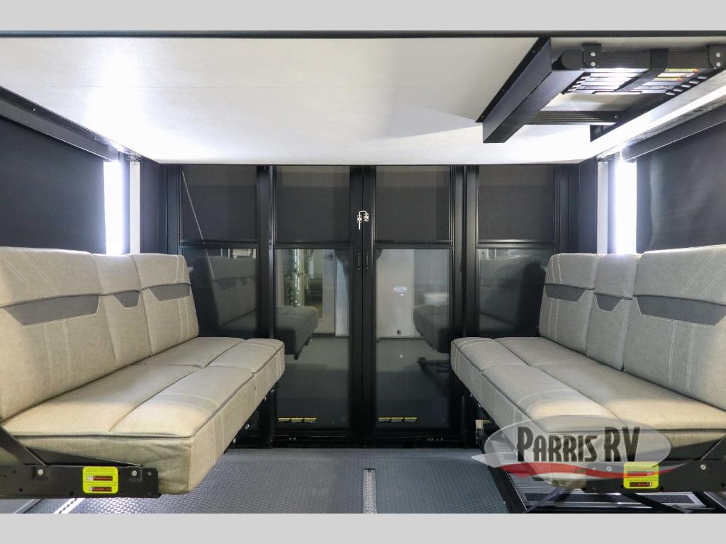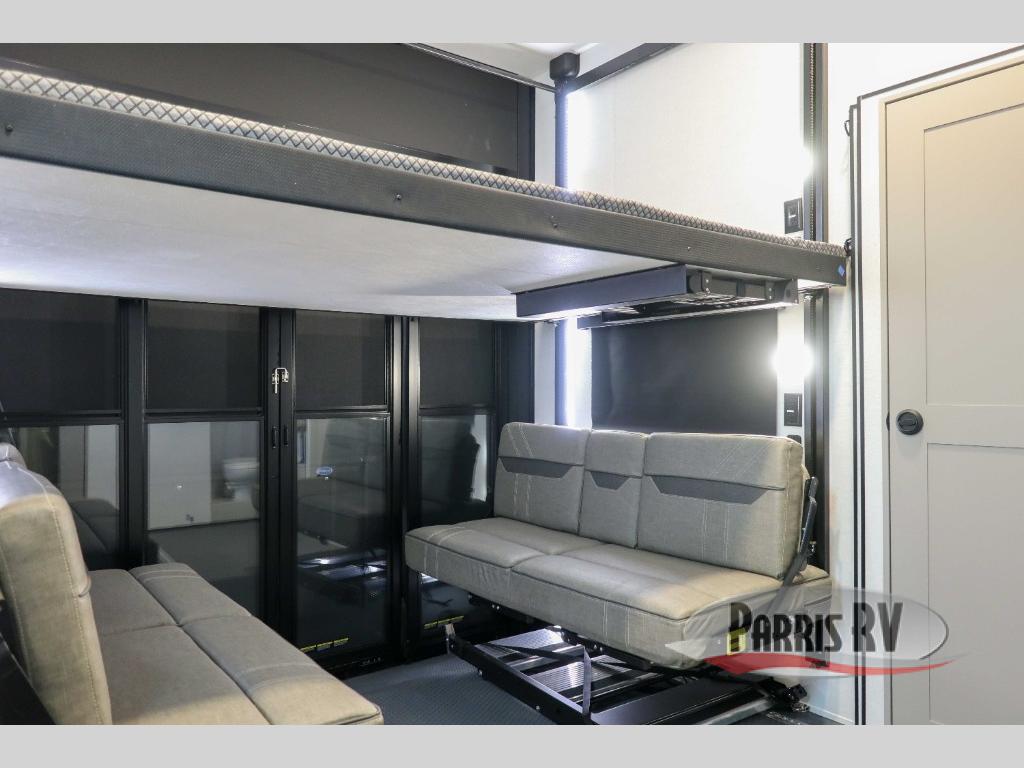 This spacious toy hauler will be perfect for weekend trips to the lake or woods! Once you've unloaded your toys from the 11' separate garage, you can relax on the 60" dual opposing sofas or set up the HappiJac bed for guests if it's getting late. There is also a 30" x 72" bunk/loft bed above the garage, a 40" garage TV, and a half bath for added convenience. As you head into the kitchen area, you'll find ample counter space to prep meals, along with a buffet, a spacious pantry and a 12V refrigerator for perishables. You can dine together at the dinette with chairs, then head to the L-shaped sofa across from the fireplace and 65" TV for movie night. The full bath includes an entrance from the hallway and into the front master bedroom. Here, you'll enjoy a king bed slide out, a flip-up dresser with a 32" TV, plus a front wardrobe with washer and dryer prep if you plan to go full-time!