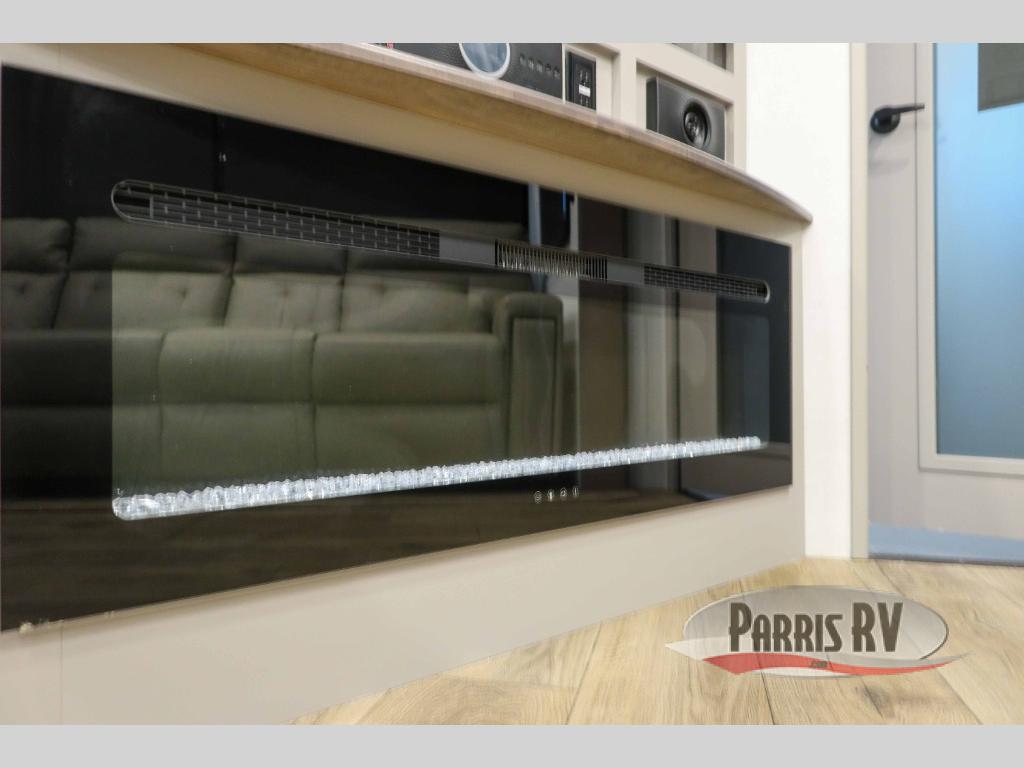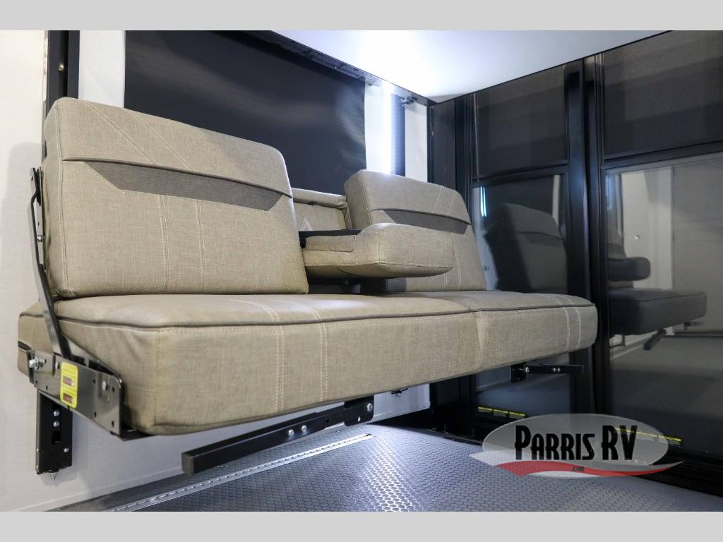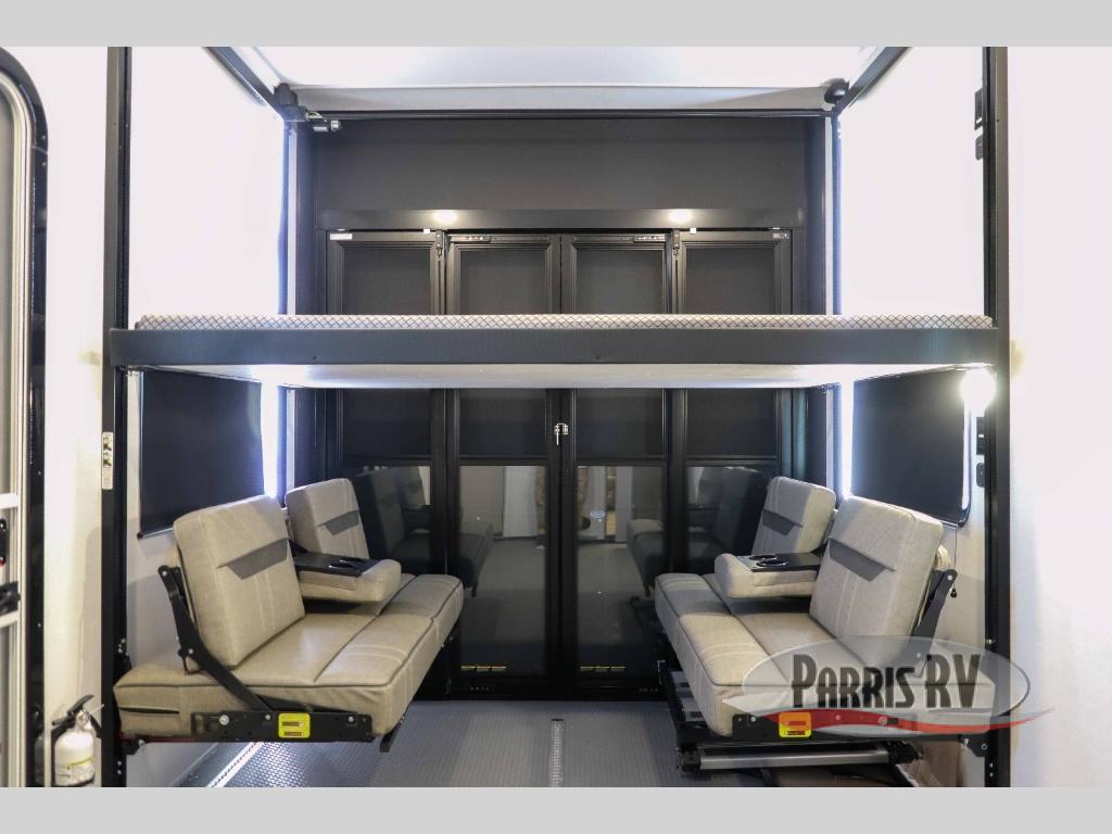 The whole gang will love camping in this toy hauler with a 14' garage for your toys and gear. Once you have arrived at your destination, you can set up the HappiJac roll-over sofas with a queen bed above them, and also a loft which opens to the garage area as well. A half bath is also available off the garage which is an added convenience for those sleeping in this converted area, and for those coming in off the trail so that they do not have to track all through the main unit to use the bathroom. The chef can prepare great meals for their hungry crew with the fully equipped kitchen including a four burner cooktop, a stainless steel 12V refrigerator, large sink, and plenty of countertop prep space. The rest of the gang can be relaxing on the large L-shaped sofa slide watching the 50" HDTV and enjoying the fireplace, or playing a game of cards at the dining table with four chairs. The front private bedroom features a king bed slide for more interior space, a flip top dresser for all of your belongings, and a front wardrobe with washer and dryer prep, plus it has an entrance into the dual entry bathroom!