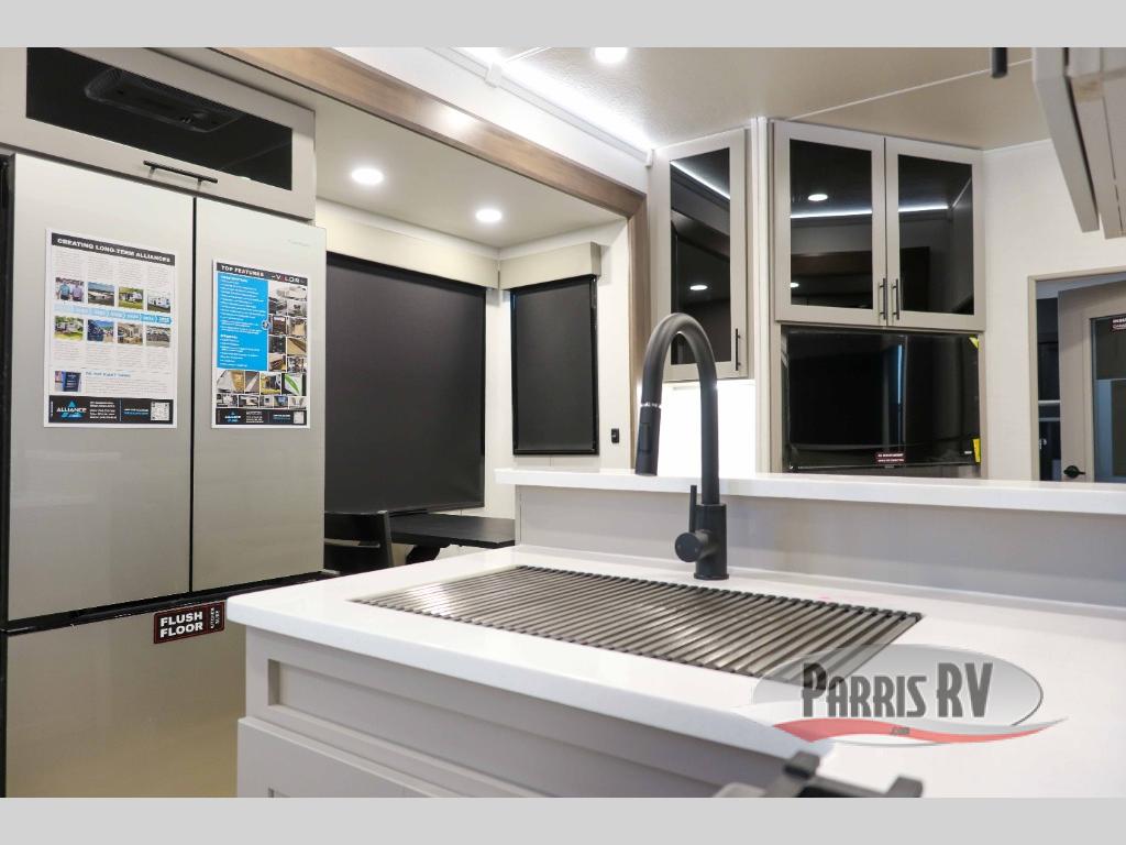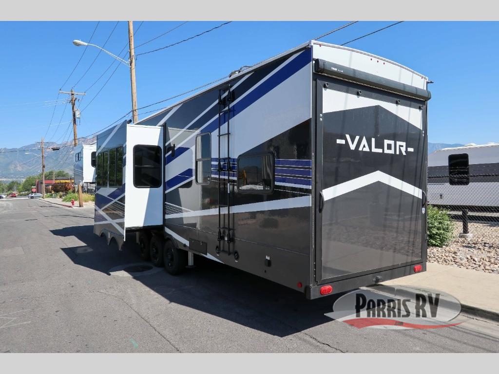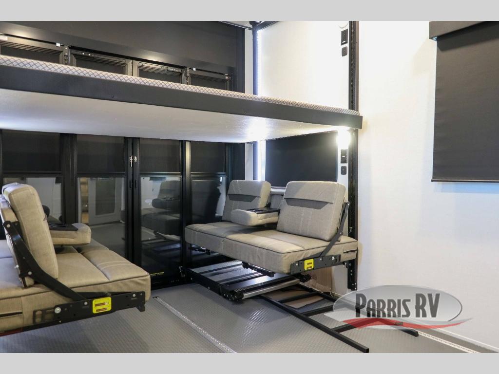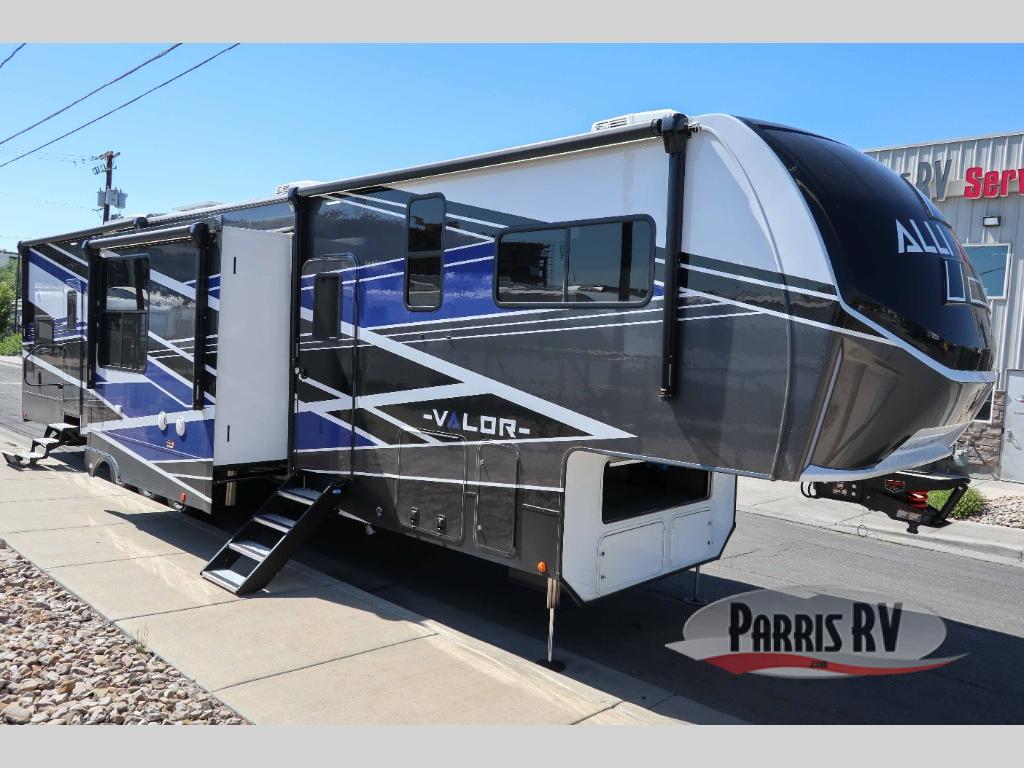 You can bring your toys with you wherever you go with any one of these Alliance RV Valor toy hauler fifth wheels! They are adventure-ready with a quality build from the walk on roof with seamless PVC roof covering to the commercial grade vinyl flooring and MorRyde CRE3000 suspension system. The Performance Running Gear package comes with a 101" wide-body benchmark chassis platform, 7,000 lb. Dexter axles, and a space enhancing drop frame storage compartment to pack in all your riding gear. You can even go off-gridding thanks to the Off the Grid Pack that has two 400 watt solar panels, generator prep, a 40 amp charge controller, and a 100 amp hour lithium iron phosphate battery. Some of the interior comforts you will enjoy are the hardwood cabinet doors and drawers, solid surface kitchen countertops, and commercial grade vinyl flooring with no carpet to make clean up a breeze. The Valor toy haulers are also the Master of 12 Volt with USB charging station throughout, a stainless steel refrigerator, and more 12 volt features to make camping hassle-free!