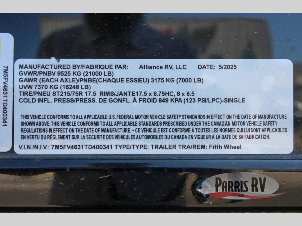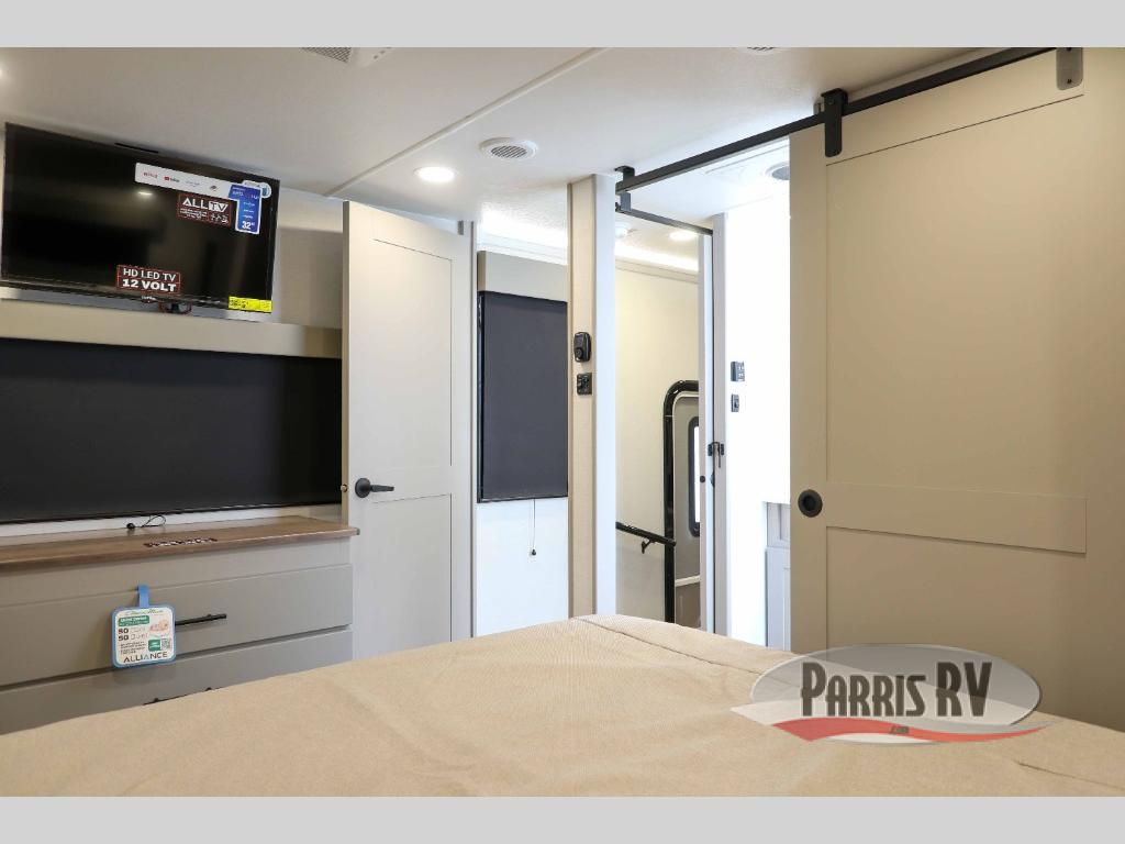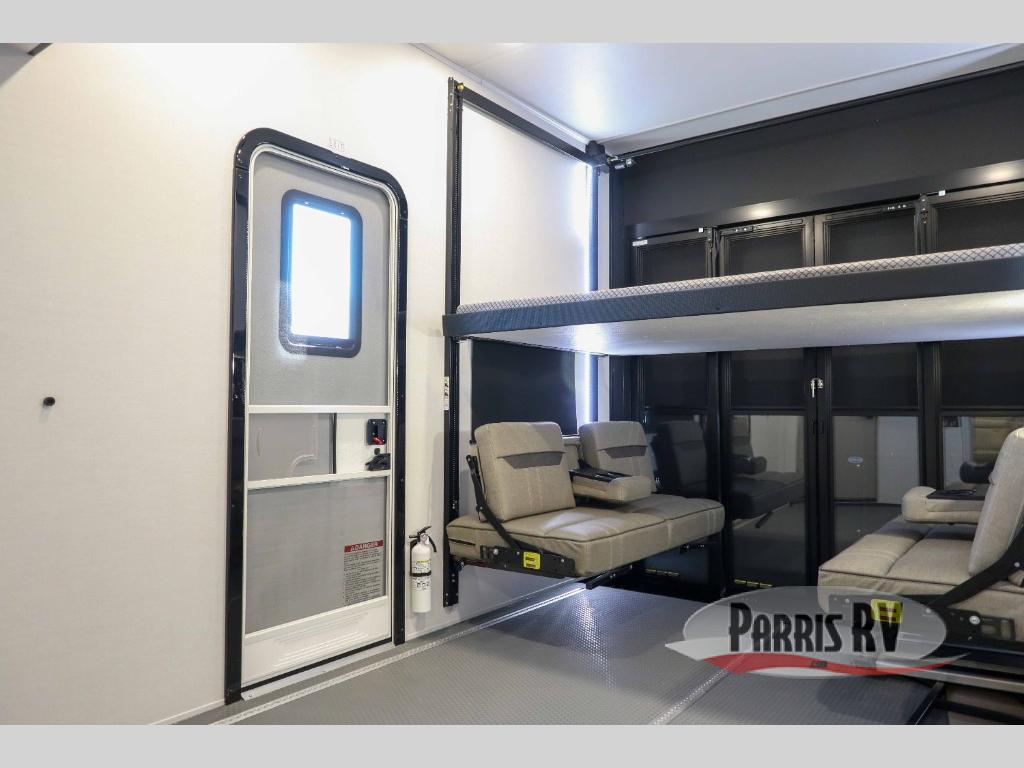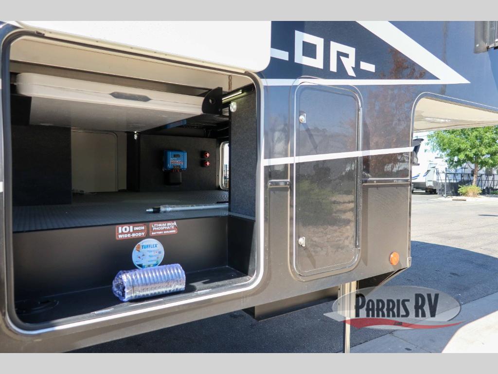 You can bring your toys with you wherever you go with any one of these Alliance RV Valor toy hauler fifth wheels! They are adventure-ready with a quality build from the walk on roof with seamless PVC roof covering to the commercial grade vinyl flooring and MorRyde CRE3000 suspension system. The Performance Running Gear package comes with a 101" wide-body benchmark chassis platform, 7,000 lb. Dexter axles, and a space enhancing drop frame storage compartment to pack in all your riding gear. You can even go off-gridding thanks to the Off the Grid Pack that has two 400 watt solar panels, generator prep, a 40 amp charge controller, and a 100 amp hour lithium iron phosphate battery. Some of the interior comforts you will enjoy are the hardwood cabinet doors and drawers, solid surface kitchen countertops, and commercial grade vinyl flooring with no carpet to make clean up a breeze. The Valor toy haulers are also the Master of 12 Volt with USB charging station throughout, a stainless steel refrigerator, and more 12 volt features to make camping hassle-free!