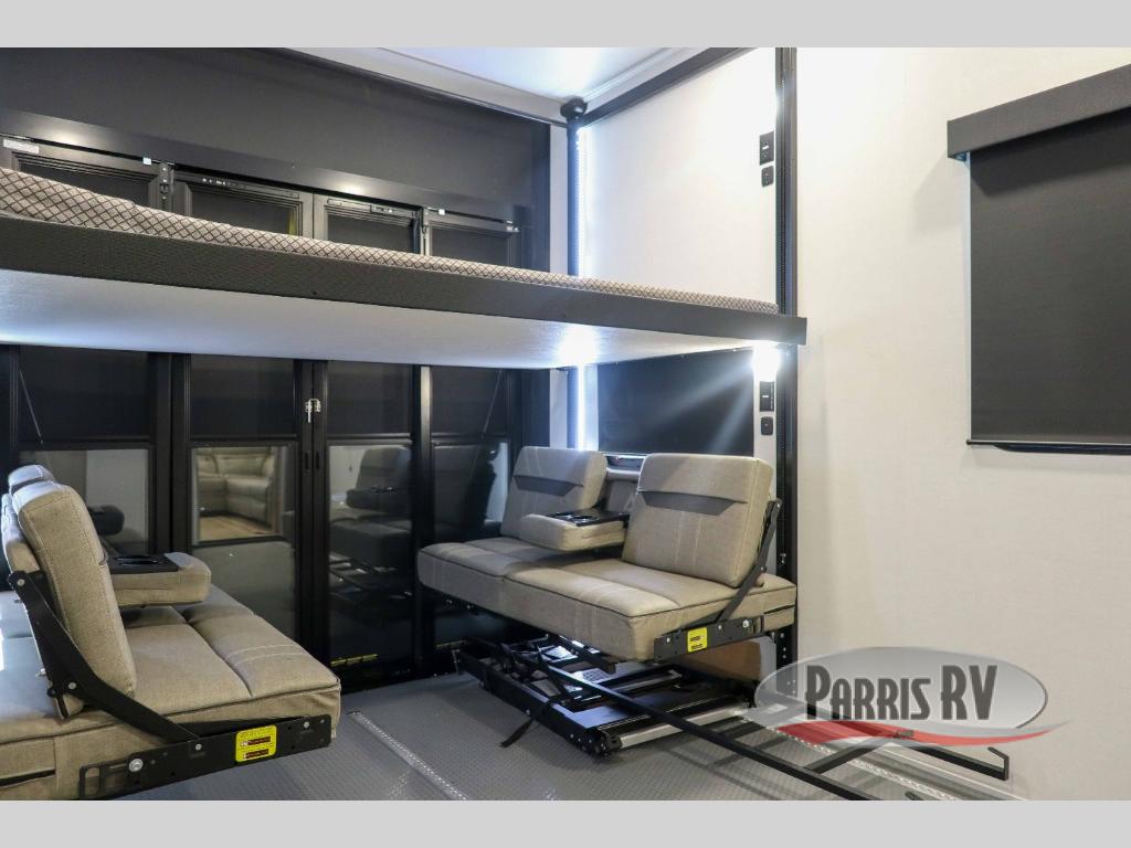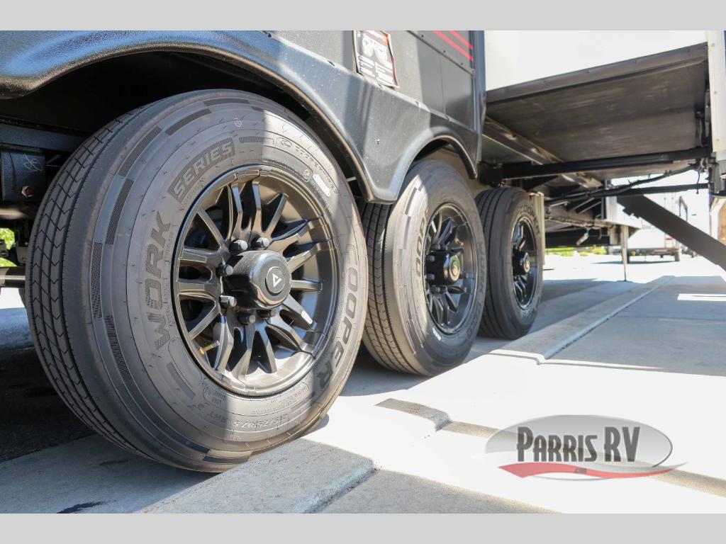 You can bring your toys with you wherever you go with any one of these Alliance RV Valor toy hauler fifth wheels! They are adventure-ready with a quality build from the walk on roof with seamless PVC roof covering to the commercial grade vinyl flooring and MorRyde CRE3000 suspension system. The Performance Running Gear package comes with a 101" wide-body benchmark chassis platform, 7,000 lb. Dexter axles, and a space enhancing drop frame storage compartment to pack in all your riding gear. You can even go off-gridding thanks to the Off the Grid Pack that has two 400 watt solar panels, generator prep, a 40 amp charge controller, and a 100 amp hour lithium iron phosphate battery. Some of the interior comforts you will enjoy are the hardwood cabinet doors and drawers, solid surface kitchen countertops, and commercial grade vinyl flooring with no carpet to make clean up a breeze. The Valor toy haulers are also the Master of 12 Volt with USB charging station throughout, a stainless steel refrigerator, and more 12 volt features to make camping hassle-free!