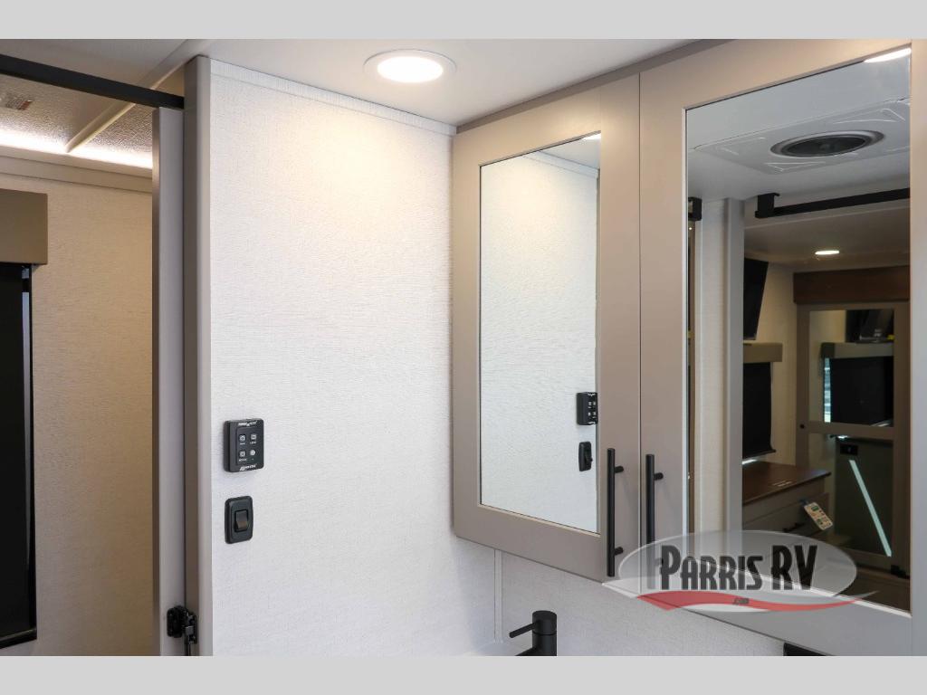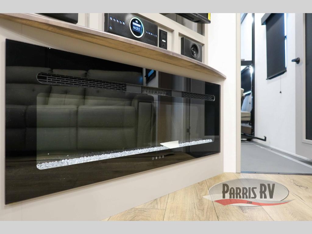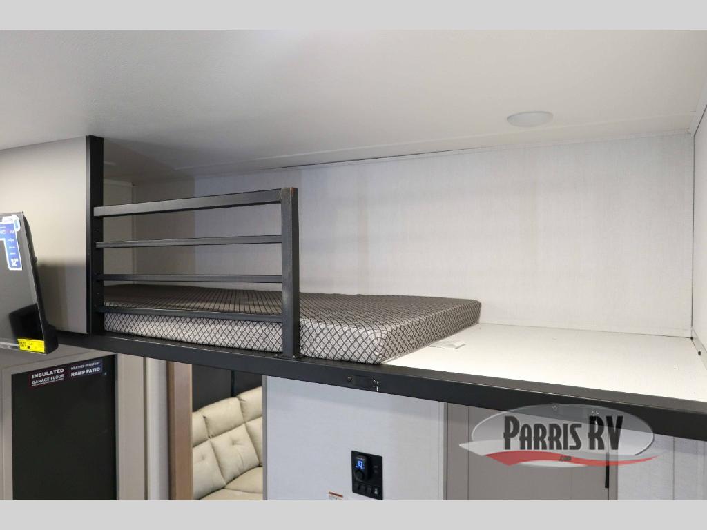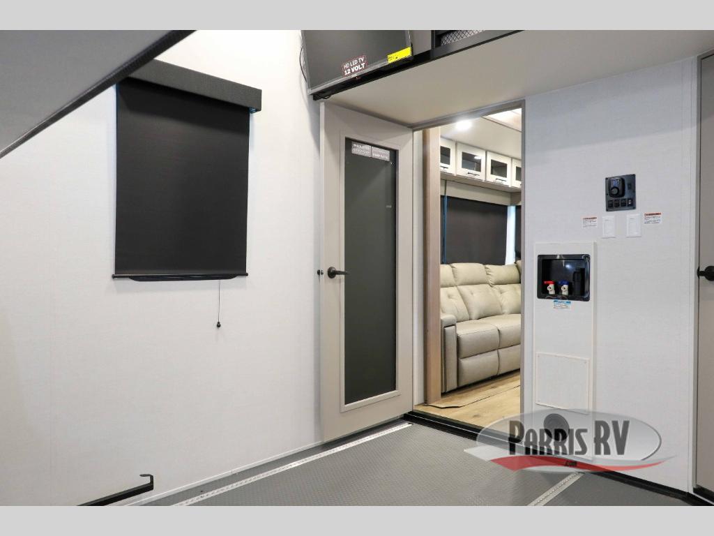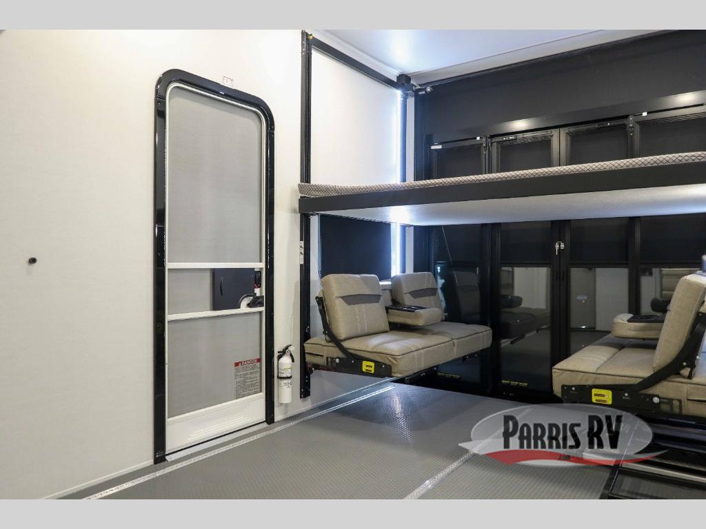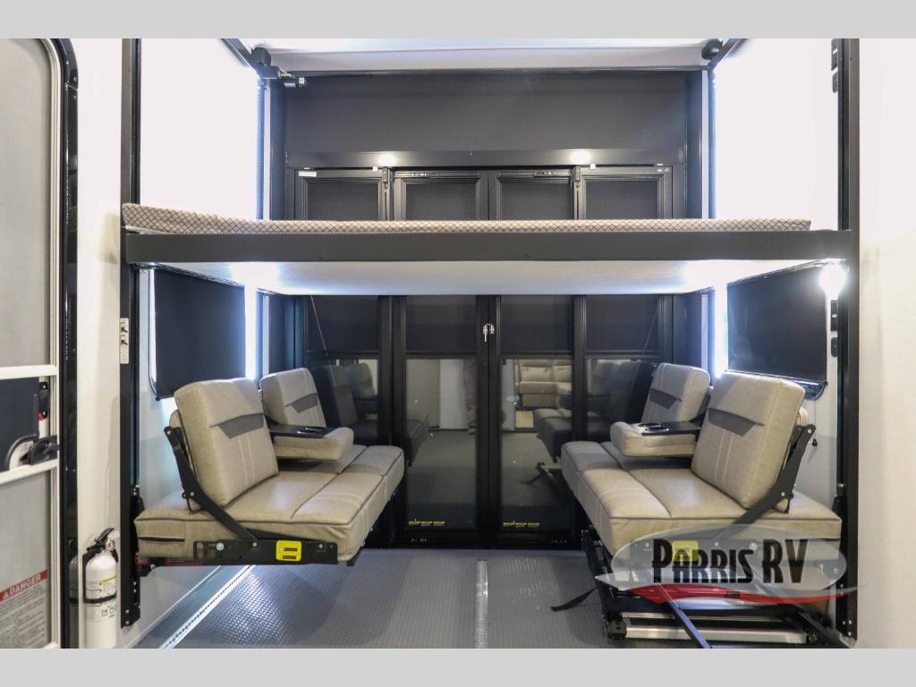 The whole gang will love camping in this toy hauler with a 14' garage for your toys and gear. Once you have arrived at your destination, you can set up the HappiJac roll-over sofas with a queen bed above them, and also a loft which opens to the garage area as well. A half bath is also available off the garage which is an added convenience for those sleeping in this converted area, and for those coming in off the trail so that they do not have to track all through the main unit to use the bathroom. The chef can prepare great meals for their hungry crew with the fully equipped kitchen including a four burner cooktop, a stainless steel 12V refrigerator, large sink, and plenty of countertop prep space. The rest of the gang can be relaxing on the large L-shaped sofa slide watching the 50" HDTV and enjoying the fireplace, or playing a game of cards at the dining table with four chairs. The front private bedroom features a king bed slide for more interior space, a flip top dresser for all of your belongings, and a front wardrobe with washer and dryer prep, plus it has an entrance into the dual entry bathroom!