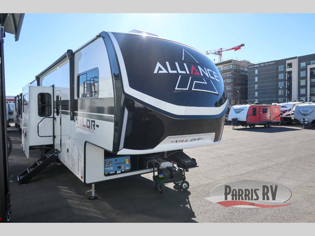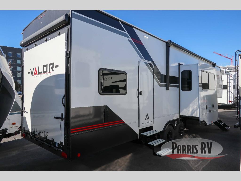 With any Valor All-Access toy hauler by Alliance RV you will be getting a travel trailer or fifth wheel with exceptional features at a great value! There is a painted fiberglass front cap, Mylar reinforced exterior seals, Azdel-backed fiberglass sidewalls, and a walk-on roof with a seamless PVC roof covering for added strength and durability. The 101" wide-body Benchmark chassis means you can bring along your larger toys, and the multipoint tie-down system will keep your toys safe and secure on the way to the campground. All of your power needs will be met with the Masters of 12 Volt Package that includes a 12V JBL sound system and USB charging stations throughout, plus the Off The Grid Pack comes with a 400 watt solar panel, 40 amp charge controller, and generator prep to keep you going all week long. Some of the interior comforts you'll enjoy are commercial grade vinyl flooring with no carpet so you can easily clean up, black cabinetry hardware, residential LED recessed ceiling lights, and so much more!