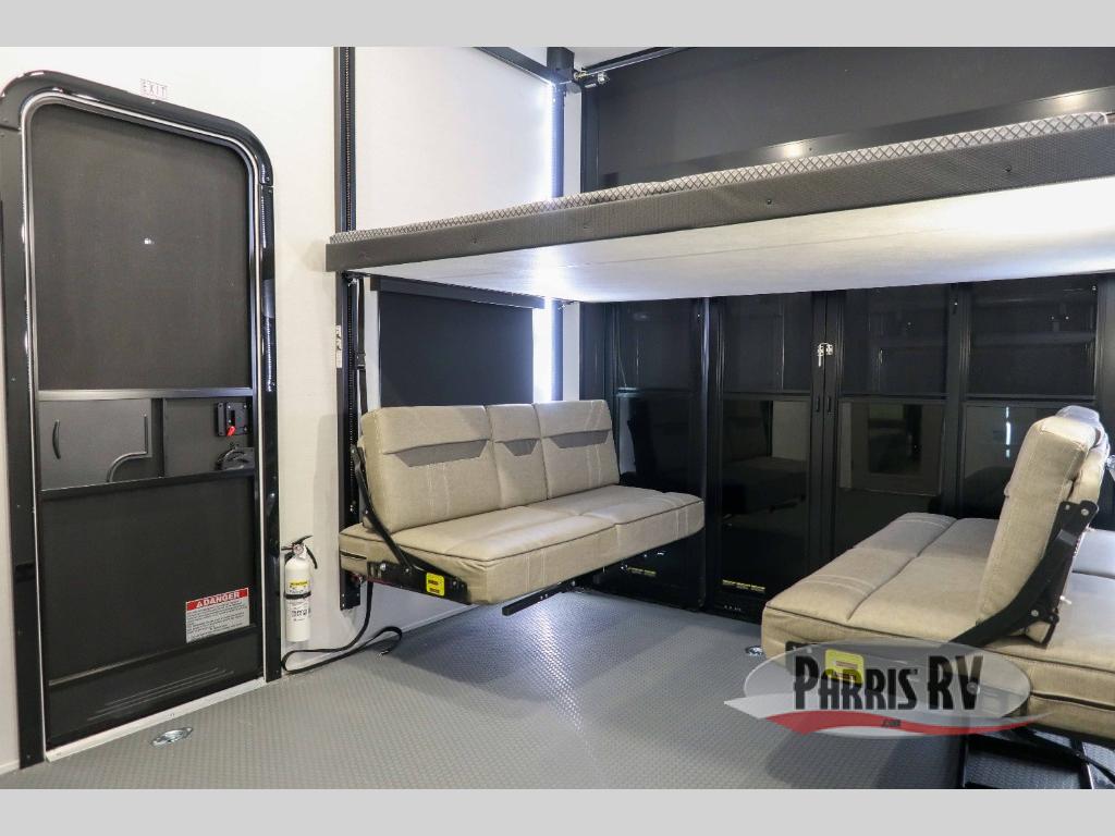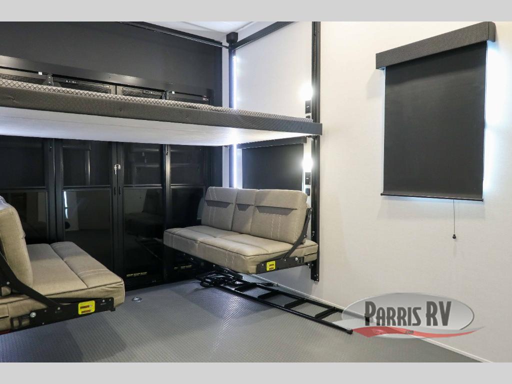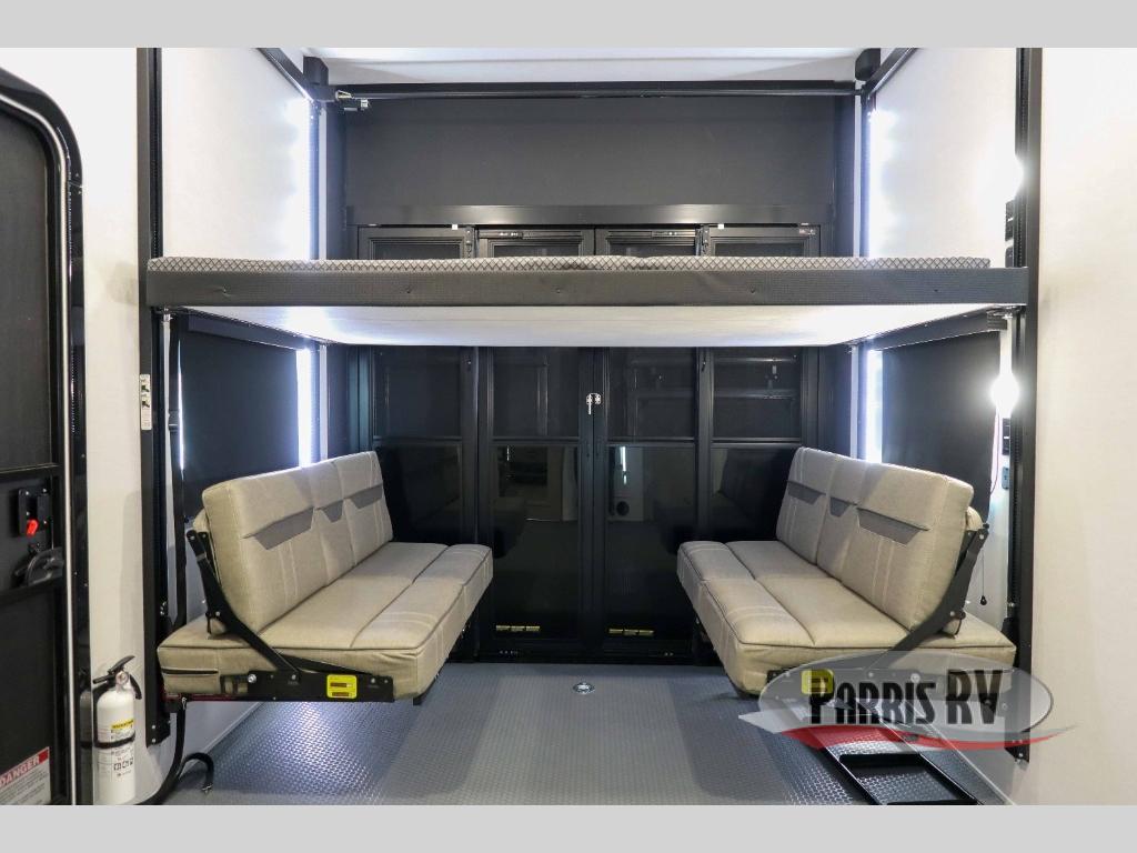 If you're needing more space for your toys, this toy hauler will meet your needs with a 14' separate garage! Once your toys are unloaded using the weather resistant ramp door, relax on the HappiJac roll-over sofas with a folding table in between, and this area can become your guests' bedroom at night since there is a drop-down queen bed, a half bath, plus an additional 30" x 72" bunk/loft bed. You will have the front bedroom all to yourselves that includes a king bed with an optional queen bed plus a wardrobe slide out to keep your space tidy. Everyone can meet in the main living area/kitchen for movie night with the HDTV and sofa slide out, while the chef of makes dinner on the three burner cooktop. There is also a hutch and pantry for storage and a kitchen island for more counter space!