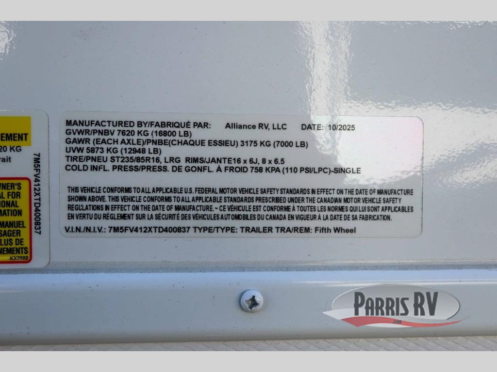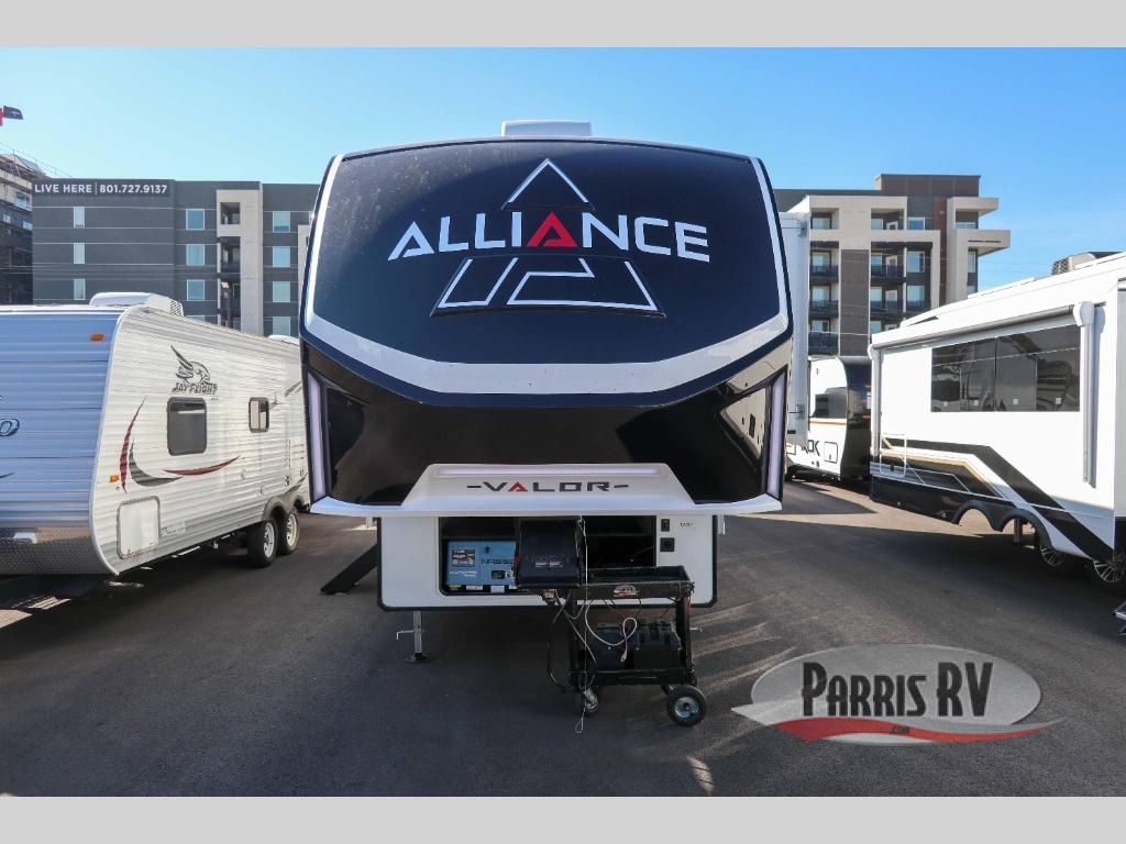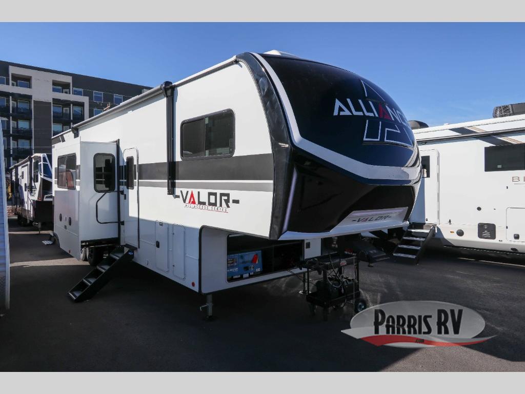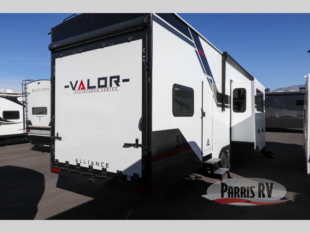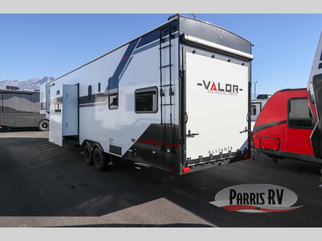 With any Valor All-Access toy hauler by Alliance RV you will be getting a travel trailer or fifth wheel with exceptional features at a great value! There is a painted fiberglass front cap, Mylar reinforced exterior seals, Azdel-backed fiberglass sidewalls, and a walk-on roof with a seamless PVC roof covering for added strength and durability. The 101" wide-body Benchmark chassis means you can bring along your larger toys, and the multipoint tie-down system will keep your toys safe and secure on the way to the campground. All of your power needs will be met with the Masters of 12 Volt Package that includes a 12V JBL sound system and USB charging stations throughout, plus the Off The Grid Pack comes with a 400 watt solar panel, 40 amp charge controller, and generator prep to keep you going all week long. Some of the interior comforts you'll enjoy are commercial grade vinyl flooring with no carpet so you can easily clean up, black cabinetry hardware, residential LED recessed ceiling lights, and so much more!