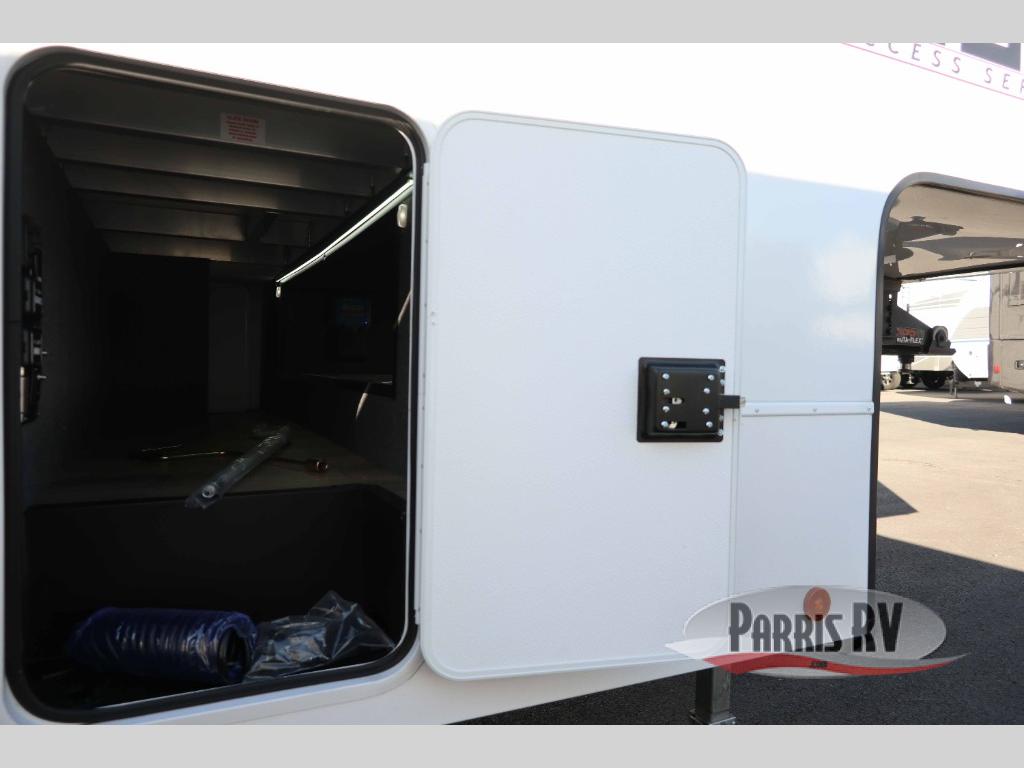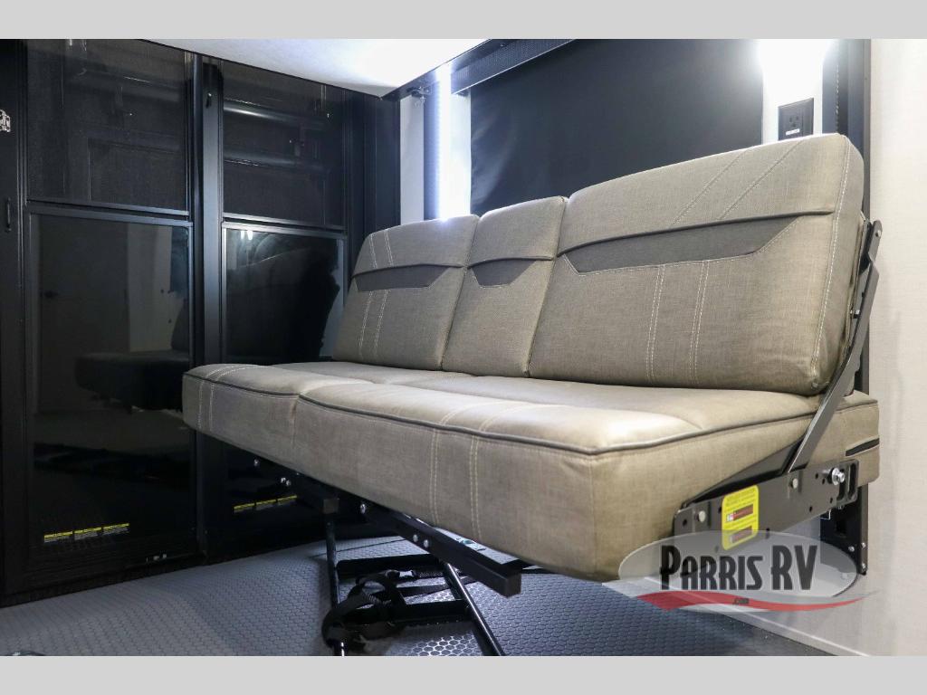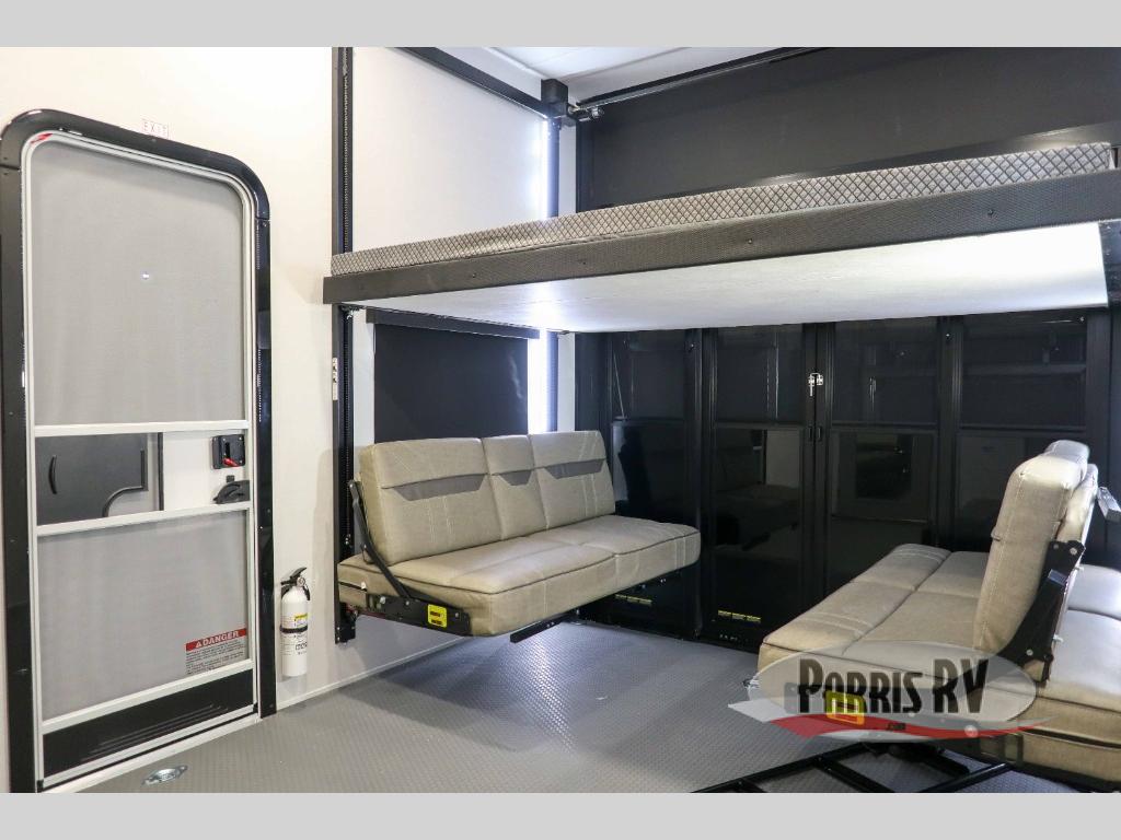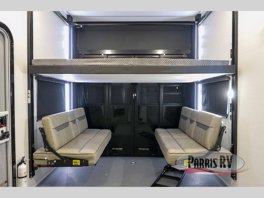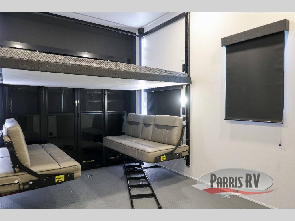 If you're needing more space for your toys, this toy hauler will meet your needs with a 14' separate garage! Once your toys are unloaded using the weather resistant ramp door, relax on the HappiJac roll-over sofas with a folding table in between, and this area can become your guests' bedroom at night since there is a drop-down queen bed, a half bath, plus an additional 30" x 72" bunk/loft bed. You will have the front bedroom all to yourselves that includes a king bed with an optional queen bed plus a wardrobe slide out to keep your space tidy. Everyone can meet in the main living area/kitchen for movie night with the HDTV and sofa slide out, while the chef of makes dinner on the three burner cooktop. There is also a hutch and pantry for storage and a kitchen island for more counter space!