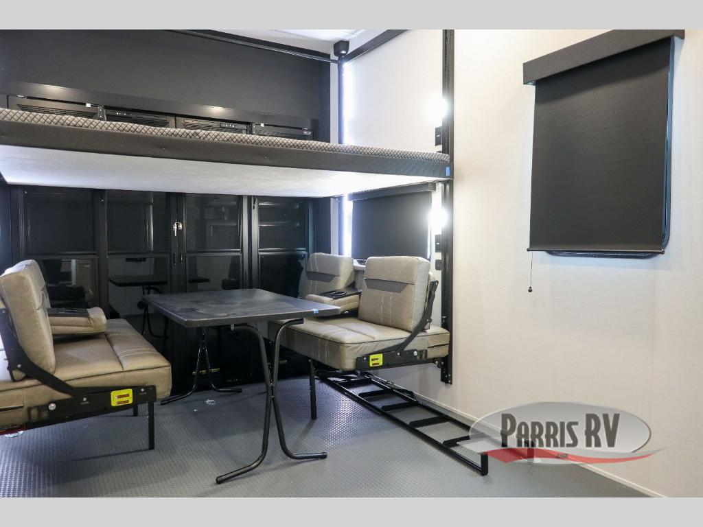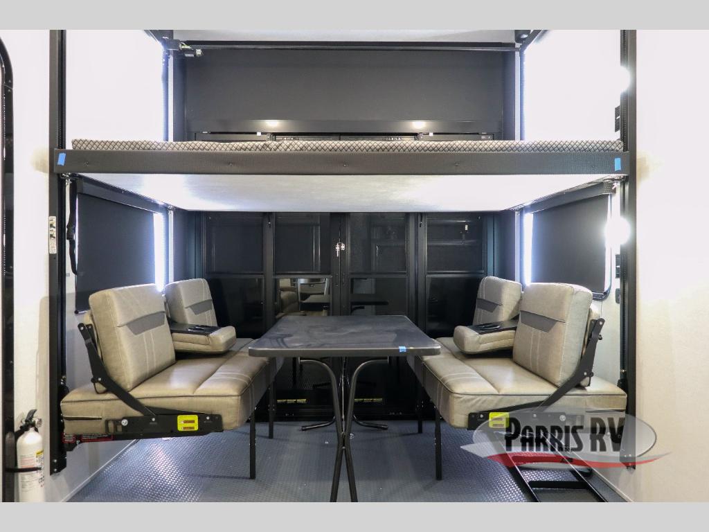 If you're needing more space for your toys, this toy hauler will meet your needs with a 14' separate garage! Once your toys are unloaded using the weather resistant ramp door, relax on the HappiJac roll-over sofas with a folding table in between, and this area can become your guests' bedroom at night since there is a drop-down queen bed, a half bath, plus an additional 30" x 72" bunk/loft bed. You will have the front bedroom all to yourselves that includes a king bed with an optional queen bed plus a wardrobe slide out to keep your space tidy. Everyone can meet in the main living area/kitchen for movie night with the HDTV and sofa slide out, while the chef of makes dinner on the three burner cooktop. There is also a hutch and pantry for storage and a kitchen island for more counter space!