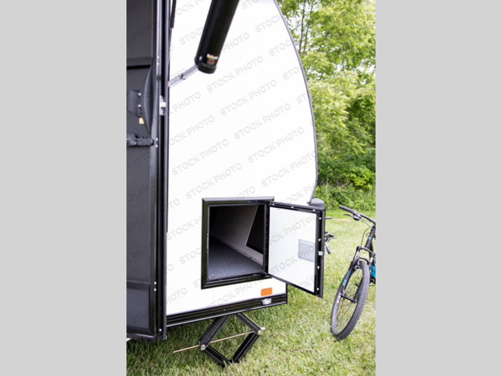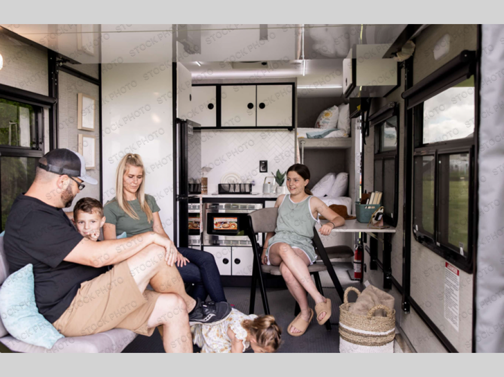 Grab your riding helmet and load up your bikes in this toy hauler! Once your toys are unloaded from the cable-less ramp door with non-slip tread, you can add an optional sleeper sofa to relax, then make lunch in the kitchen. There is a flush mount two burner LP cooktop and a convection microwave, plus a 12V refrigerator to store leftovers. The wet bath includes a shower and porcelain toilet so you can freshen up after a trail ride, and the front bunk beds will provide a great night's rest. And an optional Happijac queen bed can be added in the garage for even more sleeping space if needed!