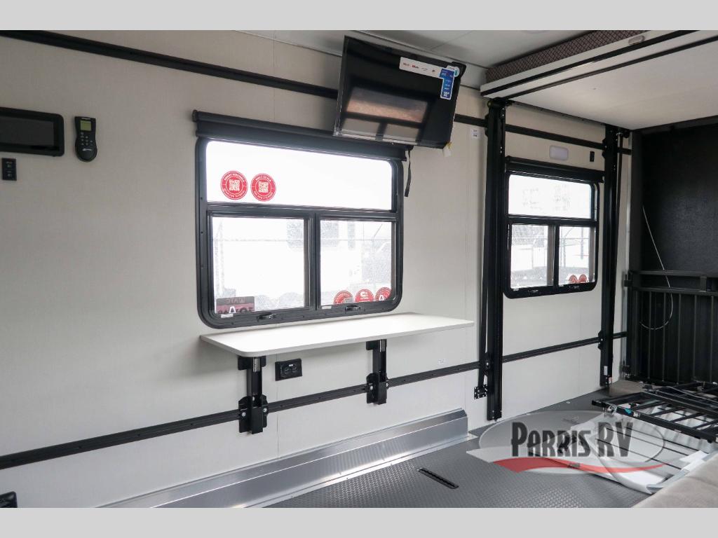 With any PLA 450 toy hauler travel trailer by ATC Trailers, you will enjoy lightweight towing and a configurable garage space for your toys, gear, and more! The all-aluminum and composite construction features no wood so you won't have to worry about rot, and the All-Weather Protection Package means you can extend your camping season. There is a 200-watt solar panel, a 100-watt inverter, and 120V/USB outlets to keep your adventures going. Outside, you'll find storage for your gear, a power awning with a light strip, sleek frameless dual pane windows, and more convenient features. The interior is just as accommodating with aluminum cabinets, dimmable can ceiling lights, configurable furniture track system, and solid surface countertops!