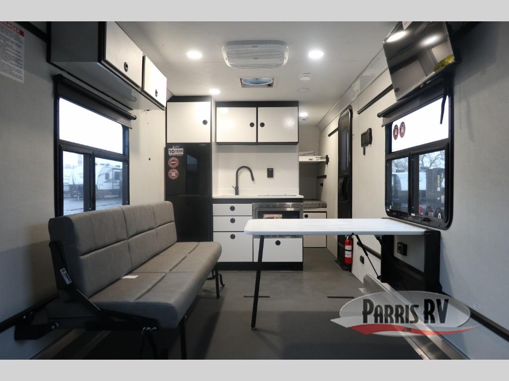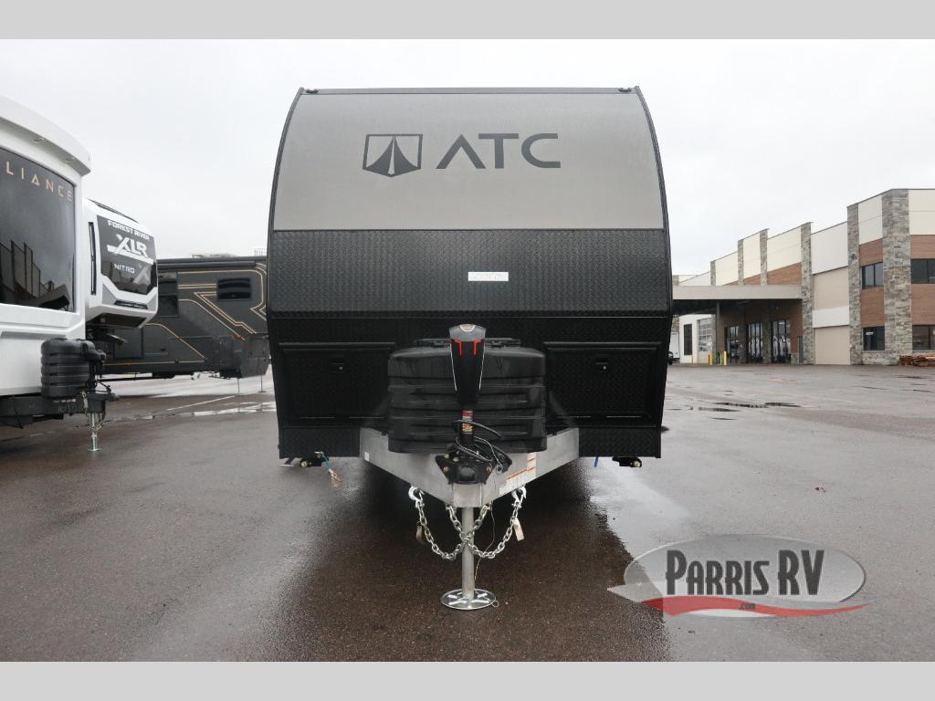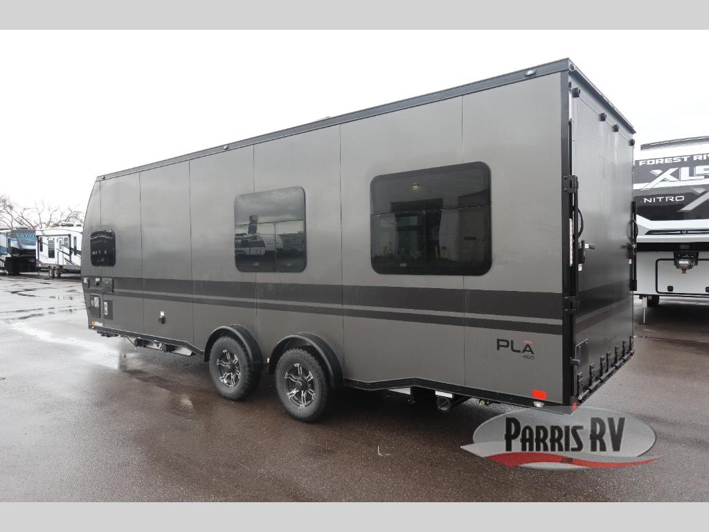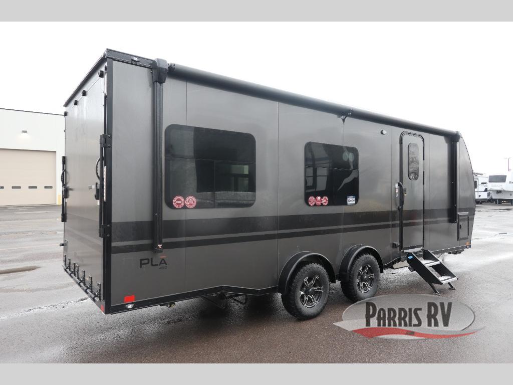 With any PLA 450 toy hauler travel trailer by ATC Trailers, you will enjoy lightweight towing and a configurable garage space for your toys, gear, and more! The all-aluminum and composite construction features no wood so you won't have to worry about rot, and the All-Weather Protection Package means you can extend your camping season. There is a 200-watt solar panel, a 100-watt inverter, and 120V/USB outlets to keep your adventures going. Outside, you'll find storage for your gear, a power awning with a light strip, sleek frameless dual pane windows, and more convenient features. The interior is just as accommodating with aluminum cabinets, dimmable can ceiling lights, configurable furniture track system, and solid surface countertops!