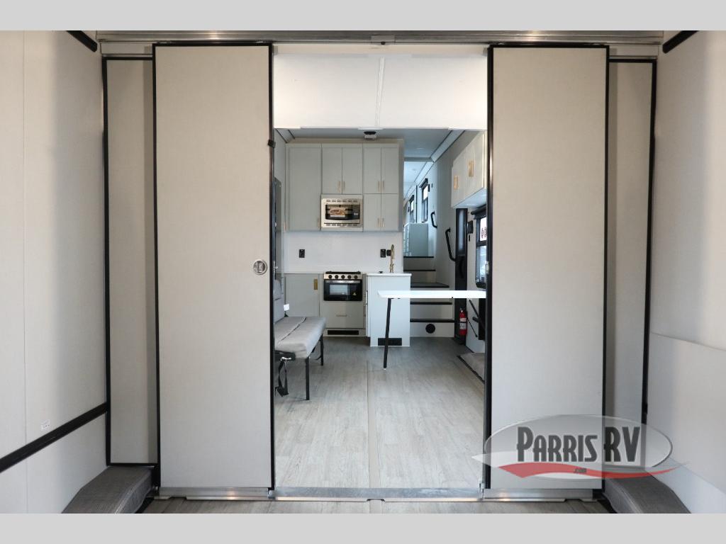 With any PLA 750 toy hauler fifth wheel by ATC Trailers, you will find a durable unit made to last thanks to the 6-sided welded aluminum frame, enclosed underbelly, composite ramp door, and more! The LifeTrac modular component system lets you configure your garage how you need it, and there are also tie-downs with three rows of Airline tracks with covers and an exterior pass-through storage for all the riding gear! Inside, you'll enjoy aluminum cabinets with solid surface countertops in the kitchen and bath, dimmable can ceiling lights, composite with commercial-grade vinyl flooring, and a porcelain toilet to name a few stand-out features. You can further customize your toy hauler by adding one or more of the available options, such as a deck package, 36 gallon fuel station, happijac sofa sleepers, an exterior shower, and more!