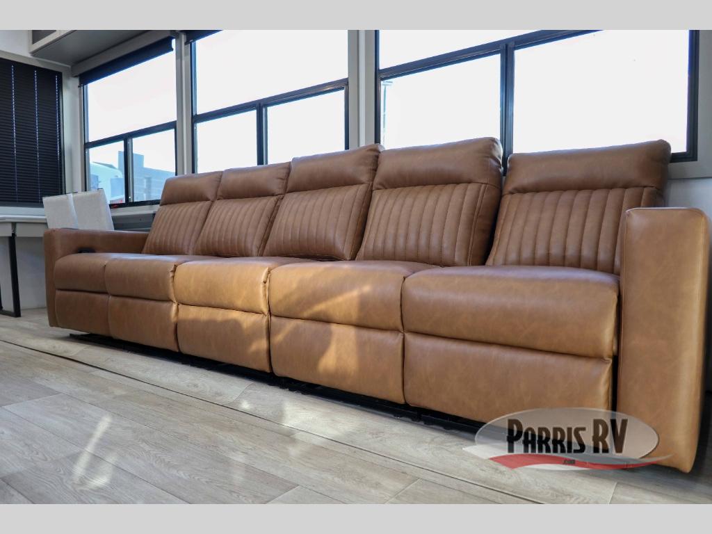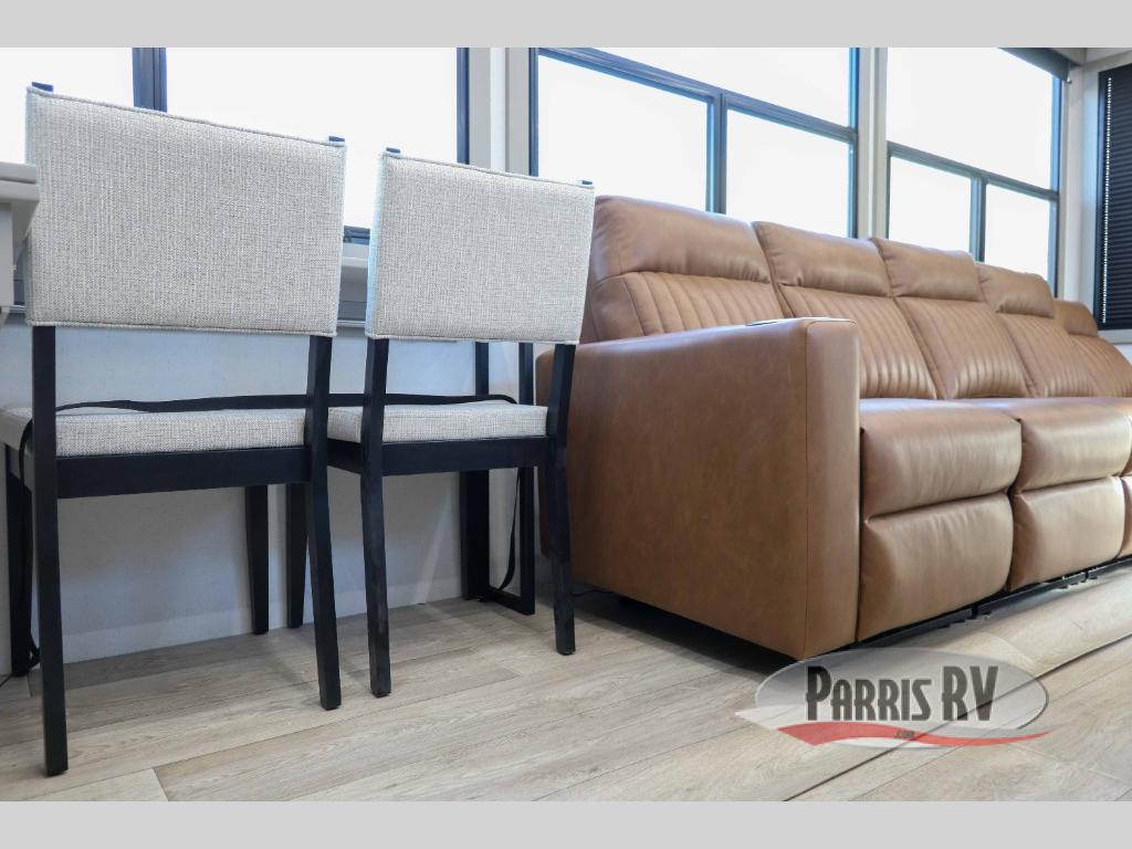 Trips are made complete in this spacious, rear kitchen fifth wheel! There is ample counter space to prep meals, plus a JBL party box so you can listen to your favorite tunes as you cook. The dinette table with two seats provides a place to dine together, and the living area includes a large sofa plus a second, L-shaped sofa with a patent pending AX ottoman/table. A full bath lets you freshen up each day, and a front private bedroom with a king bed tilt lets you stay up late with a book!