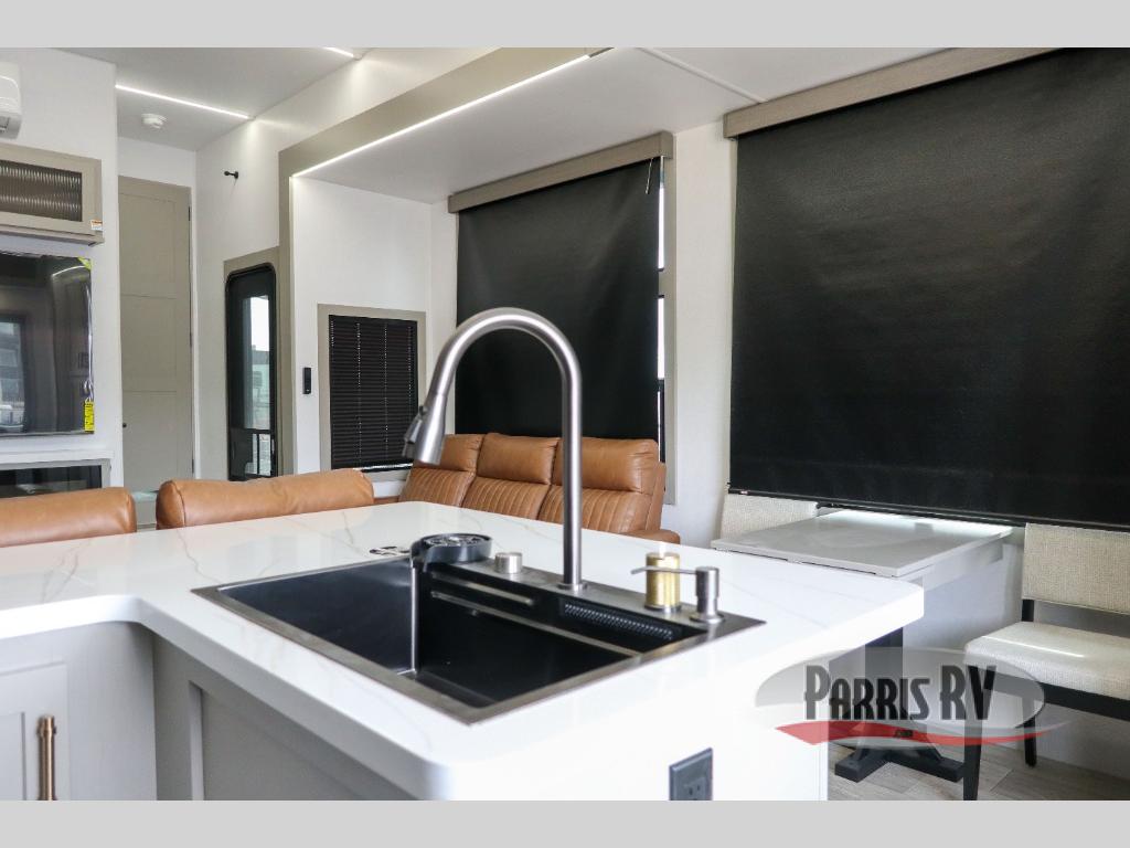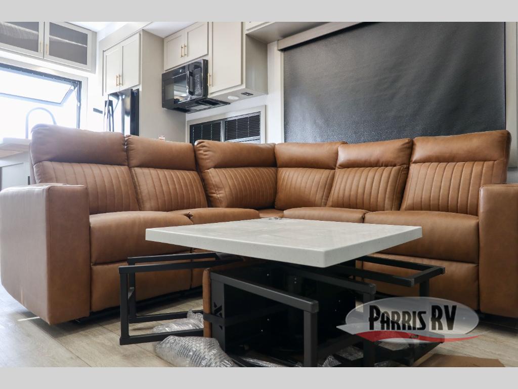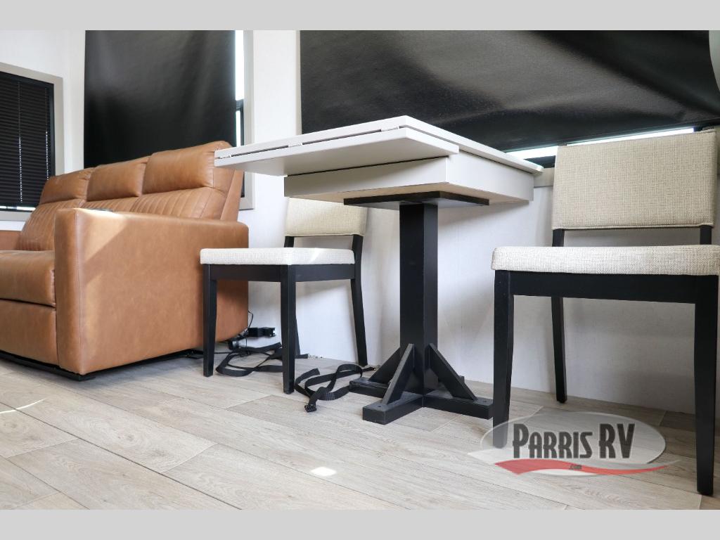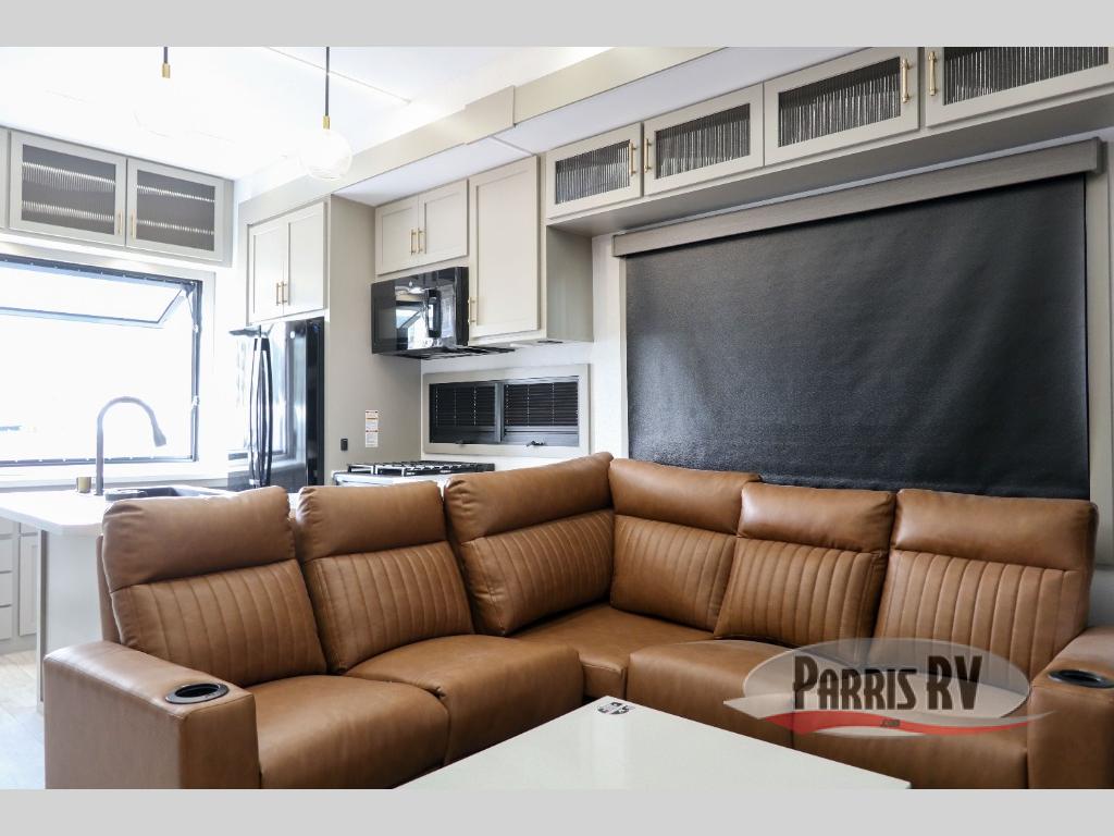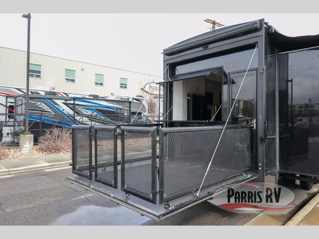 This fifth wheel with two patios is sure to be a hit! There is a rear patio that leads to the kitchen, where you'll also find a large countertop with stools, a spacious pantry, and all the appliances to make meals. The side patio leads right into the master bedroom, complete with a king bed tilt within a large slide out and a huge front bathroom. Here, you'll find dual bath sinks, a large closet and linen closet, a shower, private toilet, plus an optional washer and dryer. The middle living room will be a favorite place to hang out with its sofa, second, L-shaped sofa with a patent pending AX ottoman/table, plus 65" TV for movie nights!