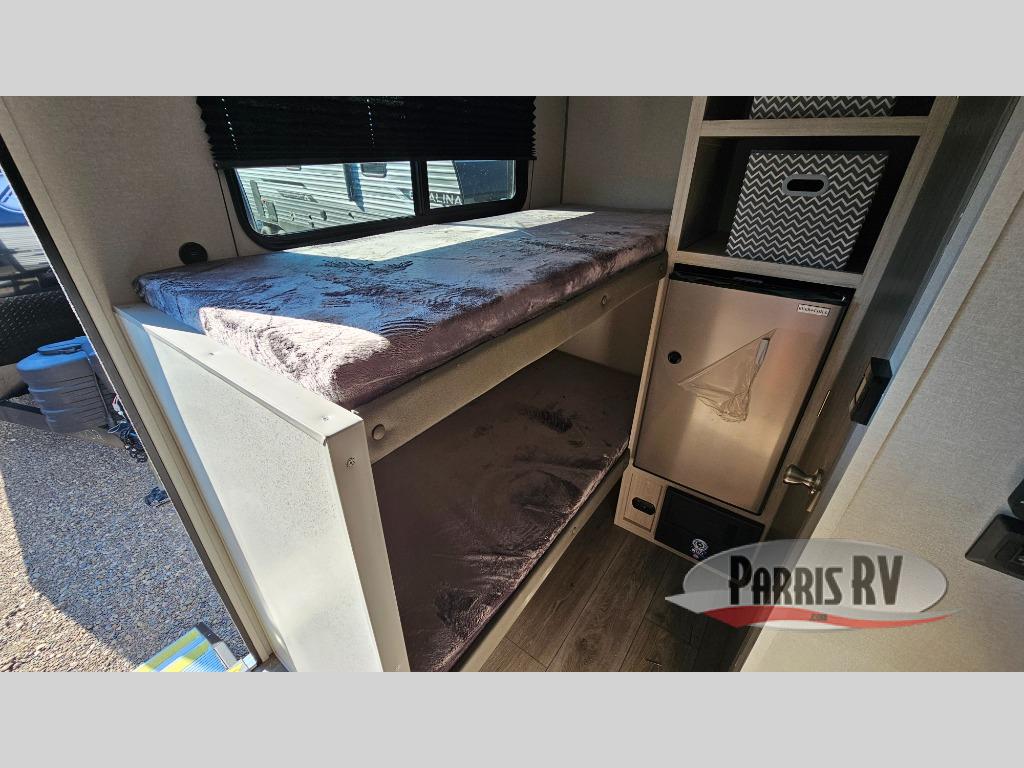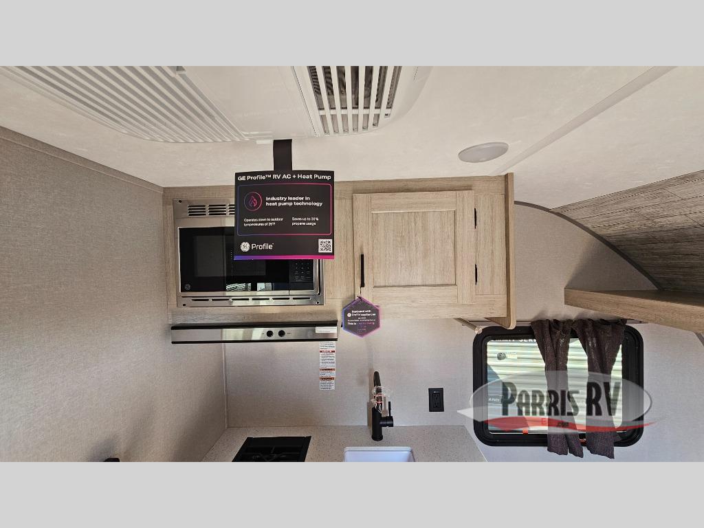 Lightweight camping is easier than you think with this travel trailer in tow! The front 54" x 74" queen bed will provide a great night's rest each night, while the little ones or your guests take the bunk beds. There is a handy shelf above the front bed for your belongings plus additional bedroom storage. A private bath includes a 24" x 32" shower and a toilet with a mirror behind it so you can freshen up each day. You'll also find a two burner cooktop and microwave oven to make meals each day plus a 3.3 cu. ft. 12V refrigerator for food storage!
