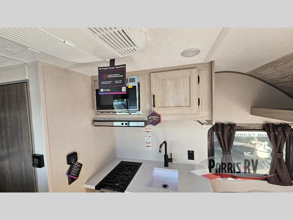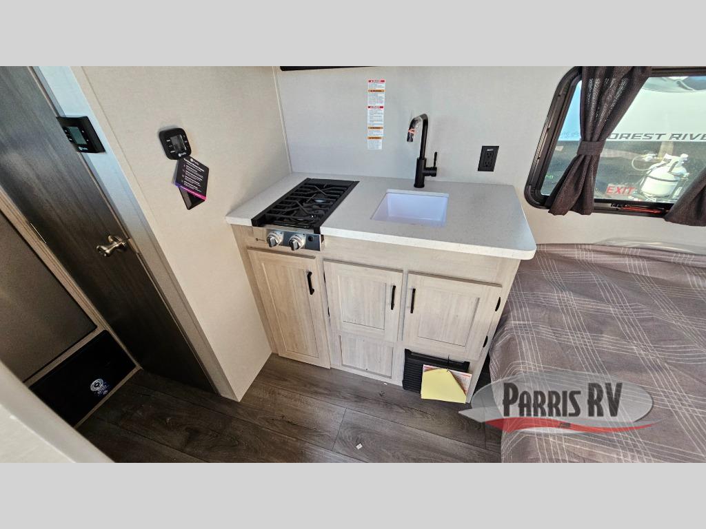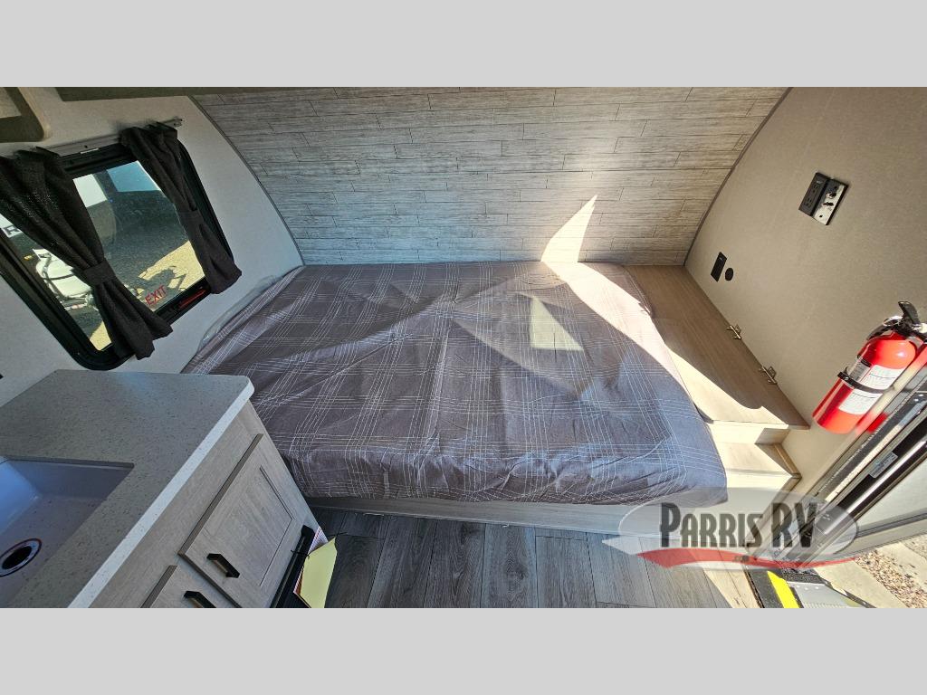 Lightweight camping is easier than you think with this travel trailer in tow! The front 54" x 74" queen bed will provide a great night's rest each night, while the little ones or your guests take the bunk beds. There is a handy shelf above the front bed for your belongings plus additional bedroom storage. A private bath includes a 24" x 32" shower and a toilet with a mirror behind it so you can freshen up each day. You'll also find a two burner cooktop and microwave oven to make meals each day plus a 3.3 cu. ft. 12V refrigerator for food storage!