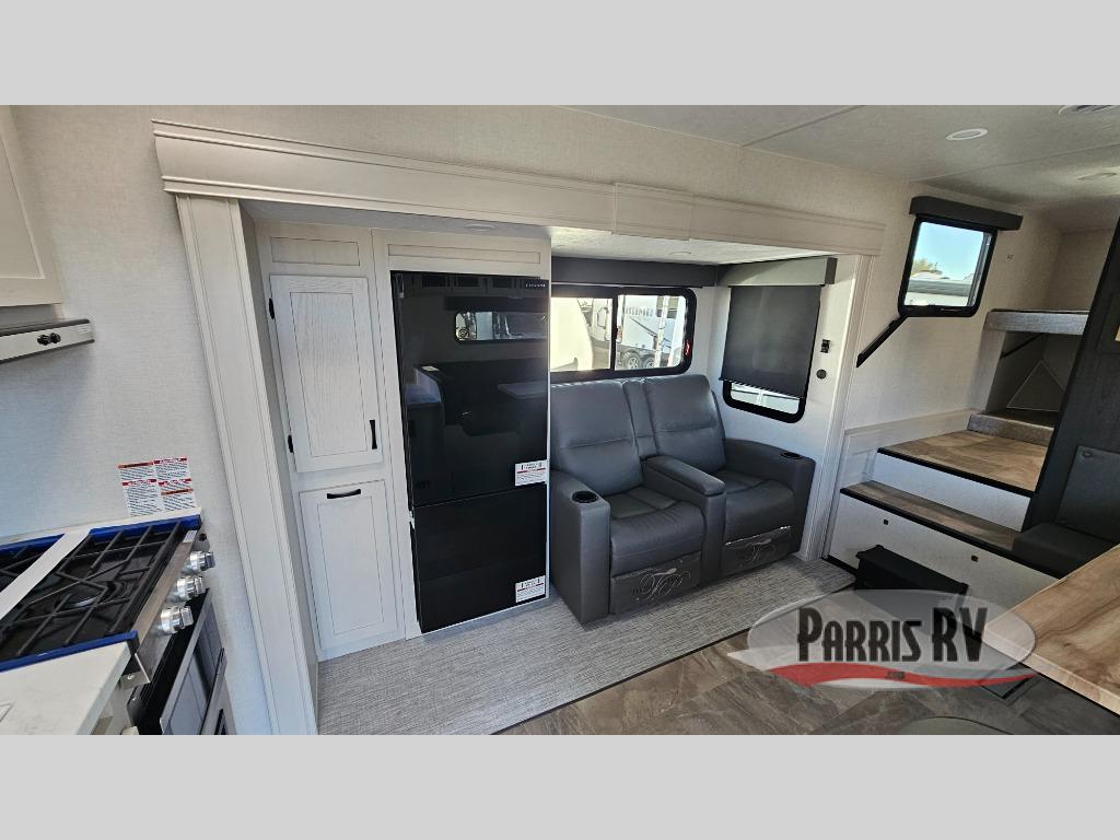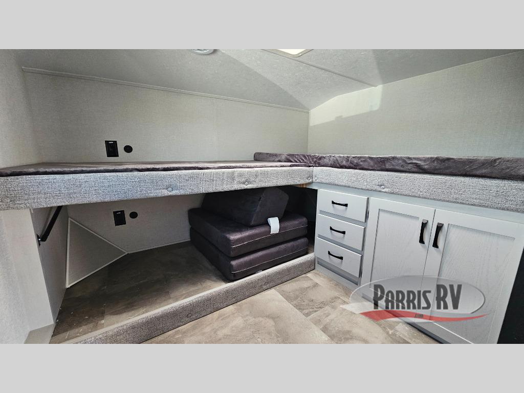 You'll love the amount of space you'll have in this fifth wheel thanks to the double slides! Once you arrive at the campground, you can start lunch in the full kitchen, then dine at the J-lounge with a table and bench seat. There is also theater seating within the living room slide for added space and comfort. Your guests can claim the front bunkhouse to themselves, which includes two bunk beds with a wardrobe below for clothes and shoes. The rear master bedroom will have you feeling right at home with a queen bed slide out and quick access into the full bath!