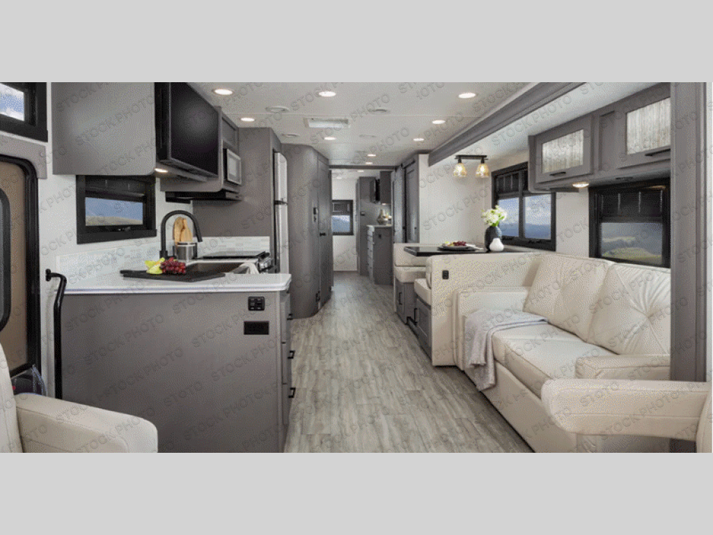 The whole gang will love this motorhome thanks to its drop-down overhead bunk, rear private bedroom, and 71" bunk/office/wardrobe space for versatility! Once breakfast has been prepared on the stainless steel three burner range, everyone can dine at the booth dinette or sit on the 63" sofa within the large slide out. There is a 40" LED TV across from the sofa for convenience, and you'll find two additional TVs; one in the bedroom and one outside! This model includes a full bath with a shower skylight, a retractable shower door, and a power bath vent to keep everything fresh. After you've gotten ready for the day, head outdoors to relax under the 17' power awning and watch the big game on the exterior TV!