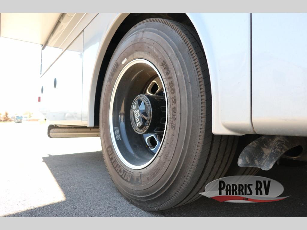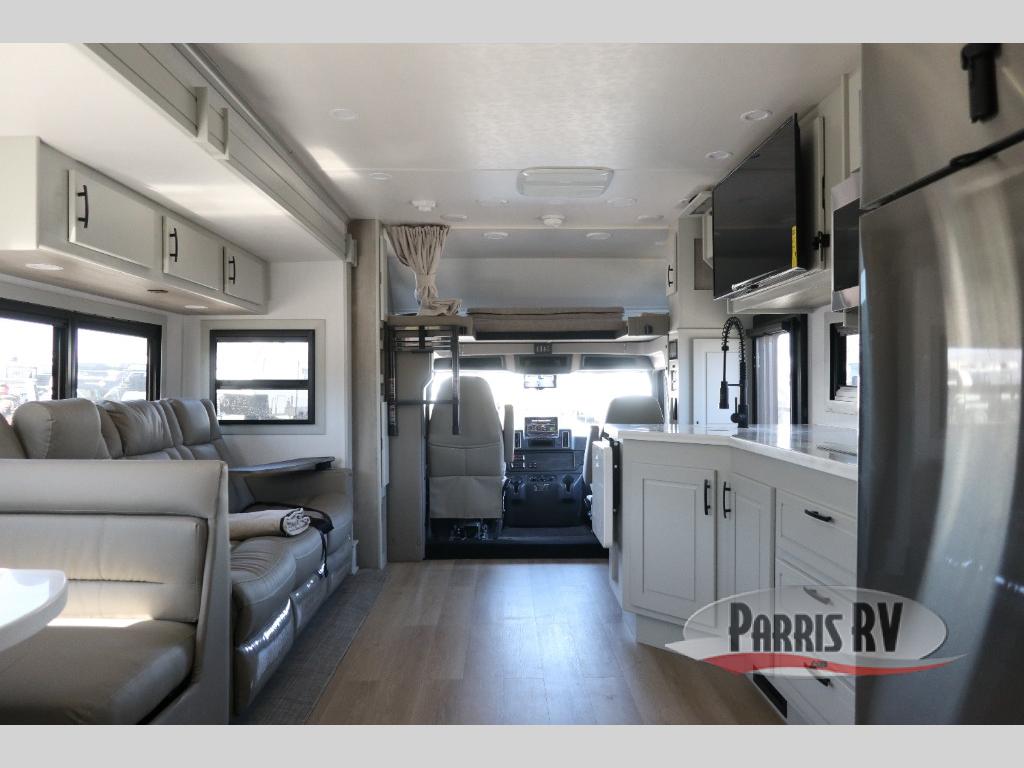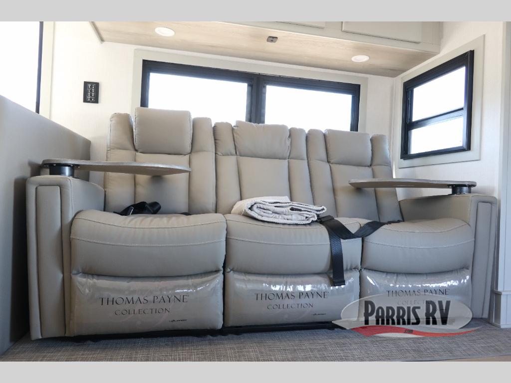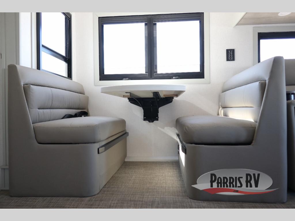 Check out the fabulous features found in this DX3 Super C diesel motorhome! As you spend your nights relaxing in the rear private bedroom, you will appreciate having a 32" LED Smart TV to watch before drifting off to sleep. The Solid Surface Shower Surround with glass door and skylight will be wonderful to see in the morning, and the Oxygenics Body Spa shower head will deliver an enjoyable experience. Step foot into the kitchen and be amazed by the home-like conveniences that have been included, like the residential refrigerator, the convection microwave, the pantry, and the under-cabinet lighting.