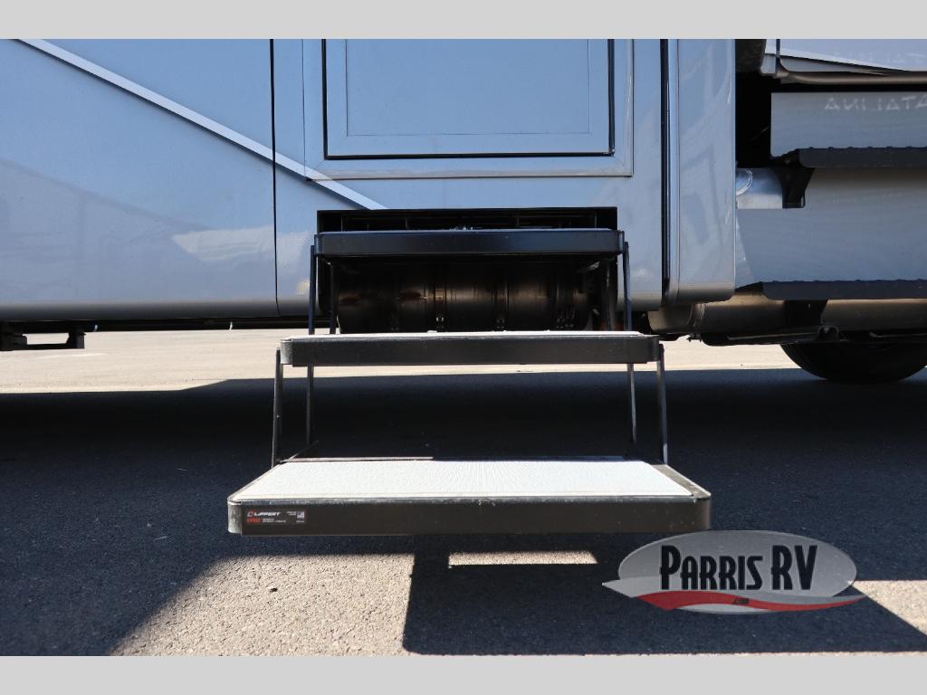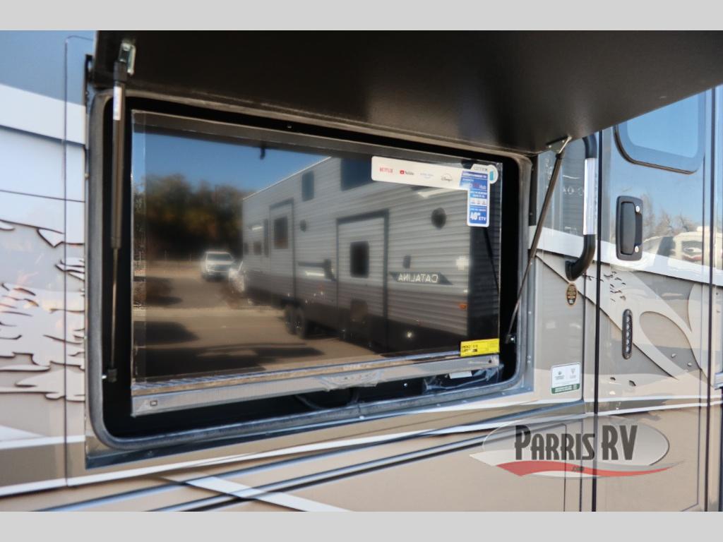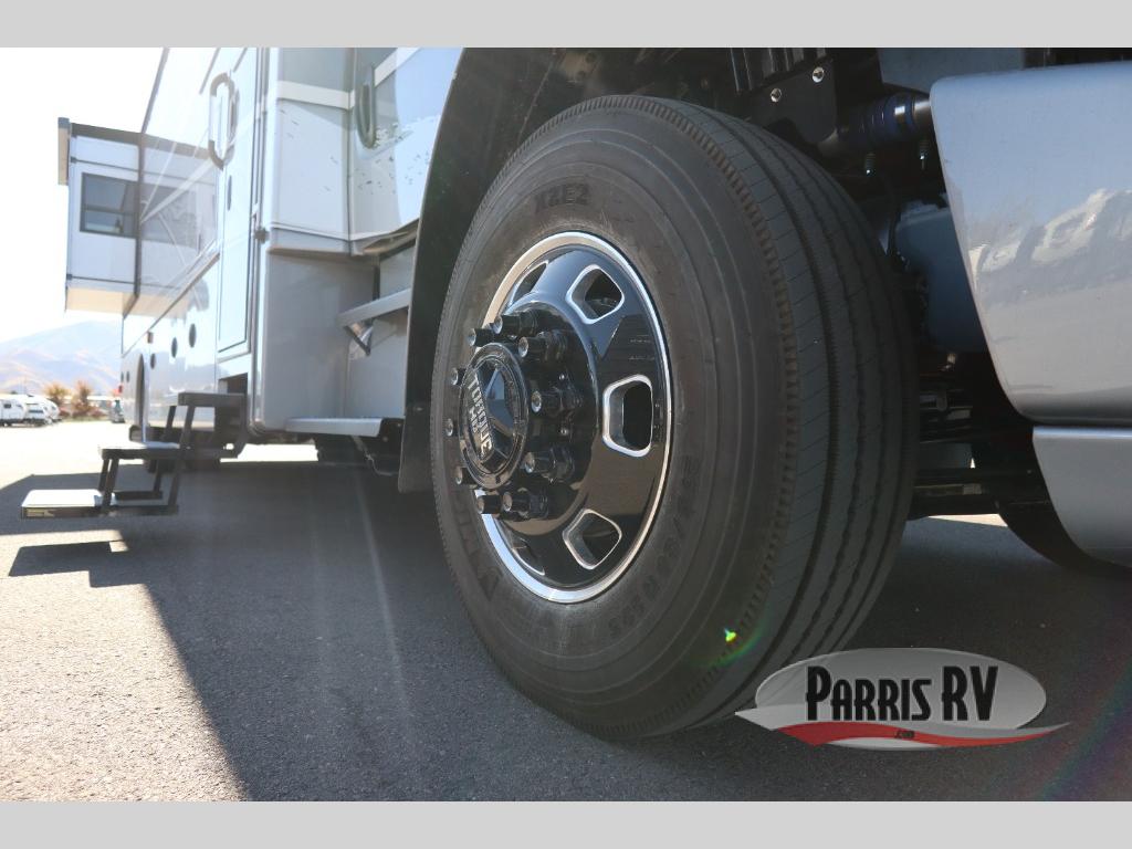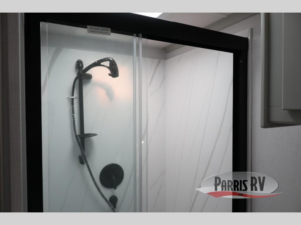 Check out the fabulous features found in this DX3 Super C diesel motorhome! As you spend your nights relaxing in the rear private bedroom, you will appreciate having a 32" LED Smart TV to watch before drifting off to sleep. The Solid Surface Shower Surround with glass door and skylight will be wonderful to see in the morning, and the Oxygenics Body Spa shower head will deliver an enjoyable experience. Step foot into the kitchen and be amazed by the home-like conveniences that have been included, like the residential refrigerator, the convection microwave, the pantry, and the under-cabinet lighting.