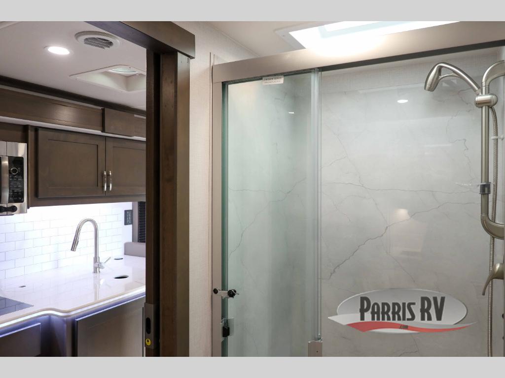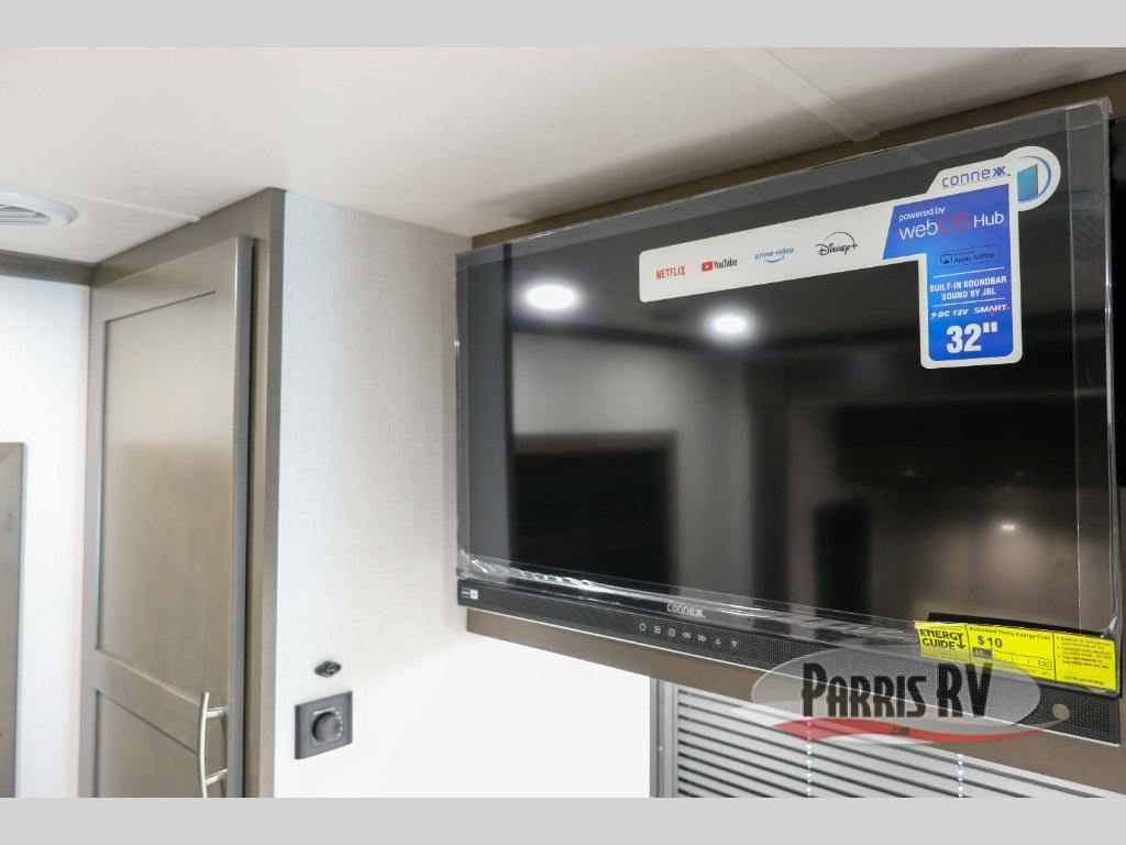 Whether you plan to go near or far, you'll stay comfortable in this spacious coach! There is a king bed slide out in the rear bedroom, plus dual wardrobes, dual nightstands, and your own 32" TV. Each morning, you can freshen up in the full bath that includes a glass shower door, then head to the kitchen for breakfast. There is a convection microwave, a gas range, plus a 16 cu. ft. residential refrigerator with an ice maker for convenience. The 64" sofa sleeper and Dream Dinette provide a place to dine, relax, and sleep additional guest, and you might want to add the cab-over bunk option for the little ones. Spend your evenings outdoors under the armless patio awning with LED lighting and watch a movie on the exterior 32" TV!