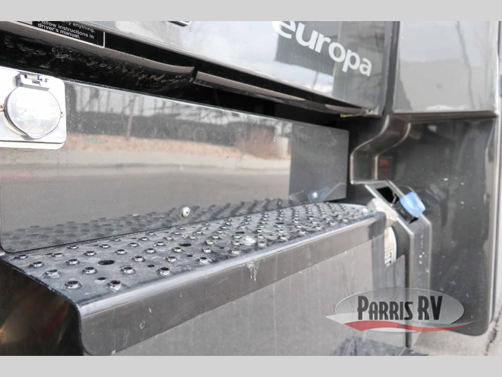 The Europa Super C diesel motorhome by Dynamax is coming to you with all the power, durability, and luxury you need for your adventurous lifestyle. You will love the solid surface countertop with LED edge lighting in the kitchen, the premium vinyl flooring throughout, and the clean, contemporary styling. The on-demand water heater is a luxury you won't want to travel without, and the multiplex wiring with a touch screen command center includes switch panels, and Bluetooth Smart Phone app control for ease of use. There are dual12V 8D AGM deep-cycle maintenance-free house batteries and a single 200-watt solar panel to go off-grid if you choose, and the 12,000 lb. trailer hitch will allow you to bring along the off-road toys. Some of the exterior features that make this coach great are the armless patio awning with LED lighting, the automatic four-point hydraulic leveling jacks, and the eye-catching custom full-body paint package!