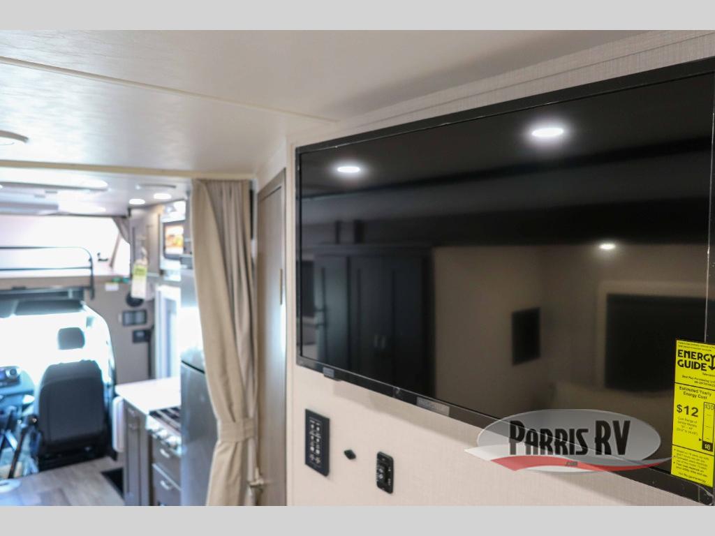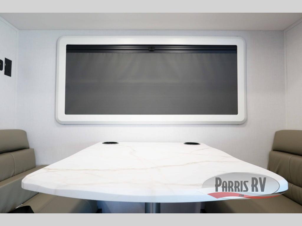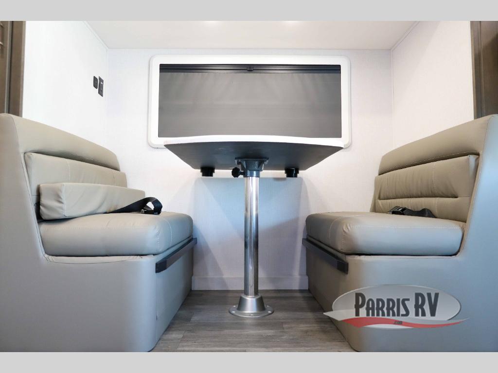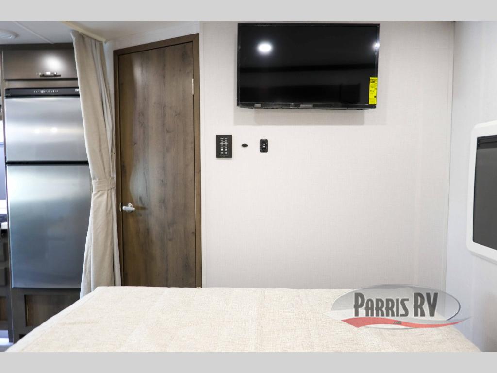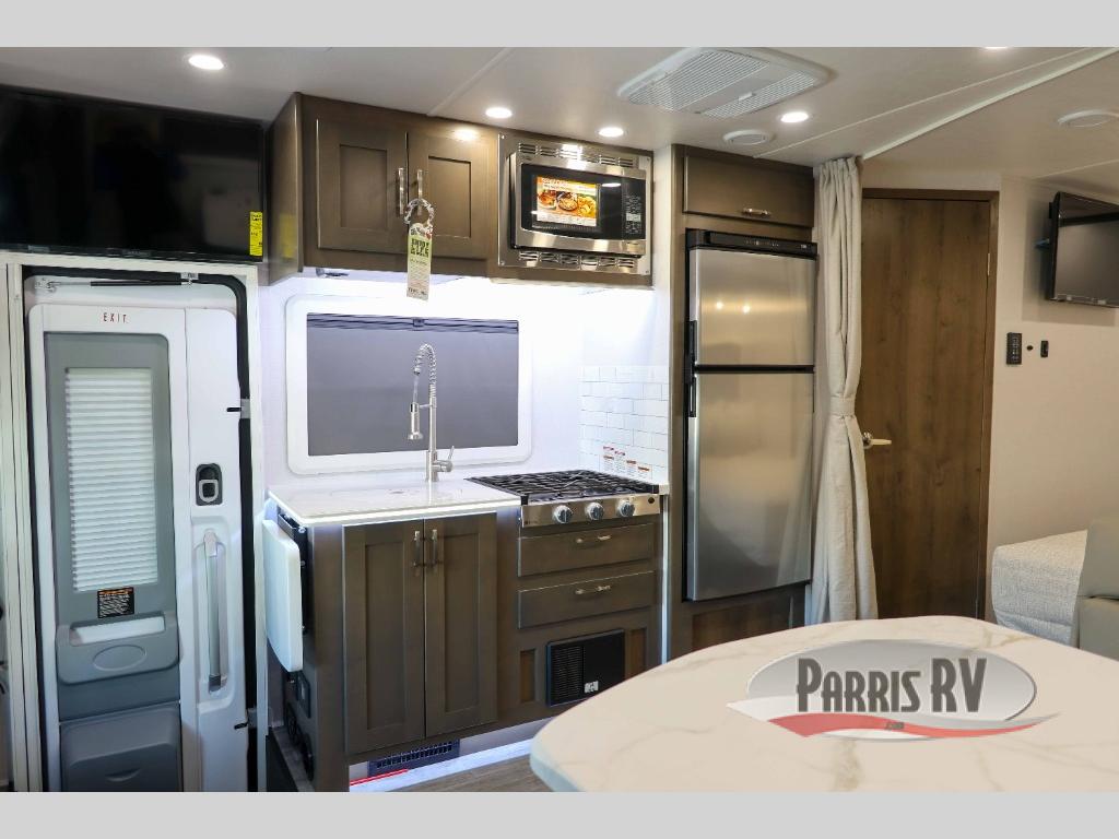 Take this motorhome on your greatest adventures yet! Start each morning feeling well rested after sleeping on the corner queen bed then head to the rear corner bathroom to freshen up in the shower with an Oxygenics body spa RV shower head and a skylight above for added headroom and natural lighting. Now that you're ready for the day, you can grab some eggs from the 8 cu. ft. two-door compressor-driven refrigerator and fry them up on the three burner cooktop, then enjoy them at the booth dinette. The kitchen also has a countertop extension for more meal prepping space and a convection microwave. This unit also includes a living room 32" LED Smart TV and a 32" LED smart TV across from the bed. You could even switch things up by replacing the booth dinette with an optional 3-seat power recliner, and adding a cab over bunk option!