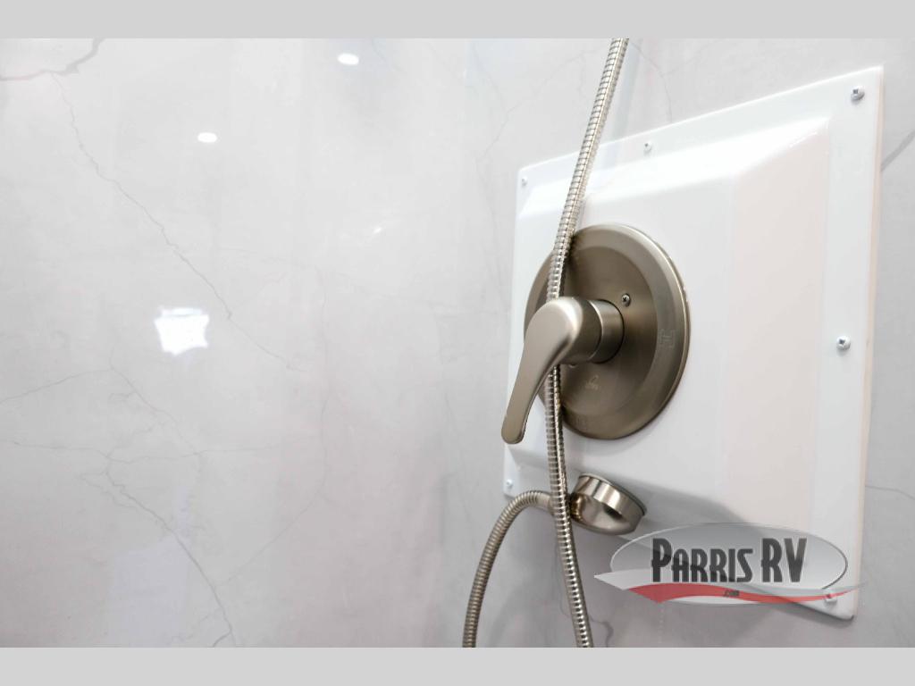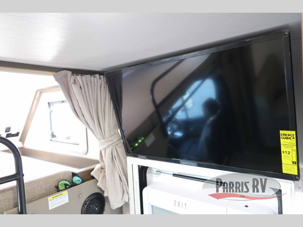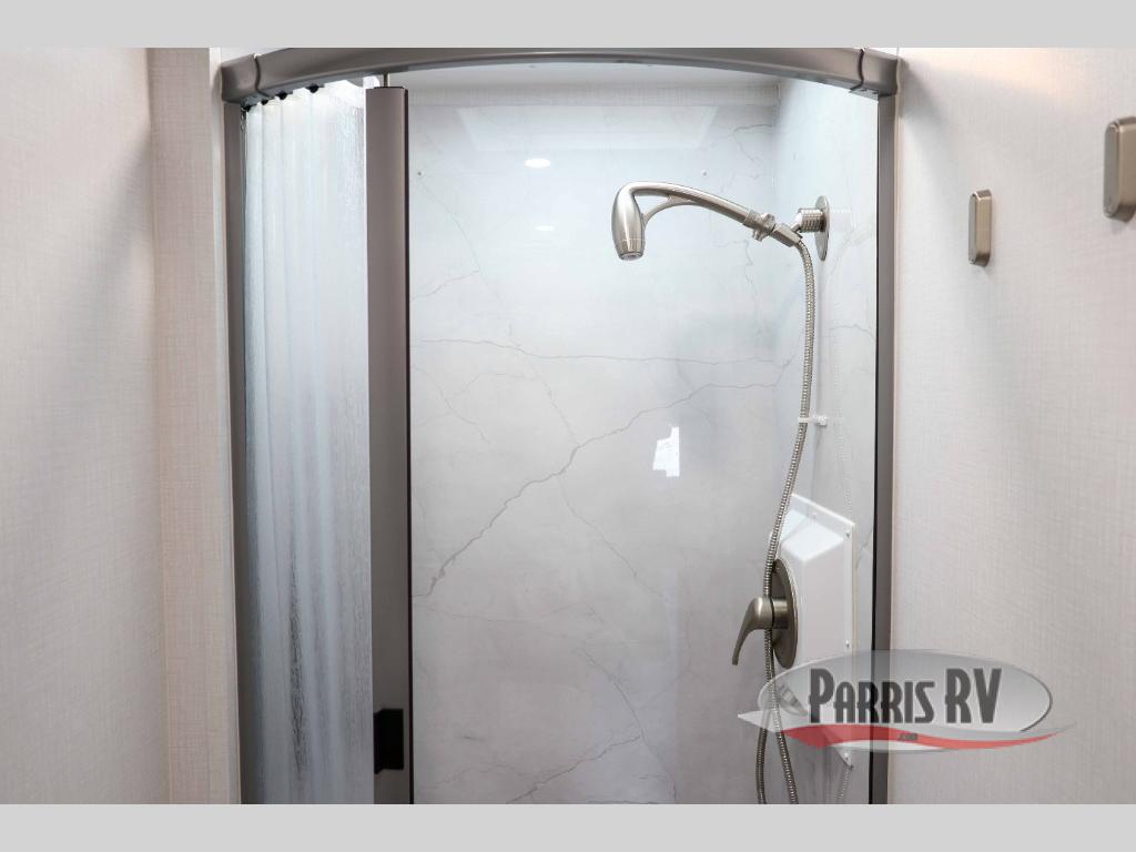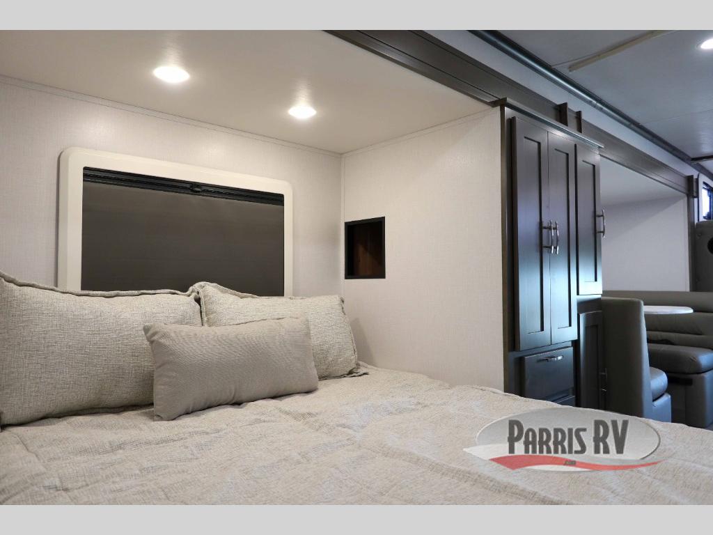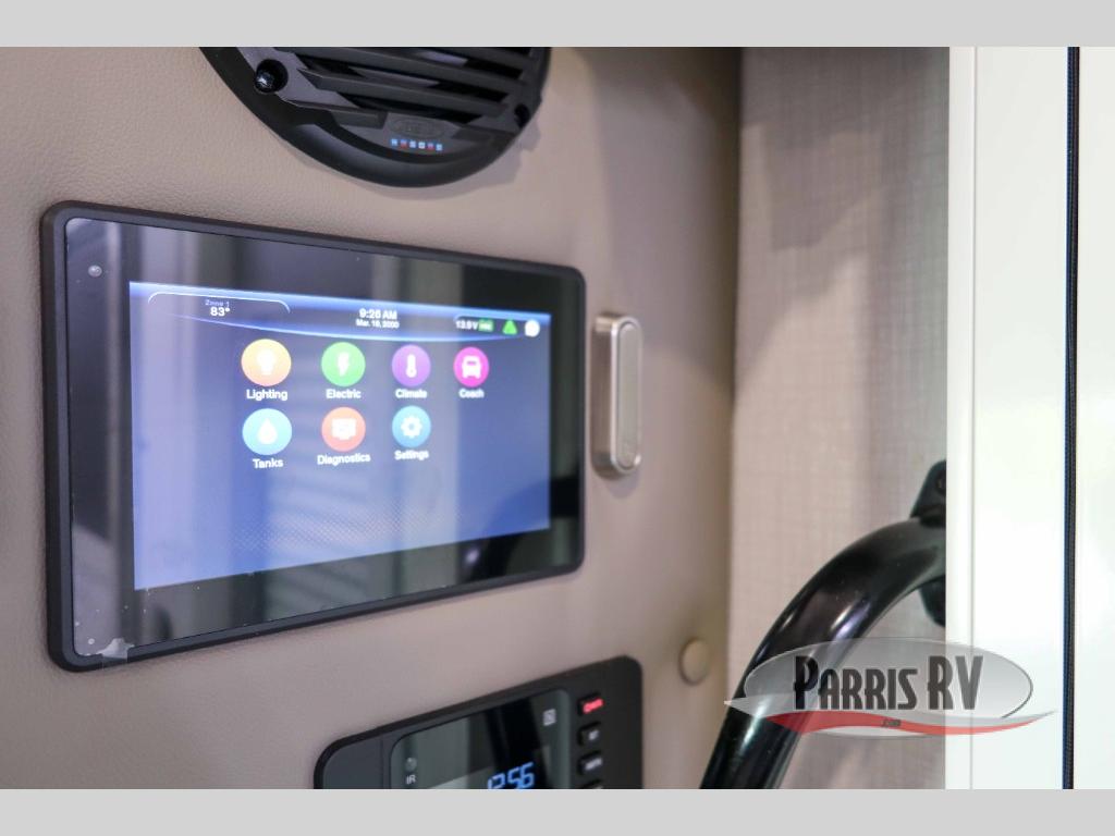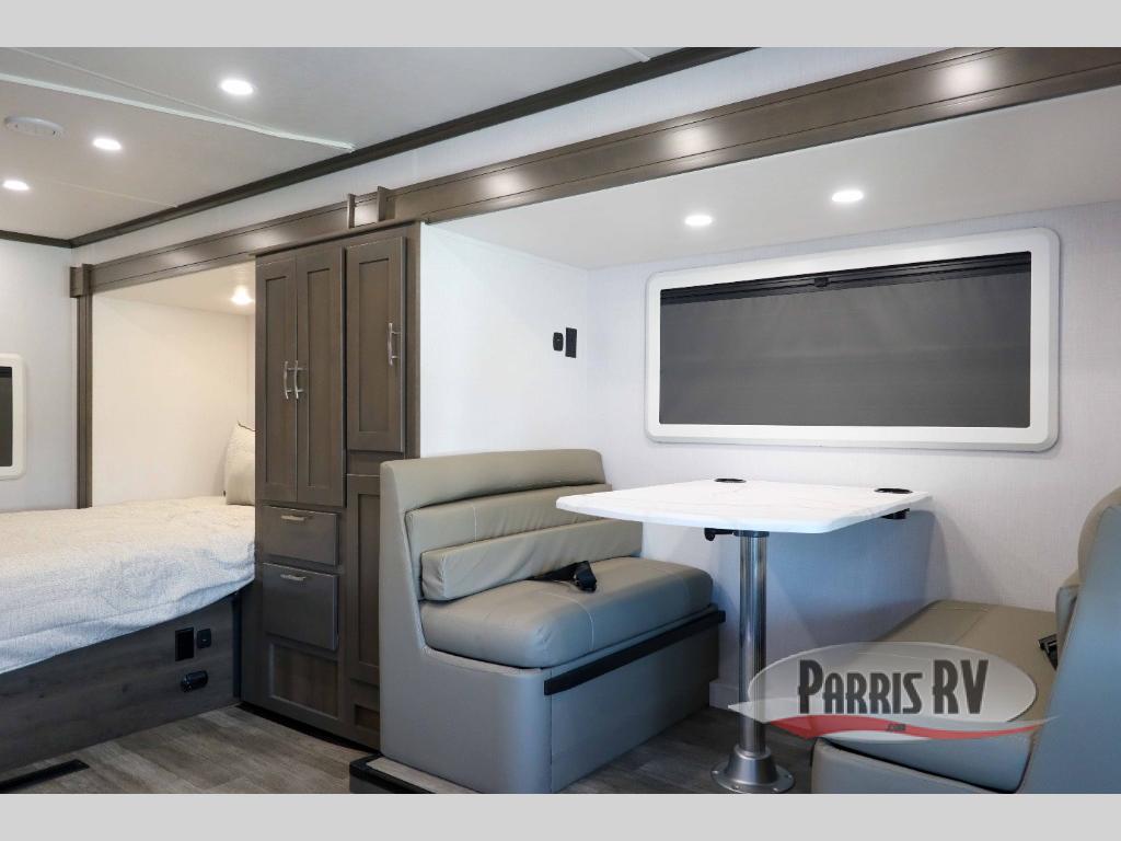 Take this motorhome on your greatest adventures yet! Start each morning feeling well rested after sleeping on the corner queen bed then head to the rear corner bathroom to freshen up in the shower with an Oxygenics body spa RV shower head and a skylight above for added headroom and natural lighting. Now that you're ready for the day, you can grab some eggs from the 8 cu. ft. two-door compressor-driven refrigerator and fry them up on the three burner cooktop, then enjoy them at the booth dinette. The kitchen also has a countertop extension for more meal prepping space and a convection microwave. This unit also includes a living room 32" LED Smart TV and a 32" LED smart TV across from the bed. You could even switch things up by replacing the booth dinette with an optional 3-seat power recliner, and adding a cab over bunk option!