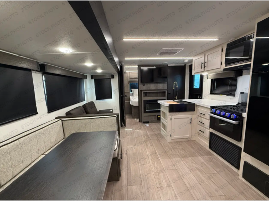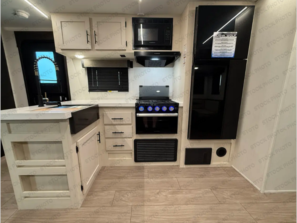 Looking for a spacious travel trailer to sleep nine or ten happy campers? You've found it in this Cherokee Alpha Wolf model with a handy outside kitchen, a bunkhouse with a dinette, a front private bedroom, and a large slide out! The main living and kitchen area has a U-shaped dinette to utilize as a dining table, game table, work station, and/or an extra sleeping space. There is also a jackknife sofa for seating, TV watching, or sleeping. From any seating area you can easily view the entertainment center and fireplace which is centered in the unit with doors on either side to the front private bedroom. You will also find a nice pantry and full kitchen amenities including a large sink, and residential-style refrigerator allowing you to easily create meals for your hungry crew. The exterior provides an 18' awning for an outdoor living area over the outside kitchen, and there is ample exterior storage for all of your camping gear like camp chairs, outside games, rugs, and more.