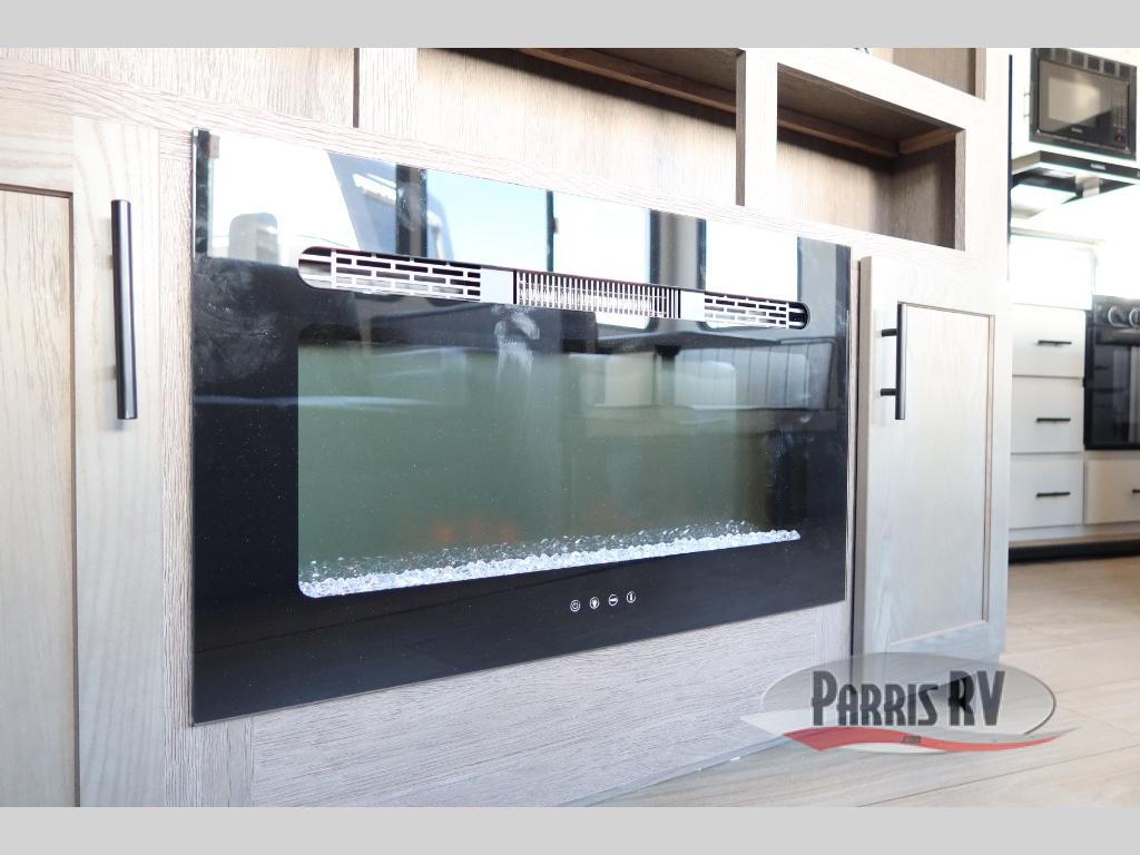 There's not much about this fifth wheel that you won't love! Your guests can claim the rear bunkhouse suite with a 54" x 74" bunk/bed, a 60" x 80" loft bunk, and a half bath for added convenience. You'll have the front private bedroom all to yourselves, and the spacious full bath is close by for easy nighttime use. Everyone can meet in the combined kitchen and living area that is made open thanks to the dual opposing slides. There is also a kitchen island with a trash can, a hutch, a booth dinette, and a tri-fold sofa across from the fireplace; how cozy!
