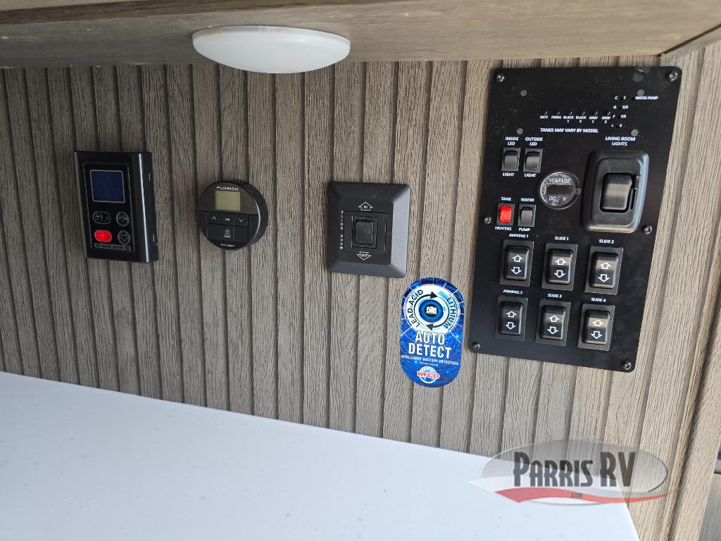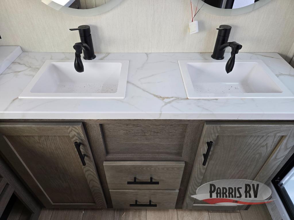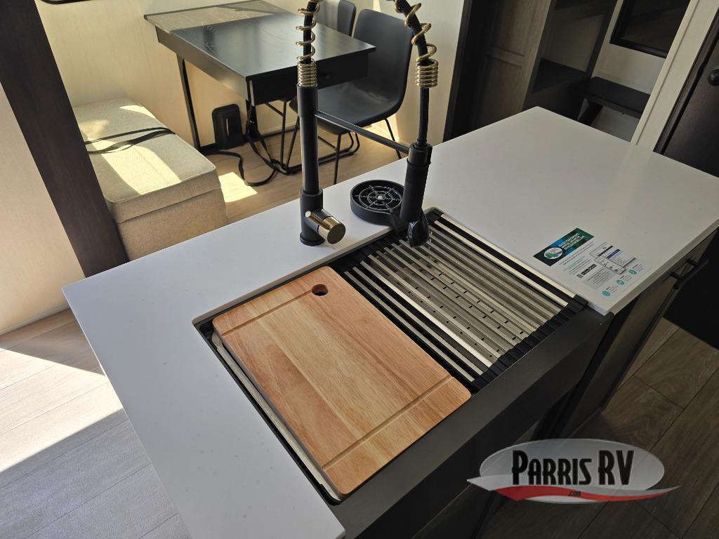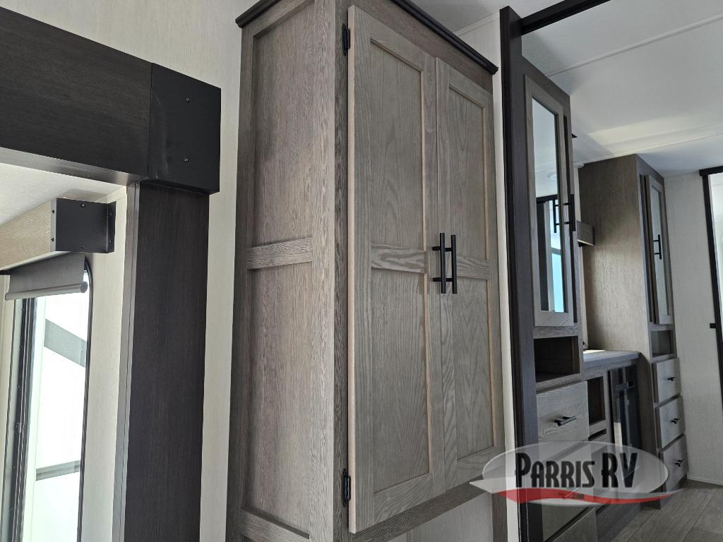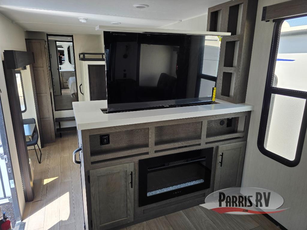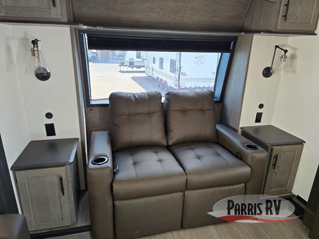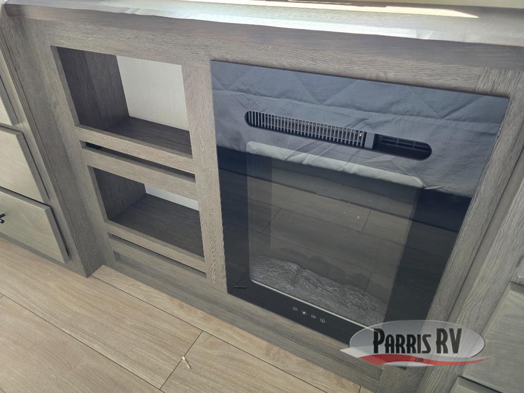 Five slides, a bath and a half, plus sleeping space for six make this fifth wheel the perfect choice! Once you arrive at your destination, prepare lunch on the exterior kitchen. Inside, you'll find a kitchen island, plenty of storage space, plus a free-standing table with chairs and a storage ottoman seat. The front living area will be a favorite place to hang out and this room can double as a bedroom with the two tri-fold sofas. There is also theater seating across from the entertainment center and fireplace, plus storage cabinets for movies or board games. When you're ready to call it a night, head to the master bedroom for a great night's rest on the king bed slide out. You will also love the full rear bath with dual sinks, a spacious shower, plus a closet with stackable washer and dryer prep!