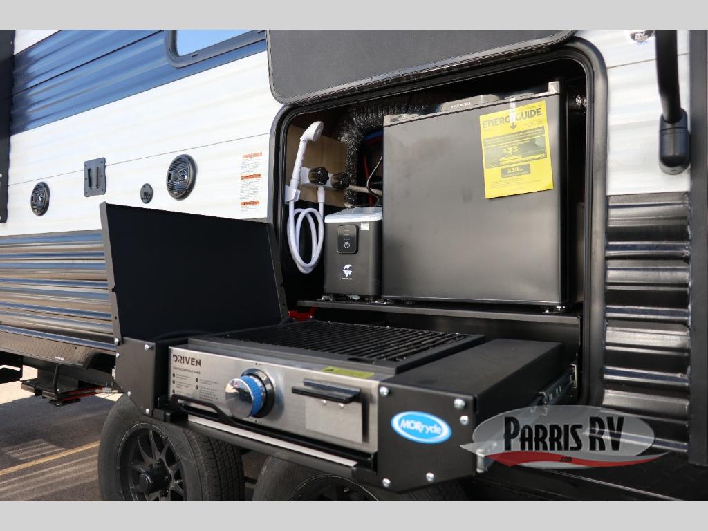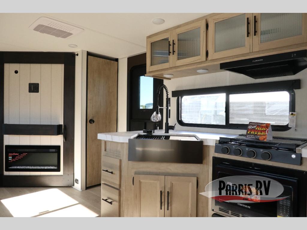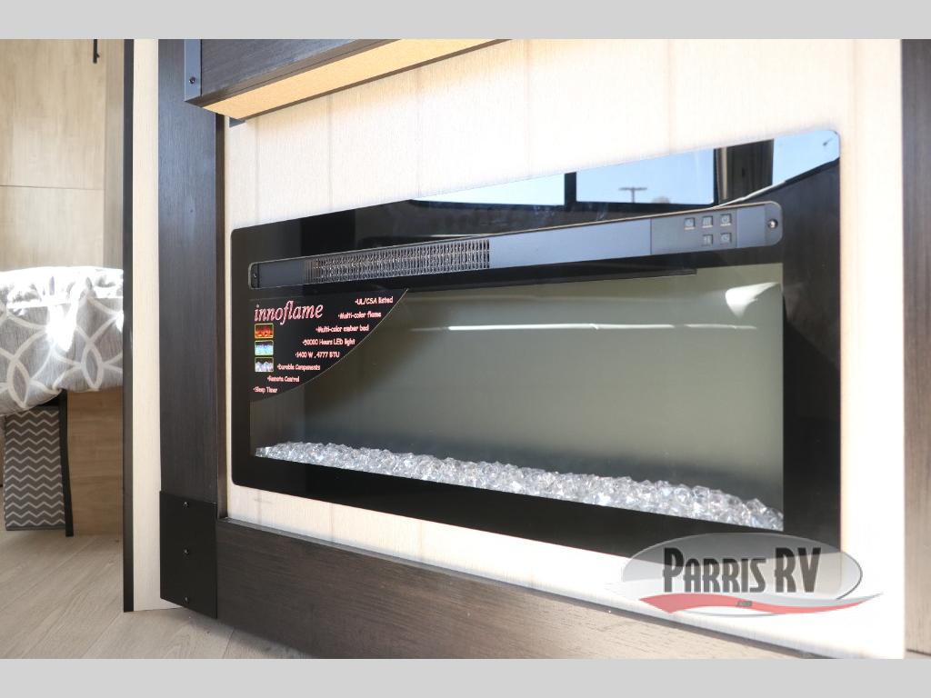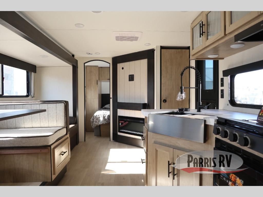 If you've been searching for a travel trailer with a larger sleeping capacity to camp with friends, this is the one! There are double-size bunks in the rear corner, and the full bath with its own exterior entry door is in the other rear corner for easy nighttime use. Up front, an RV king bed in the private bedroom is sure to bring a great night's rest, and you'll find a bedside wardrobe to keep your clothes picked up off of the floor. In the morning, everyone can meet in the main living room that includes a large slide out, U-shaped dinette, sofa, and a fireplace with a hidden pantry behind it for smart storage solutions. An outside kitchen will allow you to get some fresh air as you make dinner, but there's also a full interior kitchen if the weather isn't cooperating. Additional outdoor features include a rear storage rack, an outside TV mount, and a 15' awning for some shade!