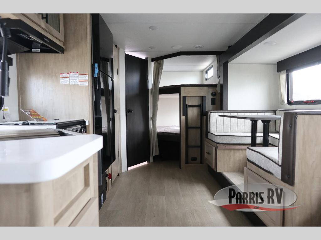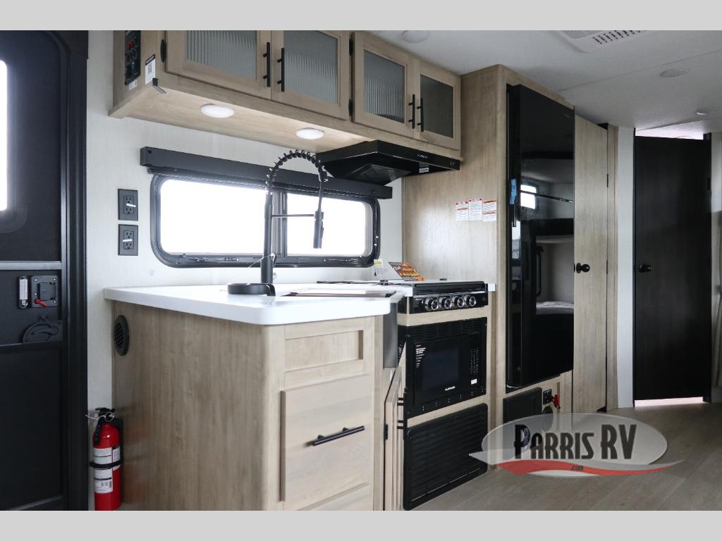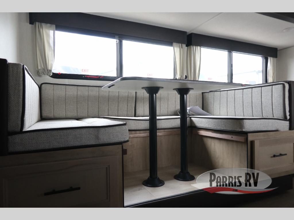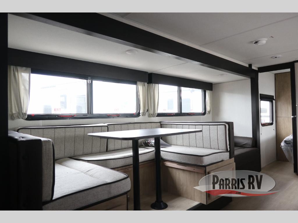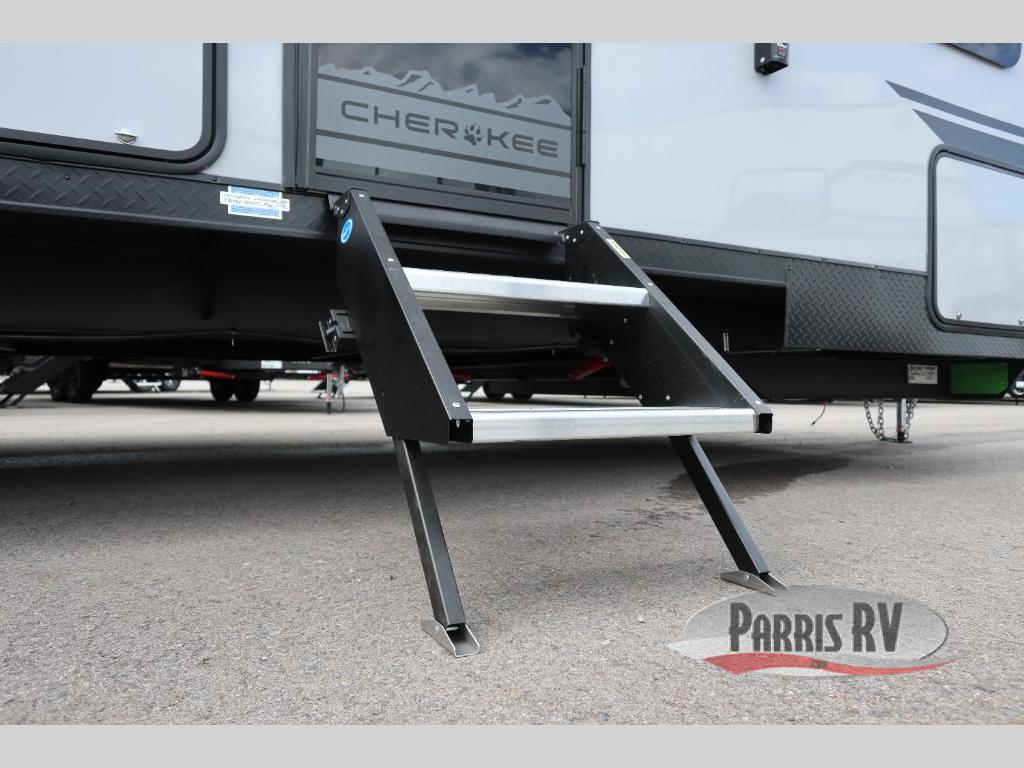 Come on inside this Cherokee Grey Wolf Black Label travel trailer and experience the convenience of a smooth flow of traffic in and out with two entry doors. The rear door leads into a full bath which is great for accessibility when outside and when you need to use the bathroom. Once inside, you will notice the large U-shaped dinette and the sofa which sit on the slide and create a spacious footprint for moving about, as well as great places to play games and socialize with your friends and family. A large pantry provides plenty of storage allowing you to stock up on your favorite snacks and dry goods for your family adventure. At night, there is sleeping space for everyone between the double-size bunks and the RV king bed, plus the furniture.