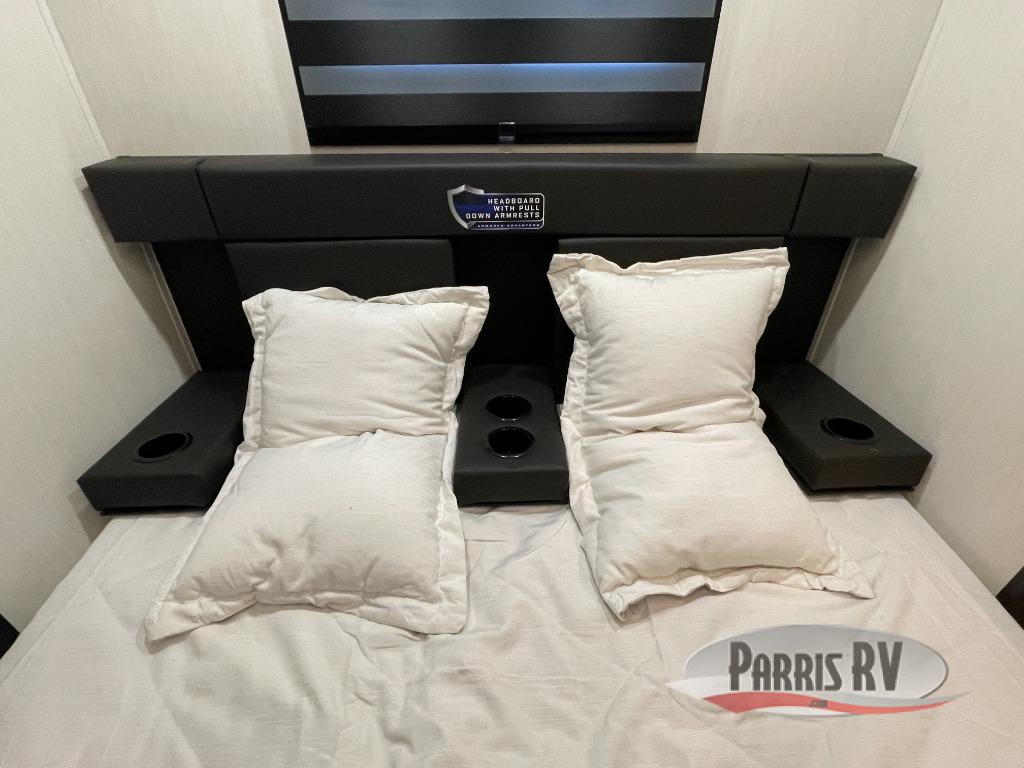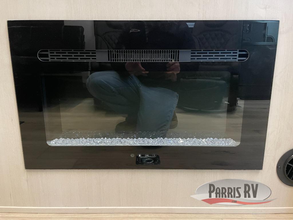 Head for the trails with this toy hauler in tow! Once your toys are unloaded from the 14' 1" garage, you can relax on the dual flip-up sofas with a queen bed above. There are also optional dual lounge chairs across from the entertainment center with a cozy fireplace! The chef of your crew can make meals inside on the three-burner cooktop, or head outdoors to utilize the outside kitchen. When you're ready to call it a night, retreat to the front private bedroom for a great night's rest on the trailer king bed slide out. There is also a large dresser here to keep your things organized.