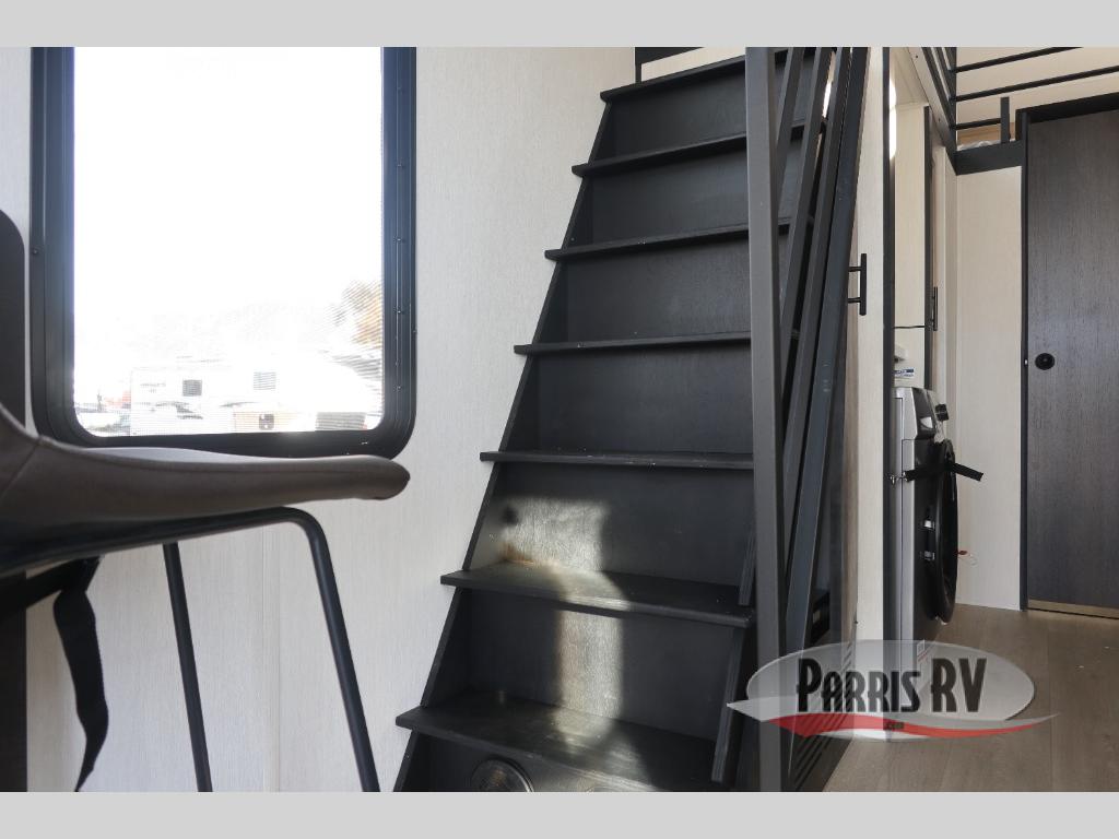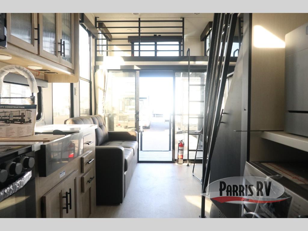 This model is similar to 16ML but larger! A bigger bathroom, RV king bed in the lower master, and a queen bed plus a twin bunk mat in the front loft. And the second loft can be utilized as extra sleeping space or storage space! There is an 18 cu. ft. refrigerator so you can stock up for a week long vacation, a hide-a-bed sofa that can transform into added sleeping for guests, and a high top table with two stools to dine at. The bathroom below is split with a shower on one side, and a private toilet area and sink opposite. And the view is amazing from just about anywhere inside.