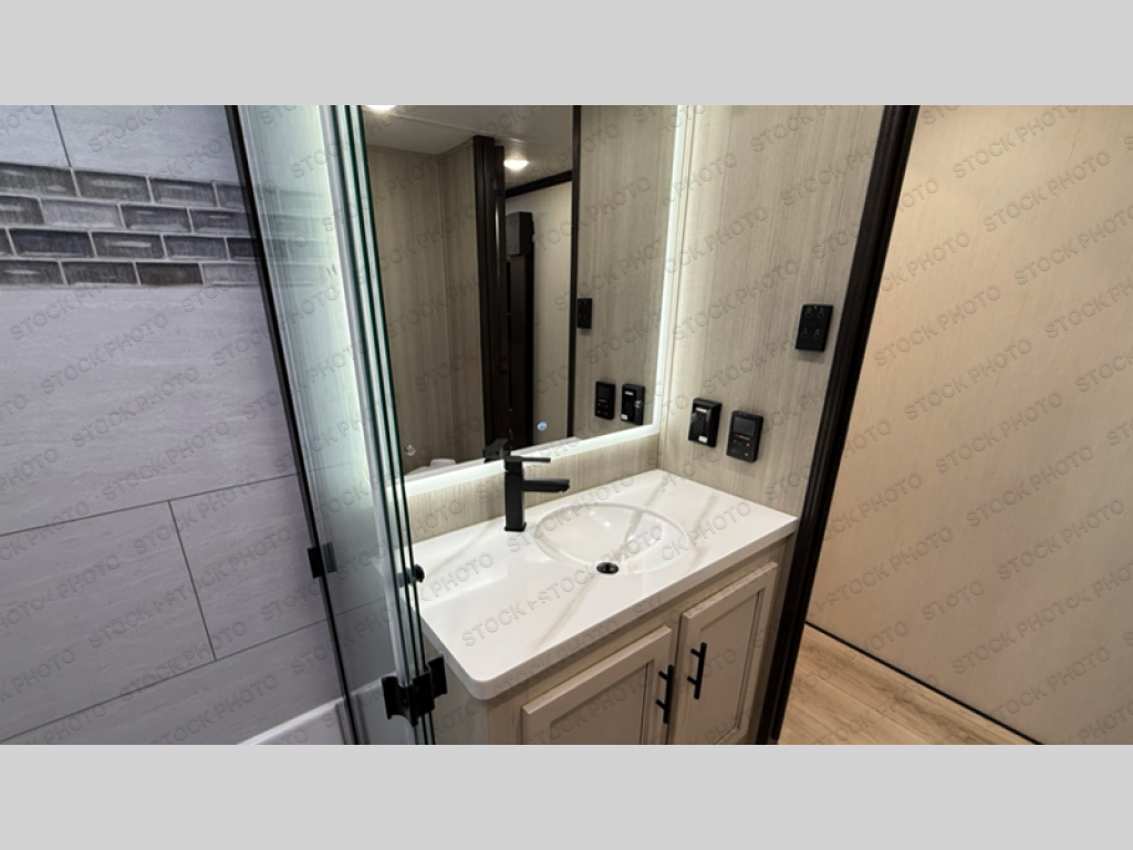 Make each adventure count in this spacious toy hauler for eight! Once you've unloaded the toys from the 13' separate garage, you can utilize the two flip-up sofas with a queen bed above. There is also a half bath here and a ladder leading to the loft! The main living area includes an L-shaped sofa across from the LED flatscreen TV and fireplace, allowing you to have movie nights, and the full kitchen includes ample counter space to set out snacks. A residential style four-burner range and residential size microwave will let you make meals for your crew every day, and there is a pantry plus 12V refrigerator for food storage. You're sure to appreciate the dual bath sinks in the full bath, and you'll feel right at home in the front private bedroom with a king bed slide, dresser, and front wardrobe.